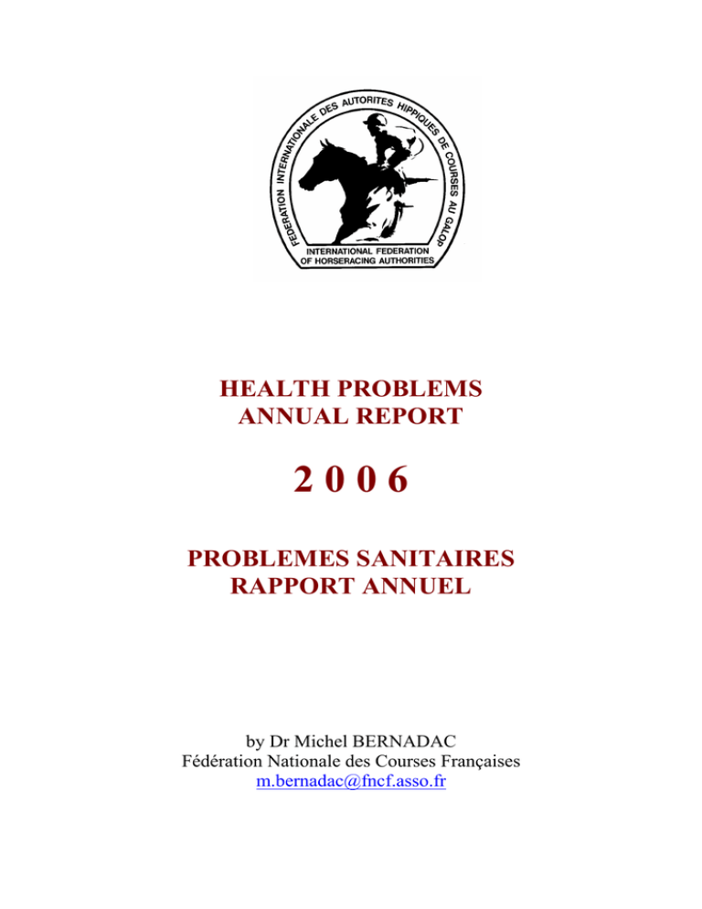 HEALTH PROBLEMS ANNUAL REPORT 2006 PROBLEMES SANITAIRES RAPPORT ANNUEL by Dr Michel BERNADAC Fédération Nationale des Courses Françaises [email protected] HEALTH QUESTIONS This report on health and medical questions is based on the answers to the questionnaires received from 47 countries (40 in 2006). The aim of such a questionnaire being to provide a periodical overview of the health situation in racing, the results are presented as such, without any comparison with those of the previous year. They are reproduced in full (except in the case of major errors) in the appended tables The two-page questionnaire inaugurated last year provides more space for the answers. The reference period concerned (1 July 2006/ 30 June 2007) is clearly specified, which helps the countries concerned to provide comparable and updated information. We wish to point out that, in some cases, no answer has been provided in the "Health situation" table concerning abortive rhinopneumonitis: this is partly due to the fact that this item was not always clearly visible on the questionnaire itself. If we want this report to remain a source of information of the best possible quality, all members must fill in the questionnaire which is sent every year to each Federation member by the Secretariat of the International Federation of Horseracing Authorities, bearing in mind that this questionnaire may be updated according to requests and circumstances. Once again, some of the items proposed have not received any answer. Whatever the causes (omission, ignorance, repetitiousness of the task, problem with understanding questions...) the objective of yearly updating suffers from such a situation. In view of the very specific characteristics of this health dossier, it is up to the person in charge of these questions in each country to fill it in and provide the answers to the questions asked. If necessary the persons in charge can use the information contained in the declarations forwarded by individual governments to the Office International des Epizooties but they cannot merely refer to them. As happened last year, it seems that the difference between a case that has been "detected or reported" (in particular by a veterinarian and/ or laboratories) and a case that has been "notified" (because the health authorities of the countries concerned so require) has not been understood correctly. Such a difference shall be maintained in future reviews with, possibly, either a reminder as to the meaning of such notions or an amendment to the text of the questionnaire itself. We can only hope that in the future the blank questionnaire will reach the person who (hopefully at least) is in possession of the relevant information concerning each item. We also hope that this person (as this is the case in the majority of cases, we are happy to note), even though one year may look like a repetition of the previous year, will accept to fill it in systematically every year, clearly, legibly and in the boxes or lines provided so as to avoid any risk of misinterpretation. The e-mail procedure has three advantages: the person in charge is clearly identified, communication is easy if things are not clear and changes may be introduced if necessary in box dimensions for instance. 2/41 In view of the relatively high number of answers received in 2001, it had been decided, for the sake of brevity, to mention in the medical report, only those countries which had answered. Then it was decided to use the list and the various tables contained in the 2001 version of the questionnaire as permanent frame for future years, which has been very helpful, particularly when late answers come in but which can also be difficult to deal with when no replies are sent (cf. this year). In 2007, several racing countries (among the most important ones, which generally answer promptly) did not provide any reply. But we are also happy to note that several countries did transmit that information for the first time As in previous years, in the absence of answer, the relevant boxes have been left blank. But when a totally blank sheet was returned (one may wonder about the interest of sending it back) or an item was left blank or an unclear answer was received, we have written "Sans precision / Without Precision" (SP/ WP). In order to facilitate reading and use of the medical report, the five usual headings have been taken up again. LIST OF VETERINARY SURGEON EPIDEMIOLOGIST Health information can be obtained from - Official Veterinary Services: - Veterinary surgeons attached to the Racing Institution: - Veterinary surgeons (no detail provided) - Veterinary Hospitals or Universities: - Epidemiologists Veterinary practitioners (attached to the racing Institution or to Universities) 9 countries, 25 countries, 1 country 5 countries, 4 countries, Three countries did not give any reply under this heading. As already suggested last year, it would be useful, in particular for a faster exchange between the persons in charge of the medical follow-up, that this heading be systematically and accurately filled in, and that an electronic address and/or a mobile telephone number be given. 3/41 QUARANTINE Answers concerning individual countries’ policies regarding horse quarantine are summarized hereafter: At import: - No reply: 5 countries - No quarantine: 8 countries - Quarantine for all horses, without indication of duration: 13 countries (except if they come from certain countries) 1 country - Quarantine for all horses, with indication of duration: 6 countries - Quarantine according to country of origin, no information given on duration : 12 countries with indication of duration 2 countries At export : - Quarantine, no information given on duration: 7 countries - Quarantine with indication of duration: 6 countries - Quarantine according to country of destination: 13 countries - No quarantine 11 countries - No reply 10 countries. VACCINATIONS Vaccinations are compulsory in 38 countries. S