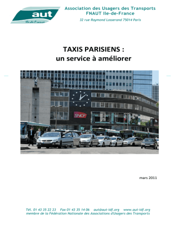 Association des Usagers des Transports FNAUT Ile-de-France 32 rue Raymond Losserand 75014 Paris TAXIS PARISIENS : un service à améliorer mars 2011 Tél. 01 43 35 22 23 Fax 01 43 35 14 06 [email protected] www.aut-idf.org membre de la Fédération Nationale des Associations d'Usagers des Transports Association des Usagers des Transports FNAUT Ile-de-France 32 rue Raymond Losserand 75014 Paris TAXIS PARISIENS : un service à améliorer Les taxis sont un complément des transports collectifs. Chacun d'entre nous (sauf exceptions) a fait appel à eux un jour ou l'autre, pour un déplacement familial, ou utilitaire, ou de confort… Il convient donc de soutenir et développer, au même titre que l'autopartage, cet autre mode de transport partagé, qui est, de fait, un service public… Remplissent-ils efficacement ce rôle ? La réponse de nombreuses personnes interrogées est : doivent faire beaucoup mieux. Même en agglomération parisienne où ils sont pourtant beaucoup plus présents que dans les villes de province, des efforts importants doivent être consacrés à améliorer le fonctionnement, la visibilité et l'attrait des taxis. 1 - TAXIS EN FRANCE ET TAXIS PARISIENS Des règlementations qui diffèrent Selon la définition donnée par la Direction Générale de la Concurrence, de la Consommation et de la Répression des Fraudes, un taxi est "un véhicule de neuf places au plus assurant le transport de personnes et leurs bagages à titre onéreux". On compte aujourd'hui environ 53000 taxis en France, dont 16600 opèrent à Paris et en proche couronne sous le régime des "Taxis parisiens" (1100 étant utilisés "en doublage", c'est-àdire par deux chauffeurs se relayant sur les 24 heures de la journée). L'autorité de tutelle (voir ci-après) délivre des autorisations de stationnement ou "licences" selon un contingentement annuel, un lot étant attribué à des chauffeurs inscrits individuellement sur une liste d'attente et un autre à des sociétés, une entreprise pouvant détenir plusieurs licences et les faire exploiter par des tiers (locataires ou salariés). Le nombre de nouvelles licences attribuées chaque année est déterminé automatiquement à partir du calcul d'un indice économique. Les conducteurs peuvent être : - artisans : travailleurs indépendants qui fournissent leur véhicule, et doivent acquérir une licence, soit par inscription sur une liste d'attente (plus de 15 ans de délai d'attente pour les taxis parisiens), soit par achat auprès d'un tiers, le prix des licences étant soumis à la loi du marché. La licence obtenue gratuitement par inscription sur liste d'attente ne peut être revendue qu'au bout de 15 ans, celle obtenue par achat ne peut l'être qu'au bout de 5 ans. - locataires, travailleurs indépendants qui signent un contrat avec une société. Celle-ci est propriétaire du taxi et de la licence, qu'elle met à disposition ; - salariés d'une entreprise : ils perçoivent un fixe journalier plus un pourcentage de la recette quotidienne (respectivement 12,31 euros et 30 % en 2011 pour les taxis parisiens ; la préfecture de police précise que ce sont des minimums), auxquels viennent s'ajouter les pourboires. L'entreprise est propriétaire du taxi et de la licence ; - actionnaires : possèdent des parts d'une coopérative de taxis, laquelle leur met à disposition un véhicule équipé avec une licence, et leur fournit un appui logistique. Des arrêtés préfectoraux fixent dans chaque département les différentes composantes du prix de la course (prise en charge, tarif kilométrique, tarif marche lente) en tenant compte d'un taux de hausse retenu annuellement, les hausses de prix maximales autorisées étant fixées chaque année par le ministre de l'économie, des finances et de l'industrie. Le client paie le prix affiché au compteur et des suppléments éventuels (supplément gare, bagage, 4ème personne, animal…). Dans le domaine des taxis comme dans beaucoup d'autres, l'agglomération parisienne se singularise : - La zone des Taxis Parisiens ne recouvre pas une circonscription homogène, mais plusieurs entités : Paris, les trois départements de petite couronne, les aéroports de Roissy et d'Orly, et le parc des Expositions de Villepinte. Pour compliquer un peu les choses, seules 81 communes de petite couronne sont couvertes (pas toutes avec le même tarif !), 43 d'entre elles ayant leurs propres taxis communaux : les Taxis parisiens n'ont pas le droit d'y charger sauf sur appel ou réservation… (Carte : voir Annexe 1) - Alors que les autorisations de stationnement sont délivrées par le maire dans les villes de province, elles le sont par le préfet de police pour les Taxis parisiens. À Paris même, on assiste à une forme de double pouvoir : le préfet de police exerce l'autorité de tutelle ; la localisation et l'aménagement des stations sont du ressort de la ville. En fait, en vertu du rôle important qu'il joue - ou devrait jouer - dans le système de transports publics francilien, il serait logique que ce mode de transport partagé soit placé sous l'autorité du STIF, autorité organisatrice de la région Île-de-France : c'est d'ailleurs ce que recommande le Comité Économique et Social Régional dans un rapport rédigé en octobre 2007. Ce qui ouvrirait un certain nombre de possibilités : par exemple, que les possesseurs d'un pass navigo aient droit à deux courses par mois à prix réduit. Mais ne rêvons pas trop ! - Il existe en province quatre tarifs différents, fonctions du jour et de l'heure, et du mode de retour à la station, soit en charge soit à vide. Les Taxis parisiens en appliquent trois, basés sur des critères différents de ceux de la province (voir § 3). - Enfin, la pratique du métier est radicalement différente : les relations de proximité font qu'il est plus facile de fidéliser une clientèle en province qu'à Paris ; les taxis parisiens sont soumis à une règlementation plus stricte (contrôle