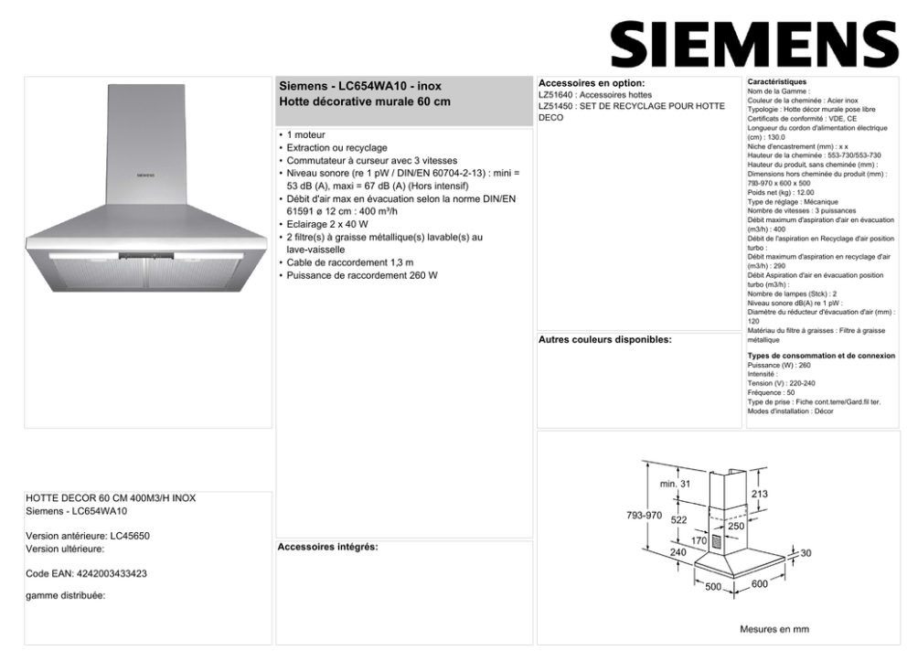 Siemens - LC654WA10 - inox Hotte décorative murale 60 cm
