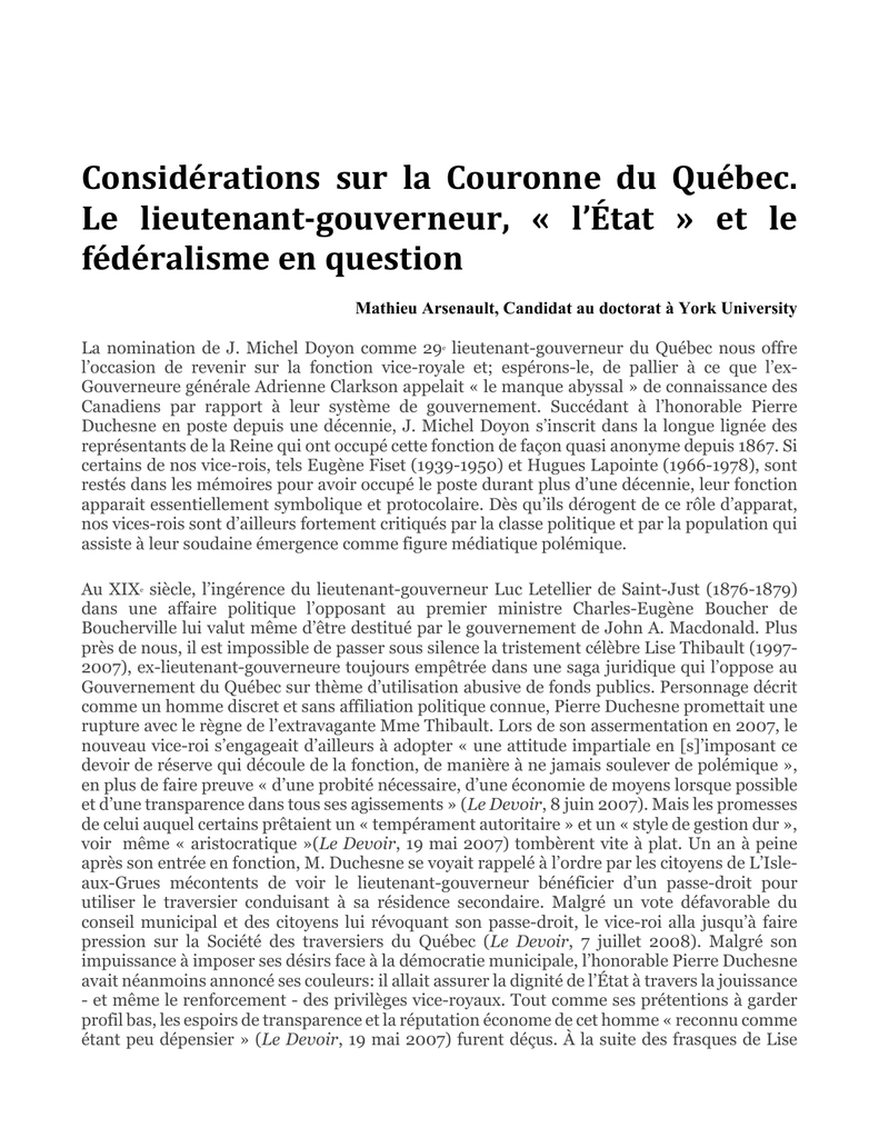 Considérations sur la Couronne du Québec. Le lieutenant‐gouverneur, « l’État » et le fédéralismeenquestion Mathieu Arsenault, Candidat au doctorat à York University La nomination de J. Michel Doyon comme 29e lieutenant-gouverneur du Québec nous offre l’occasion de revenir sur la fonction vice-royale et; espérons-le, de pallier à ce que l’exGouverneure générale Adrienne Clarkson appelait « le manque abyssal » de connaissance des Canadiens par rapport à leur système de gouvernement. Succédant à l’honorable Pierre Duchesne en poste depuis une décennie, J. Michel Doyon s’inscrit dans la longue lignée des représentants de la Reine qui ont occupé cette fonction de façon quasi anonyme depuis 1867. Si certains de nos vice-rois, tels Eugène Fiset (1939-1950) et Hugues Lapointe (1966-1978), sont restés dans les mémoires pour avoir occupé le poste durant plus d’une décennie, leur fonction apparait essentiellement symbolique et protocolaire. Dès qu’ils dérogent de ce rôle d’apparat, nos vices-rois sont d’ailleurs fortement critiqués par la classe politique et par la population qui assiste à leur soudaine émergence comme figure médiatique polémique. Au XIXe siècle, l’ingérence du lieutenant-gouverneur Luc Letellier de Saint-Just (1876-1879) dans une affaire politique l’opposant au premier ministre Charles-Eugène Boucher de Boucherville lui valut même d’être destitué par le gouvernement de John A. Macdonald. Plus près de nous, il est impossible de passer sous silence la tristement célèbre Lise Thibault (19972007), ex-lieutenant-gouverneure toujours empêtrée dans une saga juridique qui l’oppose au Gouvernement du Québec sur thème d’utilisation abusive de fonds publics. Personnage décrit comme un homme discret et sans affiliation politique connue, Pierre Duchesne promettait une rupture avec le règne de l’extravagante Mme Thibault. Lors de son assermentation en 2007, le nouveau vice-roi s’engageait d’ailleurs à adopter « une attitude impartiale en [s]’imposant ce devoir de réserve qui découle de la fonction, de manière à ne jamais soulever de polémique », en plus de faire preuve « d’une probité nécessaire, d’une économie de moyens lorsque possible et d’une transparence dans tous ses agissements » (Le Devoir, 8 juin 2007). Mais les promesses de celui auquel certains prêtaient un « tempérament autoritaire » et un « style de gestion dur », voir même « aristocratique »(Le Devoir, 19 mai 2007) tombèrent vite à plat. Un an à peine après son entrée en fonction, M. Duchesne se voyait rappelé à l’ordre par les citoyens de L’Isleaux-Grues mécontents de voir le lieutenant-gouverneur bénéficier d’un passe-droit pour utiliser le traversier conduisant à sa résidence secondaire. Malgré un vote défavorable du conseil municipal et des citoyens lui révoquant son passe-droit, le vice-roi alla jusqu’à faire pression sur la Société des traversiers du Québec (Le Devoir, 7 juillet 2008). Malgré son impuissance à imposer ses désirs face à la démocratie municipale, l’honorable Pierre Duchesne avait néanmoins annoncé ses couleurs: il allait assurer la dignité de l’État à travers la jouissance - et même le renforcement - des privilèges vice-royaux. Tout comme ses prétentions à garder profil bas, les espoirs de transparence et la réputation économe de cet homme « reconnu comme étant peu dépensier » (Le Devoir, 19 mai 2007) furent déçus. À la suite des frasques de Lise ARSENAULT, Mathieu. « Considérations sur la Couronne du Québec. Le lieutenant-gouverneur, l’’’État’’ et le fédéralisme en question ». HistoireEngagee.ca (24 août 2015), [en ligne]. http://histoireengagee.ca/considerations-sur-la-couronne-du-quebec-le-lieutenant-gouverneur-letat-etle-federalisme-en-question Thibault, le nouveau lieutenant-gouverneur avait été invité par le gouvernement Charest à répondre publiquement de ses dépenses devant les élus du peuple assemblés en commission parlementaire (Le Devoir, 15 juin 2007). En refusant de se présenter devant la commission sous prétexte que les conventions en vigueur dans le Commonwealth et les privilèges dus à sa fonction le dispensaient de rendre compte de sa gestion des fonds publics, Pierre Duchesne ne manqua pas de soulever la colère des députés (Le Devoir, 4 février 2010). Accusant le vice-roi de se « tirer un rang », la députée péquiste Agnès Maltais déposa une motion visant à stopper l’allocation de 775 000$ accordée au lieutenant-gouverneur. Cette protestation contre la rebuffade qui avait mis jusqu’au premier ministre Jean Charest dans l’embarras tomba toutefois à plat. Malgré le soutien de l’ADQ et de Québec Solidaire, la motion fut défaite de sept voix par les libéraux qui durent encaisser les quolibets de l’opposition qui lançait des « Vives la Reine! » ironiques lors du vote libéral (Le Devoir, 12 février 2010). Puis vint finalement l’affaire des médailles qui suffit à miner l’image de modération et de probité du représentant de la reine. Critiqué pour faire frapper annuellement quelque 1200 médailles à son effigie afin de récompenser les citoyens méritants de la province, Pierre Duchesne se défendit en envoyant son aide de camp expliquer qu’il s’agissait d’une « marque de sobriété » (Le Devoir, 5 février 2010). Quoi qu’il en soit, mentionnons que la frappe de médailles par le lieutenant-gouverneur était pratique courante jusqu’au milieu des années 1960. Cette tradition fut alors abandonnée en mémoire du décès tragique du lieutenant-gouverneur Paul Comtois (1961-1966) dans l’incendie de la résidence officielle du parc du Bois-de-Coulonge à Québec le 21 février 1966. Ce n’est toutefois pas à cause de cet honneur que l’ancien vice-roi est resté dans les mémoires de certains, mais plutôt parce que son histoire lui valut d’être 