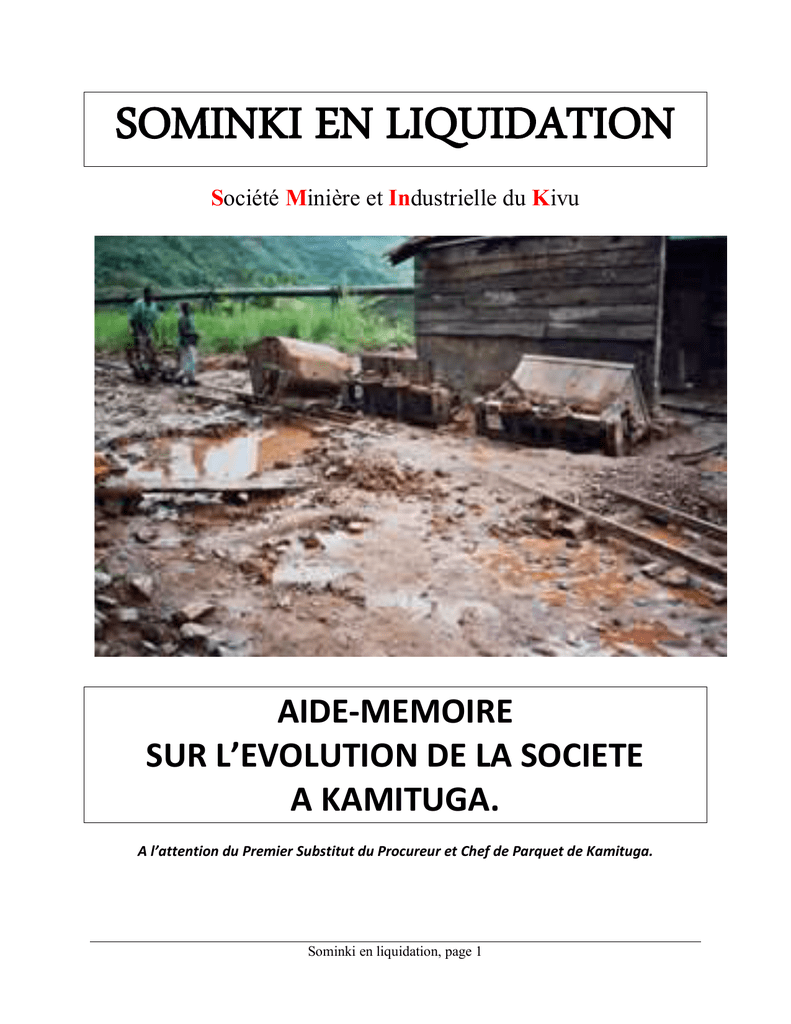 SOMINKI EN LIQUIDATION Société Minière et Industrielle du Kivu AIDE-MEMOIRE SUR L’EVOLUTION DE LA SOCIETE A KAMITUGA. A l’attention du Premier Substitut du Procureur et Chef de Parquet de Kamituga. Sominki en liquidation, page 1 http://www.banro.com/s/Kamituga.asp?ReportID=307256 NAISSANCE DE LA SOCIETE Au cours des années 20, le Baron belge Edouard EMPAIN avait débuté des prospections minières à l’Est du Congo-Belge, prospections qui devaient aboutir à la création d’une compagnie à charte coloniale dénommée MINIERE DES GRANDS LACS AFRICAINS, MGL en sigle, appelée à exploiter les mines dans la province orientale et dans la province du Kivu. L’exploitation de ces mines devait financer la construction du chemin de fer du moyen Lualaba joignant la province du Katanga à la province Édouard Louis Joseph, Baron Empain (né le Orientale en passant par la province du Kivu. 20 septembre 1852 à Belœil-en-Hainaut, Belgique, mort le 22 juillet 1929 dans la commune bruxelloise de Woluwe-Saint-Pierre) La compagnie CFL, Chemin de Fer du moyen Lualaba, avait le projet de relier le lac Tanganika et le lac Kivu, puis le lac Kivu et le lac Edouard et enfin, le lac Edouard et le lac Albert, pour faciliter l’aménagement du territoire de l’Est du Congo-Belge. Sominki en liquidation, page 2 La MGL avait alors signé une charte avec la colonie pour exploiter les gisements miniers du SudKivu, du Nord-Kivu et de l’Ituri dans les conditions de facilité fiscale afin de financer les travaux de la CFL qui consistaient non seulement à construire le chemin de fer mais aussi à aménager le territoire partout où la MGL devait pratiquer l’exploitation des mines. C’est ainsi que, en 1929, la MGL avait tracé la route Constermansville (Bukavu)-Kamituga pour faciliter l’exploitation des gisements miniers de Kamituga débutée effectivement en 1932. Ici, comme toute compagnie à charte qui se respecte, la MGL était « un Etat dans un Etat ». Tous les attributs régaliens de la colonie lui incombaient. A son arrivée à Kamituga, la MGL y avait trouvé un hameau habité par les autochtones du clan des Balighi au sommet de la colline des oiseaux mais leur chef Kamwitugha lui-même avait sa cabane à l’actuel emplacement de l’Ecole Française. Par la suite, après la deuxième guerre mondiale, Kamwitugha et tous ses sujets avaient été délocalisés, d’abord vers les collines Ngolaboni et Ibemba, ensuite vers la rive gauche de la Zalya, notamment à Itota. LE « KAMITUGA » D’AVANT L’INDEPENDANCE Malupango (maison coloniale en 1954) de Kamituga http://marceletnoisette.skynetblogs.be/souvenirs/ Sominki en liquidation, page 3 Une famille des colons belges devant leur « malupango » ci-dessus à Kamituga en 1954. http://marceletnoisette.skynetblogs.be/souvenirs/ La concession minière couverte de titres exclusifs accordée à la MGL/Sud par la colonie à Kamituga s’étendait principalement sur la rive droite de la Zalya occupée par deux clans des autochtones : les Balighi (que la MGL avait délocalisés vers la rive gauche de la Zalya où ils Sominki en liquidation, page 4 avaient installé le chef-lieu de leur Groupement à Mazozo) et les Buuse du Chef Kamagamba dont le chef-lieu du Groupement se trouvait à Kalumba. Le club MGL, endroit où la centaine d'agents se réunissaient. Sur le côté du bâtiment il y avait des terrains de tennis et à l'arrière on avait aménagé un jeu de boules. Le club disposait d'un restaurant et d'une salle de fêtes et projection de films. http://marceletnoisette.skynetblogs.be/souvenirs/ La concession en question était un cercle de 40km de rayon ayant pour centre le camp de Luliba. Comme toute concession minière couverte de titres exclusifs, Kamituga était subdivisée en deux zones : • Une Zone A où rien ne pouvait être entrepris sans l’aval préalable de la MGL et où ne pouvaient habiter que les travailleurs de la MGL et leurs assimilés ; • Une Zone B qu’habitaient des cultivateurs chargés d’approvisionner la Zone A en produits vivriers de première nécessité. Ces cultivateurs étaient sous l’autorité de leurs chefs coutumiers, notamment, Mungombe, Kamagamba, Ngambwa, Kamituga, Kisengenyo, Mango, Mawe, etc….. Sominki en liquidation, page 5 Hutte Warega dans la région de Kamituga en 1935 http://marceletnoisette.skynetblogs.be/souvenirs/ La Zone A s’étendait du pont de la Lubyala au Nord au pont de la Kibe au Sud, et de la rivière Zalya à l’Est, à la rivière Kiloboze à l’Ouest. Mis à part les travailleurs de la société, on pouvait trouver dans la Zone A de Kamituga : • Les Missionnaires d’Afrique (Pères Blancs du Cardinal Lavigerie) et leurs collaborateurs à Tangila ; • Les Agents de l’Etat (le Commissaire de Police et ses policiers, les Agents de l’Etat-Civil, le Juge du tribunal, etc… à Katunga et • Les Commerçants belges et grecs autorisés par le Gouverneur à exercer du commerce dans une concession minière couverte de titres exclusifs au Centre Commercial. Les camps des ouvriers de la MGL étaient peuplés des indigènes recrutés par Monsieur Van Dermel dans des contrées lointaines du Congo-Belge et Ruanda-Urundi et dans les villages du Territoire de Mwenga. Kamituga était donc un véritable « melting pot » à l’Américaine où se brassaient différentes races, différentes ethnies, différentes tribus, différents clans de la tribu lega. Sominki en liquidation, page 6 Les Warega de la concession minière couverte des titres exclusifs en général et les autochtones Balighi et Buuse, en particulier, se faisaient difficilement recruter par Monsieur Van Dermel : ils considéraient les travaux de mines très dégradants. Ils préféraient s’adonner à l’agriculture. LE KAMITUGA DE 1960 A 1965 Les Blancs de la MGL s’étaient retirés un moment de Kamituga, la veille du 30 juin 1960, pour se mettre à l’abri des tracasseries des Congolais fous de leur indépend