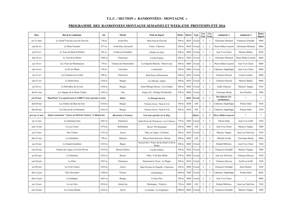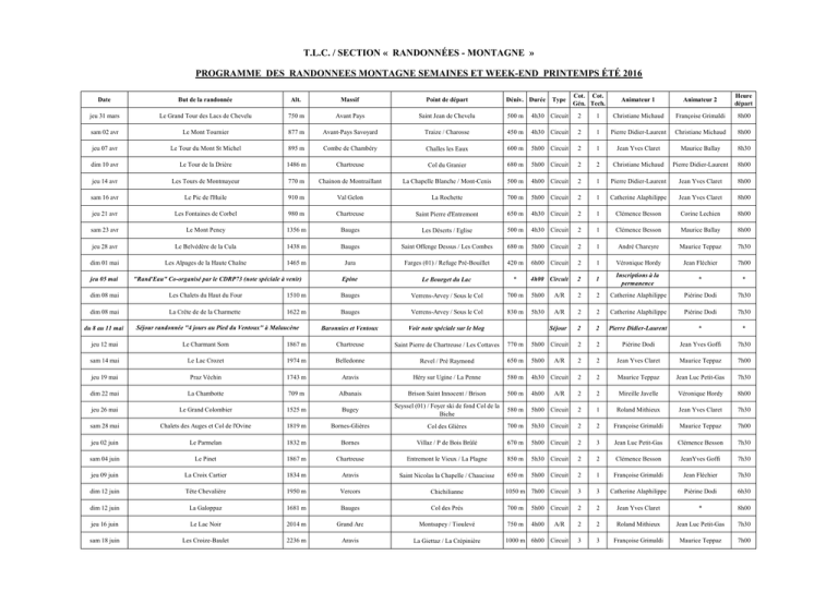T.L.C. / SECTION « RANDONNÉES - MONTAGNE » PROGRAMME DES RANDONNEES MONTAGNE SEMAINES ET WEEK-END PRINTEMPS ÉTÉ 2016 Animateur 1 Animateur 2 Heure départ 1 Christiane Michaud Françoise Grimaldi 8h00 2 1 Pierre Didier-Laurent Christiane Michaud 8h00 Circuit 2 1 Jean Yves Claret Maurice Ballay 8h30 5h00 Circuit 2 2 Christiane Michaud Pierre Didier-Laurent 8h00 500 m 4h00 Circuit 2 1 Pierre Didier-Laurent Jean Yves Claret 8h00 La Rochette 700 m 5h00 Circuit 2 1 Catherine Alaphilippe Jean Yves Claret 8h00 Chartreuse Saint Pierre d'Entremont 650 m 4h30 Circuit 2 1 Clémence Besson Corine Lechien 8h00 1356 m Bauges Les Déserts / Eglise 500 m 4h30 Circuit 2 1 Clémence Besson Maurice Ballay 8h00 Le Belvédère de la Cula 1438 m Bauges Saint Offenge Dessus / Les Combes 680 m 5h00 Circuit 2 1 André Chareyre Maurice Teppaz 7h30 Les Alpages de la Haute Chaîne 1465 m Jura Farges (01) / Refuge Pré-Bouillet 420 m 6h00 Circuit 2 1 Véronique Hordy Jean Fléchier 7h00 * * Date But de la randonnée Alt. Massif Point de départ jeu 31 mars Le Grand Tour des Lacs de Chevelu 750 m Avant Pays sam 02 avr Le Mont Tournier 877 m jeu 07 avr Le Tour du Mont St Michel dim 10 avr Cot. Cot. Gén. Tech. Déniv. Durée Type Saint Jean de Chevelu 500 m 4h30 Circuit 2 Avant-Pays Savoyard Traize / Charosse 450 m 4h30 Circuit 895 m Combe de Chambéry Challes les Eaux 600 m 5h00 Le Tour de la Drière 1486 m Chartreuse Col du Granier 680 m jeu 14 avr Les Tours de Montmayeur 770 m Chainon de Montraillant La Chapelle Blanche / Mont-Cenis sam 16 avr Le Pic de l'Huile 910 m Val Gelon jeu 21 avr Les Fontaines de Corbel 980 m sam 23 avr Le Mont Peney jeu 28 avr dim 01 mai jeu 05 mai "Rand'Eau" Co-organisé par le CDRP73 (note spéciale à venir) Epine Le Bourget du Lac * 4h00 Circuit 2 1 Inscriptions à la permanence dim 08 mai Les Chalets du Haut du Four 1510 m Bauges Verrens-Arvey / Sous le Col 700 m 5h00 A/R 2 2 Catherine Alaphilippe Piérine Dodi 7h30 dim 08 mai La Crête de de la Charmette 1622 m Bauges Verrens-Arvey / Sous le Col 830 m 5h30 A/R 2 2 Catherine Alaphilippe Piérine Dodi 7h30 Baronnies et Ventoux Voir note spéciale sur le blog Séjour 2 2 Pierre Didier-Laurent * * du 8 au 11 mai Séjour randonnée "4 jours au Pied du Ventoux" à Malaucène jeu 12 mai Le Charmant Som 1867 m Chartreuse Saint Pierre de Chartreuse / Les Cottaves 770 m 5h00 Circuit 2 2 Piérine Dodi Jean Yves Goffi 7h30 sam 14 mai Le Lac Crozet 1974 m Belledonne Revel / Pré Raymond 650 m 5h00 A/R 2 2 Jean Yves Claret Maurice Teppaz 7h00 jeu 19 mai Praz Véchin 1743 m Aravis Héry sur Ugine / La Penne 580 m 4h30 Circuit 2 2 Maurice Teppaz Jean Luc Petit-Gas 7h30 dim 22 mai La Chambotte 709 m Albanais Brison Saint Innocent / Brison 500 m 4h00 A/R 2 2 Mireille Javelle Véronique Hordy 8h00 580 m 5h00 Circuit 2 1 Roland Mithieux Jean Yves Claret 7h30 jeu 26 mai Le Grand Colombier 1525 m Bugey Seyssel (01) / Foyer ski de fond Col de la Biche sam 28 mai Chalets des Auges et Col de l'Ovine 1819 m Bornes-Glières Col des Glières 700 m 5h30 Circuit 2 2 Françoise Grimaldi Maurice Teppaz 7h00 jeu 02 juin Le Parmelan 1832 m Bornes Villaz / P de Bois Brûlé 670 m 5h00 Circuit 2 3 Jean Luc Petit-Gas Clémence Besson 7h30 sam 04 juin Le Pinet 1867 m Chartreuse Entremont le Vieux / La Plagne 850 m 5h30 Circuit 2 2 Clémence Besson JeanYves Goffi 7h30 jeu 09 juin La Croix Cartier 1834 m Aravis Saint Nicolas la Chapelle / Chaucisse 650 m 5h00 Circuit 2 1 Françoise Grimaldi Jean Fléchier 7h30 dim 12 juin Tête Chevalière 1950 m Vercors Chichilianne 1050 m 7h00 Circuit 3 3 Catherine Alaphilippe Pièrine Dodi 6h30 dim 12 juin La Galoppaz 1681 m Bauges Col des Prés 700 m 5h00 Circuit 2 2 Jean Yves Claret * 8h00 jeu 16 juin Le Lac Noir 2014 m Grand Arc Montsapey / Tioulevé 750 m 4h00 A/R 2 2 Roland Mithieux Jean Luc Petit-Gas 7h30 sam 18 juin Les Croize-Baulet 2236 m Aravis La Giettaz / La Crépinière 1000 m 6h00 Circuit 3 3 Françoise Grimaldi Maurice Teppaz 7h00 jeu 23 juin Le Chalet de la Grande Valloire 1859 m Belledonne La Ferrière / Le Curtillard 834 m 5h30 A/R 2 2 Jean Yves Claret Françoise Grimaldi 7h30 dim 26 juin Le Petit Som 1772m Chartreuse Saint Pierre de Chartreuse / La Correrie 1000 m 6h00 Circuit 3 2 Corine Lechien Jean Yves Claret 7h30 jeu 30 juin La Pointe de Tardevant 2501 m Aravis La Clusaz / Les Confins 1050 m 6h30 A/R 3 3 Françoise Grimaldi Jean Yves Claret 7h00 jeu 30 juin Le Lac de Tardevant 2110 m Aravis La Clusaz / Les Confins 680 m 5h00 A/R 2 2 Jean Luc Petit-Gas Piérine Dodi 7h00 sam 02 juil L'Aiguille Grive 2733 m Vanoise Peisey-Nacroix / Chapelle des Vernettes 950 m 6h30 Circuit 3 3 Charles Massonnat André Chareyre 7h00 sam 02 juil Col d'Entreporte et Col de La Chal 2460 m Vanoise Peisey-Nacroix / Chapelle des Vernettes 660 m 5h00 Circuit 2 2 Charles Massonnat André Chareyre 7h00 dim 10 juil Les Lacs Jovet par le Col de la Fenêtre 2245 m Beaufortain Hauteluce / Col du Joly 950 m 6h30 Circuit 3 2 Piérine Dodi Jean Fléchier 7h00 Vercors Voir note spéciale sur le blog Séjour 3 3 Charles Massonnat Véronique Hordy * du 13 au 16 juillet Séjour randonnée "Les Falaises du Vercors" jeu 14 juil Le Pas de la Ville et Le Grand Veymont 2341 m Vercors Gresse en Vercors / La Ville 1100 m 6h00 A/R 3 3 Charles Massonnat Véronique Hordy 6h30 dim 17 juil Le Grand Perron des Encombres 2824 m Vanoise Saint Martin de la Porte / Les Rateaux 1050 m 6h00 A/R 3 2 Pierre Didier-Laurent Mireille Javelle 6h30 sam 23 juil La Tournette 2351 m Bornes Montmin / Chalet de l'Aulp 950 m 5h30 A/R 3 3 Corine Lechien Jean Yves Claret 6h30 940 m 6h30 A/R 3 2 Clémence Besson Françoise Grimaldi 6h30 sam 30 juil Les Lacs de l'Etendard 2700 m Grandes Rousses Saint Sorlin d'Arves / Col de la Croix de Fer dim 07 août L'Aiguille Percée 2778 m Vanoise Tignes le Lac 1100 m 6h30 Circuit 3 3 Corine Lechien Catherine Alaphilippe 6h00 dim 07 août Col de la Tourne, Lac de Grattaleu et Col du palet 2686 m Vanoise Tignes le Lac 750 m 5h00 Circuit 2 2 Corin