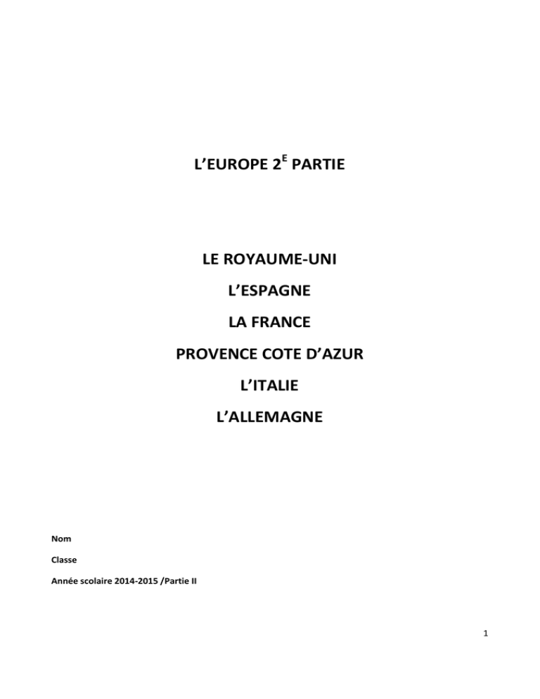 L’EUROPE 2E PARTIE LE ROYAUME-UNI L’ESPAGNE LA FRANCE PROVENCE COTE D’AZUR L’ITALIE L’ALLEMAGNE Nom Classe Année scolaire 2014-2015 /Partie II 1 TABLE DES MATIERES Le Royaume-Uni……………………………………………….. p3 L’Espagne………………………………………………………….. p 14 La France…………………………………………………………... p 29 Provence Côte d’Azur………………………………………… p 39 L’Italie………………………………………………………………. P 43 L’Allemagne………………………………………………………. P 64 2 LE ROYAUME-UNI 1) Les Iles Britanniques : 2 Etats (Royaume Uni + République d’Irlande (Eire) 2) La Grande Bretagne : 3 nations : Angleterre, Pays de Galles, Ecosse 3) Le Royaume Uni : La Grande-Bretagne + l’Irlande du Nord (Ulster) Le Royaume-Uni se compose de 4 nations (indiquez aussi les capitales régionales respectives) On appelle aussi EIRE la…… Le Royaume-Uni est un archipel océanique composé de la GrandeBretagne, d’une partie de l’Irlande et de plusieurs autres petites îles : localisez les îles Shetland, Hébrides, Orcades et l’île de Wight. Indiquez les mers qui l’entourent. La Grande-Bretagne est séparée de l’Europe continentale par le détroit de Calais. Aujourd’hui, elle n’est plus complètement uneles île montagnes grâce au…. anciennes Son relief oppose de l’Ouest et du nord aux plaines du sud-est. Le point culminant des Highlands s’appelle le ……………………….. ; ses monts sont riches en lacs ; citons par exemple le Loch Ness. 3 Paysages des Highlands Nessie Le Loch Ness Le climat du Royaume-Uni Le climat du Royaume-Uni est océanique. Les montagnes de l’Ouest sont battues par les vents et soumises à des pluies abondantes et à de fréquentes tempêtes. C’est le climat océanique de montagne. De plus, un courant maritime chaud arrive de l’Atlantique. Le sud-est, mieux protégé de l’influence maritime, est moins humide. 1) Rappelez les caractéristiques du climat océanique 2) Rappelez l’influence de la mer sur le climat 3) Pourquoi une différence de précipitations entre l’est et l’ouest du pays ? 4) Quelles sont les conséquences sur la végétation ? 4 La population britannique Le Royaume-Uni compte à peu près 60 millions d’habitants. Les densités de population sont en moyenne très fortes (260 habitants au km2), mais la répartition est très inégale. A l’aide de la carte suivante, repérez les zones à faibles et fortes densités et essayez de les expliquer. Cette répartition est commandée par 3 facteurs : -la plupart des grandes villes sont des ports : Londres, Glasgow, Liverpool. C’est l’héritage de la tradition maritime et commerciale du Royaume-Uni. - les autres villes se sont développées lors de la Révolution industrielle du XVIIIe siècle et sont localisées sur les bassins miniers : Cardiff, Manchester, Birmingham… Ce qui fait que le Royaume-Uni est le pays le plus anciennement urbanisé d’Europe. Il comptait déjà plus de 70% de citadins en 1910. Aujourd’hui, plus de 90% des Britanniques habitent en ville. - depuis plus de 50 ans, le bassin de Londres est devenu la grande région attractive du RoyaumeUni, puisqu’il est l’une des extrémités de la Mégalopole européenne. Les villes sont en général plutôt vastes. La suprématie londonienne est indiscutable avec plus de 15 millions d’habitants. Beaucoup de Britanniques préfèrent habiter dans des lotissements pavillonnaires en banlieue ; les agglomérations se sont étalées et parfois rejointes pour former des conurbations. Avec 90% de citadins, le R.U. est l’un des pays les plus urbanisés du monde. Après la II Guerre Mondiale, de nombreuses personnes originaires du Commonwealth1 (surtout des Pakistanais et des Indiens) ont immigré au Royaume-Uni. Souvent sans qualification, ils vivent pauvrement ou se concentrent à Londres dans les quartiers pauvres des grandes agglomérations. 1 Association d’Etats indépendants issus de l’ancien empire britannique 5 Les Britanniques se divisent en 4 nations : les Anglais (83%), les Ecossais, les Gallois et les Irlandais, qui ont tous trois leur propre langue en plus de l’anglais. En 1997, Gallois et Ecossais ont chacun obtenu un parlement, ce qui leur donne le droit de faire des lois. En septembre 2014, les Ecossais ont dit « non » à l’indépendance suite à un référendum. Présentez en quelques lignes le problème irlandais et le rôle de l’I.R.A. (Irish Republican Army). Le Royaume-Uni a des relations politiques et économiques privilégiées avec les Etats-Unis, sans compter ses liens étroits avec ses anciennes colonies regroupées dans le Commonwealth. Gibraltar appartient au Royaume-Uni, Hong Kong a été redonné à la Chine en 1997. Le Commonwealth regroupe la plupart des anciennes colonies sous l’égide de la reine. Le Royaume-Uni a adhéré à l’U.E. en 1973 et les échanges commerciaux se sont intensifiés depuis cette date. Le tunnel sous la Manche, ouvert en 1994, permet de rejoindre rapidement le continent. Le Royaume-Uni refuse néanmoins une trop grande intégration à l’U.E. et a conservé sa monnaie nationale. 30 km L’entrée du tunnel sous la Manche à Folkestone La frontière entre le Kent et le Nord-Pas-de-Calais, fortement matérialisée par la Manche, semble s’effacer peu à peu dans les esprits ; les habitants des 2 régions commencent à se rendre des visites d’un week-end ou d’une journée… depuis la construction du tunnel sous la Manche, les Britanniques ont acheté un grand nombre de résidences secondaires dans le Pas-de-Calais… 6 Philippe, avocat d’affaires, fêtera bientôt son centième voyage en Eurostar. « Le tunnel me permet de faire fonctionner mes deux cabinets, à Lille et à Londres », explique-t-il. Se comparant à un banlieusard qui viendr
