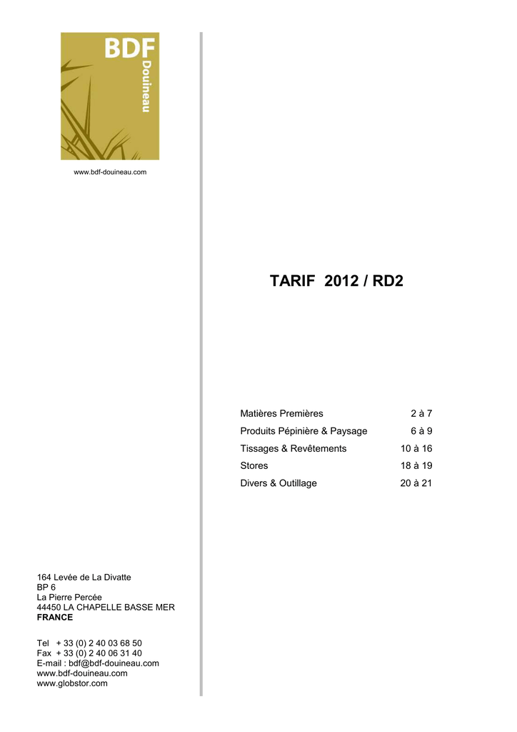 www.bdf-douineau.com TARIF 2012 / RD2 164 Levée de La Divatte BP 6 La Pierre Percée 44450 LA CHAPELLE BASSE MER FRANCE Tel + 33 (0) 2 40 03 68 50 Fax + 33 (0) 2 40 06 31 40 E-mail : [email protected] www.bdf-douineau.com www.globstor.com Matières Premières 2à7 Produits Pépinière & Paysage 6à9 Tissages & Revêtements 10 à 16 Stores 18 à 19 Divers & Outillage 20 à 21 Rotin Ecorcé & Poncé Ecorcé, Redressé Double Ponçage Ø 14/16mm Ø 16/18mm Ø 18/20mm Ø 20/22mm Ø 22/24mm Ø 24/26mm Ø 26/28mm Ø 28/30mm Ø 30/32mm Ø 32/34mm Ø 34/36mm Ø 36/38mm Ø 38/40mm Ø 40/42mm Ø 42/44mm Tohiti AB Batang AB Manau Long AB Manau IN ABC Manau A/AB (TOEA1416) €/13kg Détail (BAEA2224) €/13kg Détail (MLEA3234) €/13kg Détail (MAEABC2830) €/13pc Détail (MAEA1820) €/13pc Détail 9.84 9.84 9.84 9.84 9.84 11.04 11.04 11.04 11.04 11.04 9.84 9.84 9.84 9.84 9.84 9.84 9.84 9.84 9.84 9.84 11.04 11.04 11.04 11.04 11.04 11.04 11.04 11.04 11.04 11.04 Rotin Naturel Naturel, 1° Choix Enoué Ø 14/16mm Ø 16/18mm Ø 18/20mm Ø 20/22mm Ø 22/24mm Ø 24/26mm Ø 26/28mm Ø 28/30mm Ø 30/32mm Ø 30/35mm Ø 35/40mm Ø 40/45mm 14.85 14.85 13.74 10.02 10.63 13.41 12.59 13.41 16.64 19.98 21.47 23.46 24.40 25.12 25.83 28.68 Tohiti AB Manau AB Manau Long AB Malacca AB Malacca long AB (TONEA1416) €/13kg Détail (MANA2224) €/13pc Détail (MANA2224) €/13pc Détail (MALEA1820) €/13pc Détail (MALEAL1820) €/13pc Détail 11.61 11.61 11.61 11.61 11.61 11.61 13.03 13.03 13.03 13.03 13.03 13.03 8.77 9.42 13.65 14.73 15.58 9.83 10.55 15.29 16.50 17.46 15.02 16.87 18.71 20.33 16.82 18.90 20.95 22.77 18.19 22.91 25.28 20.37 25.66 28.32 21.67 23.58 26.08 24.28 26.41 29.22 Loonty Koboo Koboo Mou AB Poluet Blanc (LODKA0406) €/13kg Détail (KOB0408) €/13kg Détail (POLOET) €/13kg Détail Naturel, 1° Choix Ø 2/5mm Ø 4/8 – 8/11mm Naturel, 1° Choix Enoué Ø 4/6mm Ø 6/8mm Ø 8/10mm Ø 10/12mm Ø 12/14mm Ø 14/16mm 13.23 13.23 12.25 8.93 9.47 10.04 11.22 11.96 14.83 17.81 19.14 20.91 21.75 22.39 23.03 25.56 14.74 19.40 19.40 19.40 19.40 19.40 19.40 19.40 21.72 21.72 21.72 21.72 21.72 21.72 21.72 TVA 19,6% en sus Page 2 16.49 5.82 6.57 7.38 10.09 11.41 16.43 16.87 6.51 7.37 8.28 11.32 12.81 18.44 18.84 7.23 9.26 10.60 13.80 15.45 16.38 21.10 8.11 10.38 11.87 15.46 17.00 18.38 23.56 Rotin Filé 1° Choix Ø 1.0mm Ø 1.2mm *Ø 1.5mm Ø 2.0mm *Ø 2.5mm Ø 3.0mm Ø 3.5mm Ø 4.0mm Ø 4.5mm Ø 5.0mm Ø 6.0mm 20mm * bleue, verte, jaune, rouge, noire, orange, fuschia, rose, bordeaux, caramel, marron, menthe, violette Moelle Sélectionnée 1kg Moelle Extra 1kg Moelle Couronne 500grs Moelle Couleur 250grs Eclisse Plate Bois/Couleur 250grs (MOB01M5) €/13kg Détail (MOA01M5) €/13kg Détail (MOCA01M5) €/13kg Détail (MOCACR02M5) €/13kg Détail (ECBOAR20M) €/13kg Détail 24.75 24.75 24.75 24.75 24.75 24.75 24.75 24.75 27.77 27.77 27.77 27.77 27.77 27.77 27.77 27.77 28.36 28.36 28.36 25.95 25.95 25.95 25.95 25.95 25.95 25.95 25.95 31.82 31.82 31.82 29.07 29.07 29.07 29.07 29.07 29.07 29.07 29.07 28.36 28.36 28.36 26.83 26.83 26.83 26.83 26.83 26.83 26.83 26.83 31.82 31.82 31.82 30.06 30.06 30.06 30.06 30.06 30.06 30.06 30.06 31.88 30.33 29.72 29.72 35.77 34.03 33.29 33.29 10.19 Moelle Extra Moelle Rigide Eclisse Plate 250grs (MOA07M) €/13kg Détail (MORIA08M) €/13kg Détail (ECMA10M) €/13kg Détail 11.42 1° Choix Ø 8mm Ø 9mm Ø 10mm Ø 11mm Ø 12mm Ø 14mm Ø 15mm Ø 16mm Ø 17mm Ø 18mm Ø 20mm Ø 21mm Ø 22mm Ø 24mm Ø 26mm 1° Choix, (balle de 50kgs) Ø 6.5 x 5 x 3mm Ø 6.5 x 5 x 3mm (0.5kg/cour) 5/5.5mm 5.5/6mm 5/5.5mm (0.5kg/poignée) 5.5/6mm (0.5kg/poignée) 5.5/6mm (0.25kg/poignée) 5/6mm 26.63 26.63 26.63 26.63 26.63 26.63 26.63 26.63 26.63 26.63 26.63 26.63 26.63 26.63 26.63 29.85 29.85 29.85 29.85 29.85 29.85 29.85 29.85 29.85 29.85 29.85 29.85 29.85 29.85 29.85 26.63 29.85 36.50 40.86 36.50 40.86 36.50 40.86 Moelle Trapézoïdale Eclisse Moelle Eclisse Moelle Couleur Lame ½ Email Lame½Email Régularisée (MOTA65X3M) €/13kg Détail (ECMA5M5) €/13kg Détail (ECMA5M5 €/13kg Détail (LADA56M) €/13kg Détail (LADA5M) €/13kg Détail 33.02 34.29 36.99 38.41 28.90 32.37 31.36 35.17 31.81 35.63 23.24 * bleue, verte, jaune, rouge, noire, orange, fuschia, rose, bordeaux, caramel, marron, menthe, violette TVA 19,6% en sus Page 3 26.03 41.82 46.85 45.39 50.90 Canne de Rotin Canne Supérieure Ficelle Rouge (ligature rouge) Canne Extra Ficelle Bleue (ligature bleue) (CA250B) (CA500A) 250grs 1° Choix, Trade Mark Jaguar 1.6 - 1.8mm 2 - 2.2 - 2.4mm 2.6 - 2.8mm 3 - 3.5 - 4mm 500grs Par 5kgs €/kg Détail €/kg Par 5kgs €/kg Détail €/kg Par 5kgs €/kg Détail €/kg 57.27 57.27 57.27 57.27 64.52 64.52 64.52 64.52 83.11 83.11 83.11 93.02 93.02 93.02 88.64 88.64 88.64 88.64 99.12 99.12 99.12 99.12 Raphia Siège (SF100) €/kg Naturel 1°Choix Floche (balle/100kgs) 120cm coupé (balle/25kgs) 130cm coupé (balle/25kgs) (FF020) €/kg Détail Par balle Détail 5.68 6.37 5.68 6.37 (PE050SM) €/pc Détail Herbe des 0.63 Pelote 150gr (PE150SM) €/pc Détail Par balle (RACOUP) €/kg Détail Par balle 1.79 1.06 Floche 250gr (FLO250G) €/pc Détail Par balle 2.00 2.74 3.07 3.10 3.47 1.19 Herbe Marais (MAR30) €/kg Par 5kg Par balle 6.80 7.30 7.30 0.70 Marais Naturelle, 1° Choix Balle de 30kgs Coupé 6.52 6.52 Par balle Couleur 1°Choix Conditionné Bague plastique 96pcs/carton balle de 100 floches Rouge, fuschia, violet, bleu, jaune, noir, vert, orange, caramel, menthe, rose, bordeaux, marron Fleuriste Par balle Pelote 50gr Naturel 1°Choix Conditionné Bague plastique 50pcs/carton 24pcs/carton 24floches/colis 250grs 7.63 TVA 19,6% en sus Page 4 Paille de Seigle 1° Choix Poignée +/- 150grs Rouge, verte, jaune, bleue Cordon Végétal Antiquaire Antiquaire Vieilli (SEAN) Par 5kgs Détail €/kg €/kg (SEANV) Par 5kgs Détail €/kg €/kg (SEOR) Par 5kgs Détail €/kg €/kg (SENA) Par 5kgs Détail €/kg €/kg 51.52 51.52 51.52 71.98 57.73 57.73 Dorée 57.73 Paille Dorée Paille 