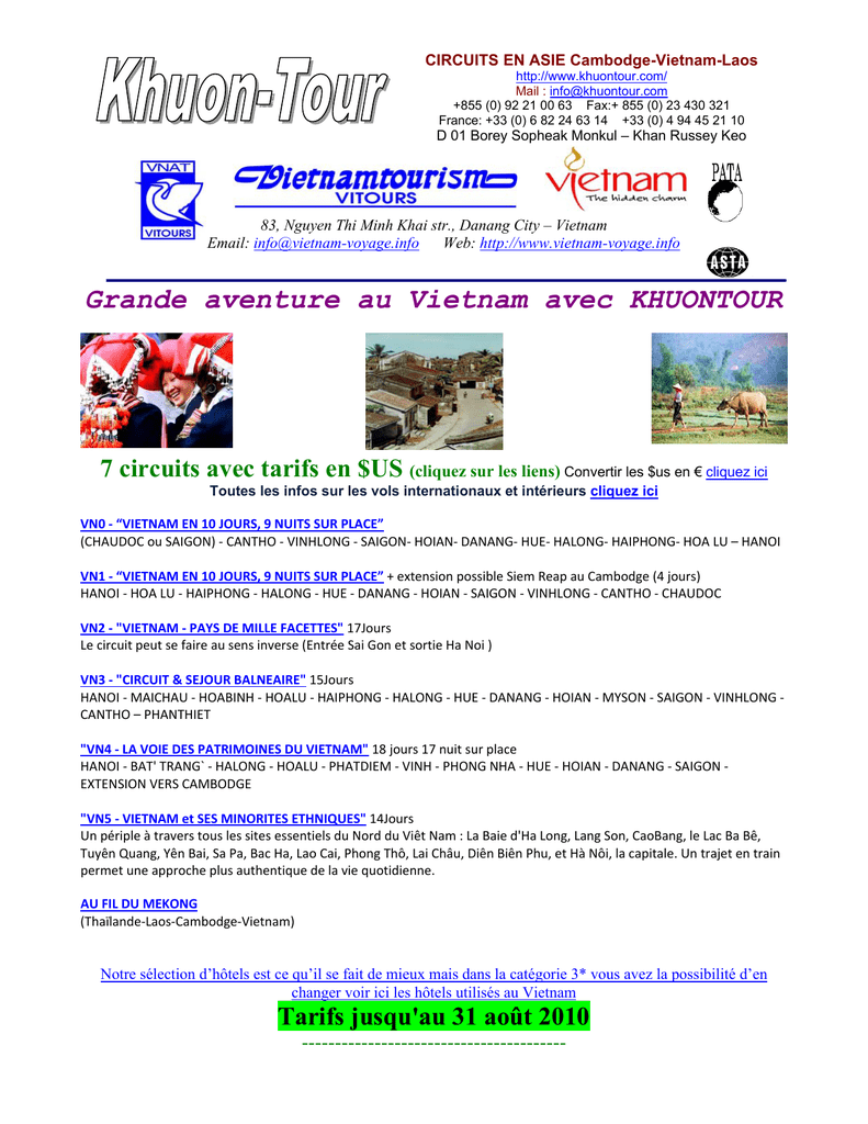 CIRCUITS EN ASIE Cambodge-Vietnam-Laos http://www.khuontour.com/ Mail : [email protected] +855 (0) 92 21 00 63 Fax:+ 855 (0) 23 430 321 France: +33 (0) 6 82 24 63 14 +33 (0) 4 94 45 21 10 D 01 Borey Sopheak Monkul – Khan Russey Keo 83, Nguyen Thi Minh Khai str., Danang City – Vietnam Web: http://www.vietnam-voyage.info Email: [email protected] Grande aventure au Vietnam avec KHUONTOUR 7 circuits avec tarifs en $US (cliquez sur les liens) Convertir les $us en € cliquez ici Toutes les infos sur les vols internationaux et intérieurs cliquez ici VN0 ‐ “VIETNAM EN 10 JOURS, 9 NUITS SUR PLACE” (CHAUDOC ou SAIGON) ‐ CANTHO ‐ VINHLONG ‐ SAIGON‐ HOIAN‐ DANANG‐ HUE‐ HALONG‐ HAIPHONG‐ HOA LU – HANOI VN1 ‐ “VIETNAM EN 10 JOURS, 9 NUITS SUR PLACE” + extension possible Siem Reap au Cambodge (4 jours) HANOI ‐ HOA LU ‐ HAIPHONG ‐ HALONG ‐ HUE ‐ DANANG ‐ HOIAN ‐ SAIGON ‐ VINHLONG ‐ CANTHO ‐ CHAUDOC VN2 ‐ "VIETNAM ‐ PAYS DE MILLE FACETTES" 17Jours Le circuit peut se faire au sens inverse (Entrée Sai Gon et sortie Ha Noi ) VN3 ‐ "CIRCUIT & SEJOUR BALNEAIRE" 15Jours HANOI ‐ MAICHAU ‐ HOABINH ‐ HOALU ‐ HAIPHONG ‐ HALONG ‐ HUE ‐ DANANG ‐ HOIAN ‐ MYSON ‐ SAIGON ‐ VINHLONG ‐ CANTHO – PHANTHIET "VN4 ‐ LA VOIE DES PATRIMOINES DU VIETNAM" 18 jours 17 nuit sur place HANOI ‐ BAT' TRANG` ‐ HALONG ‐ HOALU ‐ PHATDIEM ‐ VINH ‐ PHONG NHA ‐ HUE ‐ HOIAN ‐ DANANG ‐ SAIGON ‐ EXTENSION VERS CAMBODGE "VN5 ‐ VIETNAM et SES MINORITES ETHNIQUES" 14Jours Un périple à travers tous les sites essentiels du Nord du Viêt Nam : La Baie d'Ha Long, Lang Son, CaoBang, le Lac Ba Bê, Tuyên Quang, Yên Bai, Sa Pa, Bac Ha, Lao Cai, Phong Thô, Lai Châu, Diên Biên Phu, et Hà Nôi, la capitale. Un trajet en train permet une approche plus authentique de la vie quotidienne. AU FIL DU MEKONG (Thaïlande‐Laos‐Cambodge‐Vietnam) Notre sélection d’hôtels est ce qu’il se fait de mieux mais dans la catégorie 3* vous avez la possibilité d’en changer voir ici les hôtels utilisés au Vietnam Tarifs jusqu'au 31 août 2010 ---------------------------------------- CIRCUITS EN ASIE Cambodge-Vietnam-Laos http://www.khuontour.com/ Mail : [email protected] +855 (0) 92 21 00 63 Fax:+ 855 (0) 23 430 321 France: +33 (0) 6 82 24 63 14 +33 (0) 4 94 45 21 10 D 01 Borey Sopheak Monkul – Khan Russey Keo VN0 - “VIETNAM EN 10 JOURS, 9 NUITS SUR PLACE” Marché aux fleurs Tunnels de Cu Chi Musée de la guerre Hoi Han Cathédrale Notre Dame Montagne de marbre Retour haut de page Circuit dans le sens Saigon (Ho Chi Minh ville) - Hanoi Début de circuit soit à Saigon soit à Chaudoc. Idéal après un circuit au Cambodge. 1er jour: Saigon - Arrivée (-/Déj/D) Arrivée à Saigon (Ho Chi Minh ville), capitale économique du Vietnam. Accueil et transfert à l'hôtel. Rebaptisée HO CHI MINH Ville en 1976 après le départ des américains, l'ex-capitale du sud Vietnam a gardé comme nom Saigon pour la majorité de ses 4,5 millions d'habitants. Saigon est la plus grande ville du pays et s'est affirmée très tôt comme la capitale économique, elle comprend 12 arrondissements urbains et 6 arrondissements ruraux étendus sur plus de 2 000 km2. Il ne s'écoule pas une heure du jour et de la nuit sans que les rues ne résonnent des incessants coups de klaxons et du vrombissement de milliers de cyclomoteurs qui sillonnent la ville. La présence française est encore très marquée par de longues avenues ombragées jalonnées de maisons coloniales, de monuments et de jardins. Déjeuner. Tour panoramique de Saigon : visite de la capitale économique du Vietnam et de son quartier chinois Cholon: la Poste centrale, la Cathédrale Notre-Dame de Sai Gon, une fabrique de laques, le temple Thiên Hâu, les Halles Binh Tây. Dîner musical et nuit à Saigon. 2eme jour: Saigon - Vinh Long - Saigon (Pdéj/Déj/-) Route vers le Sud, à la découverte du delta du Mékong. Promenade en sampan sur les arroyos (canaux) : vie lacustre des paysans entre l'eau et les vergers luxuriants. Visite du marché flottant Cai Be, d'un verger, dégustation des fruits exotiques, visite d'un village de métier traditionnel. Déjeuner de spécialités (poissons d'oreilles d'Éléphant) dans un Jardin. Retour à Saigon. En chemin vers Saigon : visite d'un temple consacré à la secte Cao Dai, qui vénère Lao Tseu, Confucius, Jésus Christ, et... Victor Hugo. Dîner libre et nuit à Sai Gon. 3eme jour: Saigon 4 Da Nang - Hoi An (Pdéj/Déj/-) Transfert à l'aéroport Tan Son Nhat et envol vers Da Nang Vietnam. A l'arrivée : visite du Musée de sculptures consacré à la civilisation Chàm, fondé par l'Ecole Française de l'Extrême Orient. Déjeuner au restaurant, puis départ pour l'ascension de la Montagne de Marbre située à 10 km de Da Nang. Visite d'un atelier de ciselage sur pierres au pied de ce Mont. Continuation vers Hoi An. Balade dans cette petite charmante ville piétonnière: temples, maisons anciennes, pont japonais... Déjeuner au restaurant local. Dîner libre. Nuit à Hoi An. 4eme jour : Hoi An - My Son - Hoi An (Pdéj/Déj/-) Départ pour la découverte du sanctuaire de My Son, situé à 30 km de Hoi An, classé comme patrimoine culturel mondial par UNESCO. Retour à Hôi An. Déjeuner de spécialités. L'après midi libre pour se promener ou faire du shopping dans cette petite ville charmante. Dîner libre et nuit à Hoi An. CIRCUITS EN ASIE Cambodge-Vietnam-Laos http://www.khuontour.com/ Mail : [email protected] +855 (0) 92 21 00 63 Fax:+ 855 (0) 23 430 321 France: +33 (0) 6 82 24 63 14 +33 (0) 4 94 45 21 10 D 01 Borey Sopheak Monkul – Khan Russey Keo 5eme jour: Hoi An - Hue (Pdéj/-/D) Route pour Hue par la Nationale 1 (la Route mandarine). Arrêt-photos au sommet du Col des Nuages où vous aurez une vue panoramique sur la mer de Chine. Halte au village des pêcheurs Lang Co pour le déjeuner (à vos soins). Puis continuation vers Hue. Arrivée e
