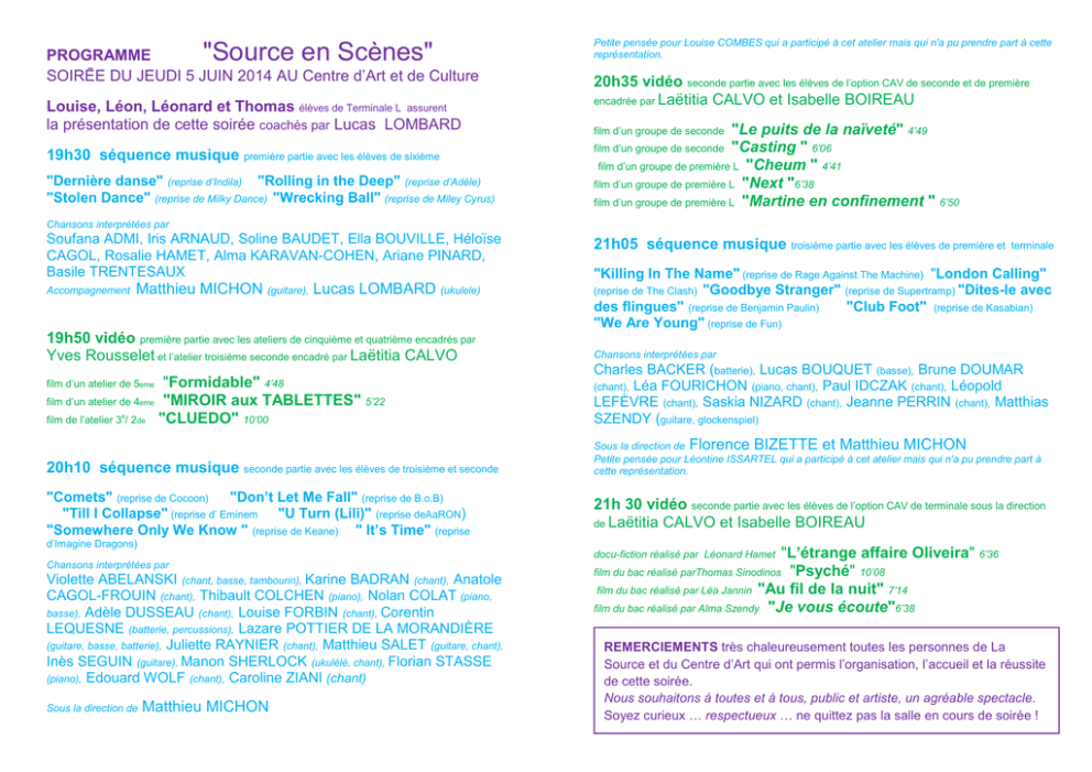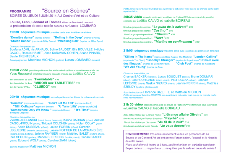 ʺSource en Scènesʺ PROGRAMME SOIRĒE DU JEUDI 5 JUIN 2014 AU Centre d’Art et de Culture Louise, Léon, Léonard et Thomas élèves de Terminale L assurent la présentation de cette soirée coachés par Lucas LOMBARD 19h30 séquence musique première partie avec les élèves de sixième ʺDernière danseʺ (reprise d’Indila) ʺRolling in the Deepʺ (reprise d’Adèle) ʺStolen Danceʺ (reprise de Milky Dance) ʺWrecking Ballʺ (reprise de Miley Cyrus) Petite pensée pour Louise COMBES qui a participé à cet atelier mais qui n'a pu prendre part à cette représentation. 20h35 vidéo seconde partie avec les élèves de l’option CAV de seconde et de première encadrée par Laëtitia CALVO et Isabelle BOIREAU ʺLe puits de la naïvetéʺ 4’49 film d’un groupe de seconde ʺCasting ʺ 6’06 film d’un groupe de première L ʺCheum ʺ 4’41 film d’un groupe de première L ʺNext ʺ6’38 film d’un groupe de première L ʺMartine en confinement ʺ 6’50 film d’un groupe de seconde Chansons interprétées par Soufana ADMI, Iris ARNAUD, Soline BAUDET, Ella BOUVILLE, Héloïse CAGOL, Rosalie HAMET, Alma KARAVAN-COHEN, Ariane PINARD, Basile TRENTESAUX Accompagnement Matthieu MICHON (guitare), Lucas LOMBARD (ukulele) 19h50 vidéo première partie avec les ateliers de cinquième et quatrième encadrés par Yves Rousselet et l’atelier troisième seconde encadré par Laëtitia CALVO 21h05 séquence musique troisième partie avec les élèves de première et terminale ʺKilling In The Nameʺ (reprise de Rage Against The Machine) ʺLondon Callingʺ (reprise de The Clash) ʺGoodbye Strangerʺ (reprise de Supertramp) ʺDites-le avec des flinguesʺ (reprise de Benjamin Paulin) ʺClub Footʺ (reprise de Kasabian) ʺWe Are Youngʺ (reprise de Fun) Chansons interprétées par ʺFormidableʺ 4’48 film d’un atelier de 4eme ʺMIROIR aux TABLETTESʺ 5’22 film de l’atelier 3e/ 2de ʺCLUEDOʺ 10’00 Charles BACKER (batterie), Lucas BOUQUET (basse), Brune DOUMAR (chant), Léa FOURICHON (piano, chant), Paul IDCZAK (chant), Léopold LEFÈVRE (chant), Saskia NIZARD (chant), Jeanne PERRIN (chant), Matthias SZENDY (guitare, glockenspiel) 20h10 séquence musique seconde partie avec les élèves de troisième et seconde Sous la direction de Florence BIZETTE et Matthieu MICHON Petite pensée pour Léontine ISSARTEL qui a participé à cet atelier mais qui n'a pu prendre part à cette représentation. film d’un atelier de 5eme ʺCometsʺ (reprise de Cocoon) ʺDon’t Let Me Fallʺ (reprise de B.o.B) ʺTill I Collapseʺ (reprise d’ Eminem ʺU Turn (Lili)ʺ (reprise deAaRON) ʺSomewhere Only We Know ʺ (reprise de Keane) ʺ It’s Timeʺ (reprise d’Imagine Dragons) 21h 30 vidéo seconde partie avec les élèves de l’option CAV de terminale sous la direction de Laëtitia CALVO et Isabelle BOIREAU ʺL’étrange affaire Oliveiraʺ 6’36 film du bac réalisé parThomas Sinodinos ʺPsychéʺ 10’08 film du bac réalisé par Léa Jannin ʺAu fil de la nuitʺ 7’14 film du bac réalisé par Alma Szendy ʺJe vous écouteʺ6’38 docu-fiction réalisé par Léonard Hamet Chansons interprétées par Violette ABELANSKI (chant, basse, tambourin), Karine BADRAN (chant), Anatole CAGOL-FROUIN (chant), Thibault COLCHEN (piano), Nolan COLAT (piano, basse), Adèle DUSSEAU (chant), Louise FORBIN (chant), Corentin LEQUESNE (batterie, percussions), Lazare POTTIER DE LA MORANDIÈRE (guitare, basse, batterie), Juliette RAYNIER (chant), Matthieu SALET (guitare, chant), Inès SEGUIN (guitare), Manon SHERLOCK (ukulélé, chant), Florian STASSE (piano), Edouard WOLF (chant), Caroline ZIANI (chant) Sous la direction de Matthieu MICHON REMERCIEMENTS très chaleureusement toutes les personnes de La Source et du Centre d’Art qui ont permis l’organisation, l’accueil et la réussite de cette soirée. Nous souhaitons à toutes et à tous, public et artiste, un agréable spectacle. Soyez curieux … respectueux … ne quittez pas la salle en cours de soirée !