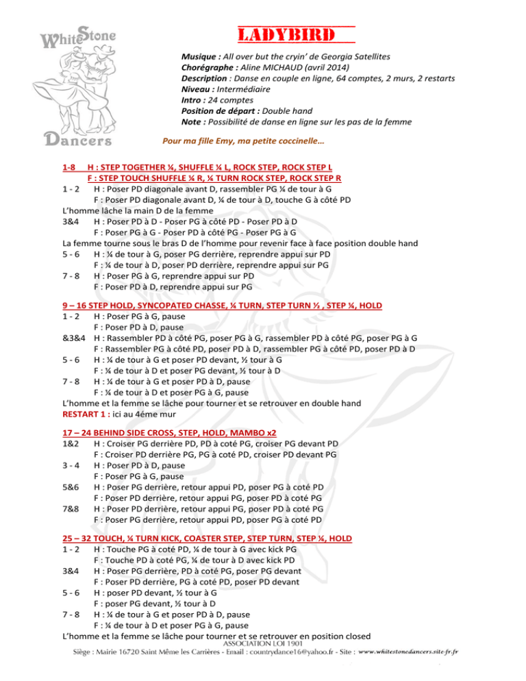 LADYBIRD Musique : All over but the cryin’ de Georgia Satellites Chorégraphe : Aline MICHAUD (avril 2014) Description : Danse en couple en ligne, 64 comptes, 2 murs, 2 restarts Niveau : Intermédiaire Intro : 24 comptes Position de départ : Double hand Note : Possibilité de danse en ligne sur les pas de la femme Pour ma fille Emy, ma petite coccinelle… 1-8 H : STEP TOGETHER ¼, SHUFFLE ¼ L, ROCK STEP, ROCK STEP L F : STEP TOUCH SHUFFLE ¼ R, ¼ TURN ROCK STEP, ROCK STEP R 1 - 2 H : Poser PD diagonale avant D, rassembler PG ¼ de tour à G F : Poser PD diagonale avant D, ¼ de tour à D, touche G à côté PD L’homme lâche la main D de la femme 3&4 H : Poser PD à D - Poser PG à côté PD - Poser PD à D F : Poser PG à G - Poser PD à côté PG - Poser PG à G La femme tourne sous le bras D de l’homme pour revenir face à face position double hand 5 - 6 H : ¼ de tour à G, poser PG derrière, reprendre appui sur PD F : ¼ de tour à D, poser PD derrière, reprendre appui sur PG 7 - 8 H : Poser PG à G, reprendre appui sur PD F : Poser PD à D, reprendre appui sur PG 9 – 16 STEP HOLD, SYNCOPATED CHASSE, ¼ TURN, STEP TURN ½ , STEP ¼, HOLD 1 - 2 H : Poser PG à G, pause F : Poser PD à D, pause &3&4 H : Rassembler PD à côté PG, poser PG à G, rassembler PD à côté PG, poser PG à G F : Rassembler PG à côté PD, poser PD à D, rassembler PG à côté PD, poser PD à D 5 - 6 H : ¼ de tour à G et poser PD devant, ½ tour à G F : ¼ de tour à D et poser PG devant, ½ tour à D 7 - 8 H : ¼ de tour à G et poser PD à D, pause F : ¼ de tour à D et poser PG à G, pause L’homme et la femme se lâche pour tourner et se retrouver en double hand RESTART 1 : ici au 4éme mur 17 – 24 BEHIND SIDE CROSS, STEP, HOLD, MAMBO x2 1&2 H : Croiser PG derrière PD, PD à coté PG, croiser PG devant PD F : Croiser PD derrière PG, PG à coté PD, croiser PD devant PG 3 - 4 H : Poser PD à D, pause F : Poser PG à G, pause 5&6 H : Poser PG derrière, retour appui PD, poser PG à coté PD F : Poser PD derrière, retour appui PG, poser PD à coté PG 7&8 H : Poser PD derrière, retour appui PG, poser PD à coté PG F : Poser PG derrière, retour appui PD, poser PG à coté PD 25 – 32 TOUCH, ¼ TURN KICK, COASTER STEP, STEP TURN, STEP ¼, HOLD 1 - 2 H : Touche PG à coté PD, ¼ de tour à G avec kick PG F : Touche PD à coté PG, ¼ de tour à D avec kick PD 3&4 H : Poser PG derrière, PD à coté PG, poser PG devant F : Poser PD derrière, PG à coté PD, poser PD devant 5 - 6 H : poser PD devant, ½ tour à G F : poser PG devant, ½ tour à D 7 - 8 H : ¼ de tour à G et poser PD à D, pause F : ¼ de tour à D et poser PG à G, pause L’homme et la femme se lâche pour tourner et se retrouver en position closed 33 – 40 ROCK STEP, SHUFFLE, WALK, WALK, SHUFFLE 1 - 2 H : Poser PG devant, retour appui PD F : Poser PD derrière, retour appui PG 3&4 H : Poser PG derrière, PD à coté PG, poser PG derrière F : Poser PD devant, PG à coté PD, poser PD devant 5 - 6 H : Pas marchés arrière PD, PG F : Pas marchés devant PG, PD 7&8 H : Poser PD derrière, PG à coté PD, poser PD derrière F : Poser PG devant, PD à coté PG, poser PG devant 41 – 48 SWEEP, SHUFFLE, WALK, WALK, SHUFFLE 1 - 2 H : Mouvement du PG en arc-de-cercle de l’arrière vers l’avant F : Mouvement du PD en arc-de-cercle de l’avant vers l’arrière 3&4 H : Poser PG devant, PD à coté PG, poser PG devant F : Poser PD derrière, PG à coté PD, poser PD derrière 5 - 6 H : Pas marchés devant PD, PG F : Pas marchés derrière PG, PD 7&8 H : Poser PD devant, PG à coté PD, poser PD devant F : Poser PG derrière, PD à coté PG, poser PG derrière 49 – 56 H : ROCK STEP, SHUFFLE LEFT, ROCK STEP, STEP, HOLD F : ROCK STEP, SHUFFLE RIGHT, ¼ TURN, STEP TURN ½ , STEP ¼, HOLD 1 - 2 H : Poser PG devant, retour appui PD F : Poser PD derrière, retour appui PG 3&4 H : Poser PG à G - Poser PD à côté PG - Poser PG à G F : Poser PD à D - Poser PG à côté PD - Poser PD à D 5 - 6 H : Poser PD derrière, retour appui PG F : ¼ de tour à D et poser PG devant, ½ tour à D 7 - 8 H : Poser PD à D, pause F : ¼ de tour à D et poser PG à G, pause L’homme fait passer la femme sous sont bras gauche pour revenir face à face position double hand 57 – 64 MAMBO x2, TOUCH SIDE x2, STOMP x2 1&2 H : Poser PG derrière, retour appui PD, poser PG à coté PD F : Poser PD derrière, retour appui PG, poser PD à coté PG 3&4 H : Poser PD derrière, retour appui PG, poser PD à coté PG F : Poser PG derrière, retour appui PD, poser PG à coté PD RESTART 2 : ici au 6éme mur 5&6& H : Pointe PG à G, PG à coté PD, Pointe PD à D, PD à coté PG F : Pointe PD à D, PD à coté PG, Pointe PG à G, PG à coté PD 7 - 8 H : Stomp PG à coté PD x2 F : Stomp PD à coté PG x2 RESTART 1 : 4éme mur après le 16éme compte, reprendre la danse au début RESTART 2 : 6éme mur après le 60éme compte, reprendre la danse au début ET N’OUBLIEZ PAS DE SOURIRE !!!