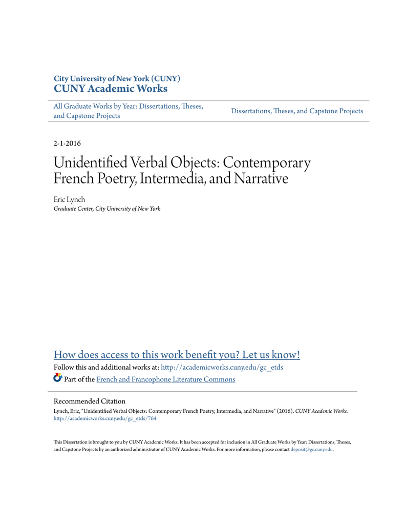 City University of New York (CUNY) CUNY Academic Works All Graduate Works by Year: Dissertations, Theses, and Capstone Projects Dissertations, Theses, and Capstone Projects 2-1-2016 Unidentified Verbal Objects: Contemporary French Poetry, Intermedia, and Narrative Eric Lynch Graduate Center, City University of New York How does access to this work benefit you? Let us know! Follow this and additional works at: http://academicworks.cuny.edu/gc_etds Part of the French and Francophone Literature Commons Recommended Citation Lynch, Eric, "Unidentified Verbal Objects: Contemporary French Poetry, Intermedia, and Narrative" (2016). CUNY Academic Works. http://academicworks.cuny.edu/gc_etds/764 This Dissertation is brought to you by CUNY Academic Works. It has been accepted for inclusion in All Graduate Works by Year: Dissertations, Theses, and Capstone Projects by an authorized administrator of CUNY Academic Works. For more information, please contact [email protected]. UNIDENTIFIED VERBAL OBJECTS: CONTEMPORARY FRENCH POETRY, INTERMEDIA, AND NARRATIVE by ERIC LYNCH A dissertation submitted to the Graduate Faculty in History in partial fulfillment of the requirements for the degree of Doctor of Philosophy, The City University of New York 2016 © 2016 Eric Lynch All Rights Reserved Lynch ii UNIDENTIFIED VERBAL OBJECTS: CONTEMPORARY FRENCH POETRY, INTERMEDIA, AND NARRATIVE by Eric Lynch This manuscript has been read and accepted for the Graduate Faculty in French to satisfy the dissertation requirement for the degree of Doctor of Philosophy. January 26, 2016 ____________________________________ Mary Ann Caws Chair of Examining Committee January 26, 2016 ____________________________________ Francesca Sautman Executive Officer ____________________________________ Peter Consenstein ____________________________________ Evelyne Ender Supervisory Committee THE CITY UNIVERSITY OF NEW YORK Lynch iii Abstract UNIDENTIFIED VERBAL OBJECTS: CONTEMPORARY FRENCH POETRY, INTERMEDIA, AND NARRATIVE By Eric Lynch Adviser: Mary Ann Caws This dissertation examines the vital experimental French poetry of the 1980s to the present. Whereas earlier twentieth century poets often shunned common speech, poets today seek instead to appropriate, adapt, and reorganize a wide variety of contemporary discourses. Narrative also reemerges both in hybridized writing fusing prose and verse and in sequences of digressions and anecdotes. Poetic form becomes specific to a given text as poets adapt techniques from other fields, such as the visual arts, and integrate a wide array of media into literary works. In recent pieces, poets such as Emmanuel Hocquard and Olivier Cadiot incorporate new media into works that move literature from the book to video and performance spaces. I argue that these new poetic activities challenge traditional definitions of poetry as lyrical expression through formal innovation and alternative concepts of identity and affect. Lynch iv Acknowledgements This dissertation features material adapted from published articles. A section of chapter three has been adapted as an article entitled, “Olivier Cadiot’s Robinson, or A Portrait of the Artist as ‘Auto–usine,’”L’Esprit créateur. 54.1 (2014): 86-99. Print. A portion of chapter four has been adapted as an article entitled, “Nathalie Quintane: « Nous », le peuple,” Marges. (2015): 96-105. Print. Lynch v Table of Contents I. Introduction. p. 1. II. Chapter One: Emmanuel Hocquard: Towards a Grammar of Intermedia Poetics. p. 39. III. Chaper Two: Jean-Marie Gleize and the Site of the Enigma. p. 93. IV. Chapter Three: Olivier Cadiot, or A Portrait of the Artist as “Auto-usine.” p. 136. V. Chapter Four: Nathalie Quintane: Poetry as Political Speculation. p. 181. VI. Conclusion: Passages between Poetry and the Visual Arts. p. 229. VII. Bibliography. p. 242. Lynch vi Lists of Figures Figure 1: Hocquard, Emmanuel, and Juliette Valéry. Le Commanditaire. Paris: P.O.L, 1993. Print. Unpaginated. Figure 2: Ibid. Unpaginated. Figure 3: Ibid. Unpaginated. Figure 4: Hocquard, Emmanuel, and Alexandre Delay. Le Voyage à Reykjavik : Chronique. Paris: P.O.L, 1997. Print, ii. Figure 5: Ibid. 47-49; 52. Figure 6: Ibid. 68-9. Figure 7: Gleize, Jean-Marie. Néon, actes et légendes. Paris: Seuil, 2004. Print, 94-5. Figure 8: Gleize, Jean-Marie. Tanac, un acte préparatoire. Paris: Seuil, 2011. Print, 40-1. Figure 9: Cadiot, Olivier. Un mage en été. Paris: P.O.L., 2010. Print, 90-1. Figure 10: Ibid. 142-3; 150-1. Figure 11: Guerrin, Michel (text) and Zaouar, Hocine (photograph). “Une madone en enfer,” Le Monde. 26 September 1997. Print. Figure 12: L’Express. August 1972. Photograph. Lynch vii Introduction Poetry in the Age of the OVNI Contemporary French Poetry This dissertation examines the vital experimental French poetry of the 1980s to the present. Whereas earlier twentieth century poets often shunned common speech, many poets today seek instead to appropriate, adapt, and reorganize a wide variety of contemporary discourses. Narrative also reemerges both in hybridized writing fusing prose and verse and in sequences of digressions and anecdotes. Poetic form becomes specific to a given text as poets adapt techniques from other fields, such as the visual arts, and integrate a wide array of media into literary works. In recent works, poets such as Emmanuel Hocquard and Olivier Cadiot incorporate new media into pieces that move literature from the book to video and performance spaces. These new poetic creations have garnered the name OVNIs, the French for UFO, for their radical formal experimentation. In the short-lived journal Revue de littérature générale (RLG, 1995-6), editors Olivier Cadiot and Pierre Alferi theorize the assembly of literary constructs outside of preexisting forms, naming the resulting works “unidentified verbal objects (Objets verbaux non-identifié or OVNI).” These works operate fusions of texts from a range of registers alongsi