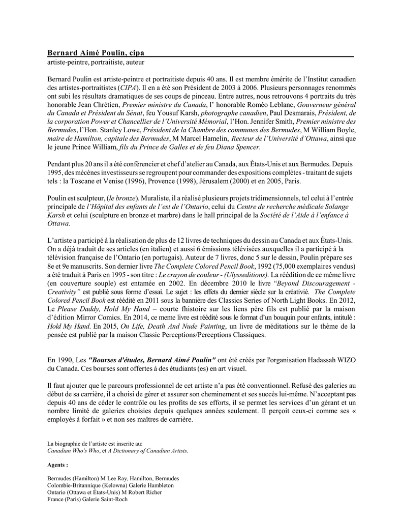B ernard A im é Poulin, cipa artiste-peintre, portraitiste, auteur Bernard Poulin est artiste-peintre et portraitiste depuis 40 ans. Il est membre émérite de l’Institut canadien des artistes-portraitistes (CIPA). Il en a été son Président de 2003 à 2006. Plusieurs personnages renommés ont subi les résultats dramatiques de ses coups de pinceau. Entre autres, nous retrouvons 4 portraits du très honorable Jean Chrétien, Premier ministre du Canada, l’ honorable Roméo Leblanc, Gouverneur général du Canada et Président du Sénat, feu Yousuf Karsh, photographe canadien, Paul Desmarais, Président, de la corporation Power et Chancellier de l’Université Mémorial, l’Hon. Jennifer Smith, Premier ministre des Bermudes, l’Hon. Stanley Lowe, Président de la Chambre des communes des Bermudes, M William Boyle, maire de Hamilton, capitale des Bermudes, M Marcel Hamelin, Recteur de l’Université d’Ottawa, ainsi que le jeune Prince William, fils du Prince de Galles et de feu Diana Spencer. Pendant plus 20 ans il a été conférencier et chef d’atelier au Canada, aux États-Unis et aux Bermudes. Depuis 1995, des mécènes investisseurs se regroupent pour commander des expositions complètes - traitant de sujets tels : la Toscane et Venise (1996), Provence (1998), Jérusalem (2000) et en 2005, Paris. Poulin est sculpteur, (le bronze). Muraliste, il a réalisé plusieurs projets tridimensionnels, tel celui à l’entrée principale de l’Hôpital des enfants de l’est de l’Ontario, celui du Centre de recherche médicale Solange Karsh et celui (sculpture en bronze et marbre) dans le hall principal de la Société de l’Aide à l’enfance à Ottawa. L’artiste a participé à la réalisation de plus de 12 livres de techniques du dessin au Canada et aux États-Unis. On a déjà traduit de ses articles (en italien) et aussi 6 émissions télévisées auxquelles il a participé à la télévision française de l’Ontario (en portugais). Auteur de 7 livres, donc 5 sur le dessin, Poulin prépare ses 8e et 9e manuscrits. Son dernier livre The Complete Colored Pencil Book, 1992 (75,000 exemplaires vendus) a été traduit à Paris en 1995 - son titre : Le crayon de couleur - (Ulysseditions). La réédition de ce même livre (en couverture souple) est entamée en 2002. En décembre 2010 le livre “Beyond Discouragement Creativity” est publié sous forme d’essai. Le sujet : les effets du dernier siècle sur la créativié. The Complete Colored Pencil Book est réédité en 2011 sous la bannière des Classics Series of North Light Books. En 2012, Le Please Daddy, Hold My Hand – courte fhistoire sur les liens père fils est publié par la maison d’édition Mirror Comics. En 2014, ce meme livre est réédité sous le format d’un bouquin pour enfants, intitulé : Hold My Hand. En 2015, On Life, Death And Nude Painting, un livre de méditations sur le thème de la pensée est publié par la maison Classic Perceptions/Perceptions Classiques. En 1990, Les "Bourses d'études, Bernard Aimé Poulin" ont été créés par l'organisation Hadassah WIZO du Canada. Ces bourses sont offertes à des étudiants (es) en art visuel. Il faut ajouter que le parcours professionnel de cet artiste n’a pas été conventionnel. Refusé des galeries au début de sa carrière, il a choisi de gérer et assurer son cheminement et ses succès lui-même. N’acceptant pas depuis 40 ans de céder le contrôle ou les profits de ses efforts, il se permet les services d’un gérant et un nombre limité de galeries choisies depuis quelques années seulement. Il perçoit ceux-ci comme ses « employés à forfait » et non ses maîtres de carrière. La biographie de l’artiste est inscrite au: Canadian Who's Who, et A Dictionary of Canadian Artists. Agents : Bermudes (Hamilton) M Lee Ray, Hamilton, Bermudes Colombie-Britannique (Kelowna) Galerie Hambleton Ontario (Ottawa et États-Unis) M Robert Richer France (Paris) Galerie Saint-Roch Bernard Aimé Poulin est né à Windsor en Ontario (1945) et est présentement résidant d’Ottawa. Il est l’époux de l’honorable MariePaule (Charette) Poulin, Sénateur. Ils ont deux filles adultes, Elaine et Valérie. Pour de plus amples renseignements : www.poulinstudios.com - 613-526-3634 - [email protected] Portraits Officiels (Liste alphabétique) Bailey Donovan, Surin Bruny, Esmie Robert, Gilbert Glenroy - Gagnants de la médaille d’or aux Jeux olympiques d’Atlanta, (Course de relais - 1996) # Portrait officiel de l’équipe de relais # Collection d’Athletics Canada, Toronto Belisle Rhéal, l’Honorable, Sénateur, Canada # Portraits: (2 commandes privées) # Collection de la famille Belisle Boudria Don l’honorable, Membre du Parlement canadien et Ministre # Portrait # Collection de la famille Boudria Boyle William, Maire de la ville capitale: Hamilton, Bermudes # Portrait officiel # Collection de la ville de Hamilton Brown Evans, Lois, Dame, DBE, MP, Première avocate noire et première femme Procureur générale des Bermudes # Portrait officiel # Collection du Gouvernement des Bermudes Carty A. Dr., Président du Conseil national de la recherche du Canada # Portrait officiel # Collection du Conseil de la recherche nationale du Canada Clark Peter, Président de la Region Municipale d’Ottawa-Carleton # Portrait officiel # Collection de la ville d’Ottawa Desmarais Paul, Power Corporation; (Chancelier de l’Université Memorial), St-John, Newfoundland # Portrait officiel # Collection de l’Université Memorial, St-Johns, Newfoundland Desmarais Robert C., l’Honorable, Juge sénior de la cour de justice de l’Ontario, dividion générale. # Portrait # Collection du Juge et de Mme R. Desmarais De Vinck Jose, Baron, Auteur et traducteur de langues classiques, New Jersey. # Portrait # Collection de la famille du Baron de Vinck. Eves, Ernie, L’hon. Premier ministre de l’Ontario # Portrait officiel # Collection du gouvernement de l’Ontario Just