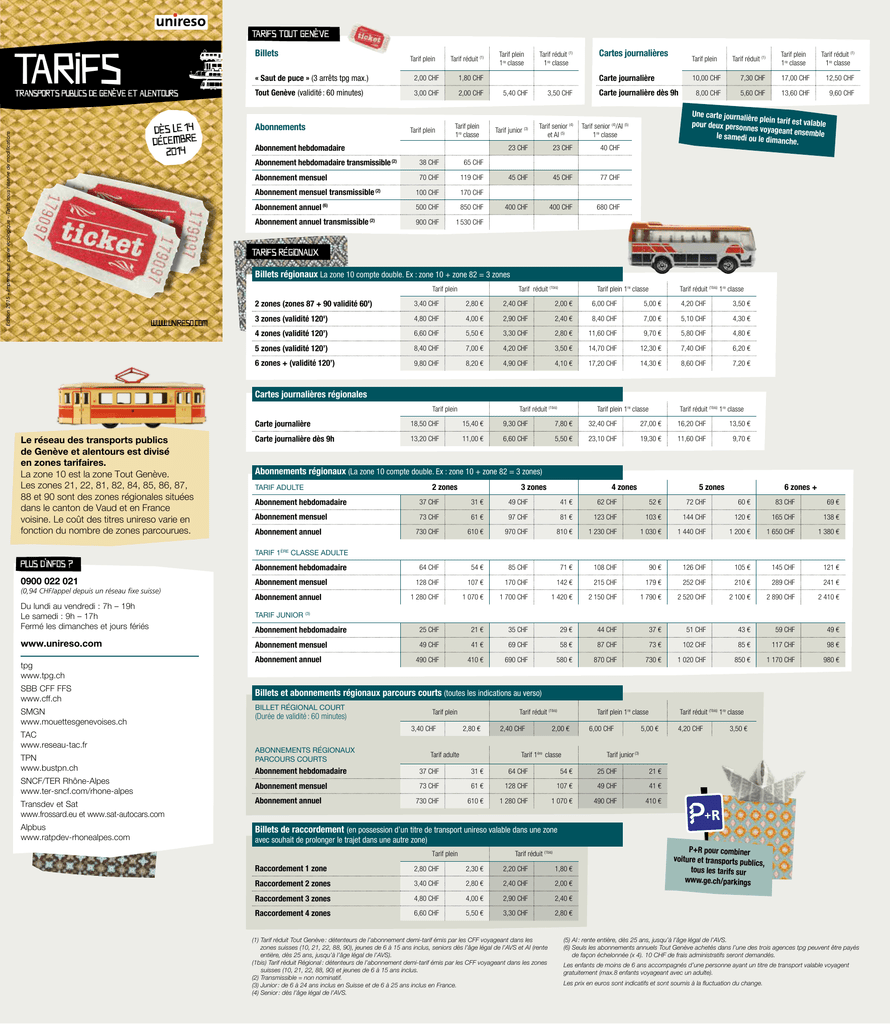 Tarifs Tout Genève Tarifs Billets TRANSPORTS PUBLICS DE GENÈVE ET ALENTOURS Edition 2015 - Imprimé sur papier écologique - Tarifs sous réserve de modifications Dès le 4 décemBre 20 4 Tarif plein Tarif réduit (1) « Saut de puce » (3 arrêts tpg max.) 2,00 CHF 1,80 CHF Tout Genève (validité : 60 minutes) 3,00 CHF 2,00 CHF Abonnements Tarif plein Tarif plein 1re classe Abonnement hebdomadaire Abonnement hebdomadaire transmissible (2) Abonnement mensuel 38 CHF Tarif plein 1re classe Tarif réduit (1) 1re classe Cartes journalières Tarif plein Carte journalière Carte journalière dès 9h 5,40 CHF 3,50 CHF Tarif junior (3) Tarif senior (4) et AI (5) 23 CHF 23 CHF 40 CHF 45 CHF 45 CHF 77 CHF 400 CHF 400 CHF 680 CHF Tarif réduit (1) Tarif plein 1re classe Tarif réduit (1) 1re classe 10,00 CHF 7,30 CHF 17,00 CHF 12,50 CHF 8,00 CHF 5,60 CHF 13,60 CHF 9,60 CHF Une carte journaliè re plein tarif est va lable pour deux personn es voyageant ense mble le samedi ou le dim anche. Tarif senior (4)/AI (5) 1re classe 65 CHF 70 CHF 119 CHF Abonnement mensuel transmissible (2) 100 CHF 170 CHF Abonnement annuel (6) 500 CHF 850 CHF Abonnement annuel transmissible (2) 900 CHF 1 530 CHF Tarifs régionaux Billets régionaux La zone 10 compte double. Ex : zone 10 + zone 82 = 3 zones Tarif plein WWW.UNIRESO.COM Tarif réduit (1bis) Tarif plein 1re classe Tarif réduit (1bis) 1re classe 2 zones (zones 87 + 90 validité 60') 3,40 CHF 2,80 € 2,40 CHF 2,00 € 6,00 CHF 5,00 € 4,20 CHF 3,50 € 3 zones (validité 120') 4,80 CHF 4,00 € 2,90 CHF 2,40 € 8,40 CHF 7,00 € 5,10 CHF 4,30 € 4 zones (validité 120’) 6,60 CHF 5,50 € 3,30 CHF 2,80 € 11,60 CHF 9,70 € 5,80 CHF 4,80 € 5 zones (validité 120’) 8,40 CHF 7,00 € 4,20 CHF 3,50 € 14,70 CHF 12,30 € 7,40 CHF 6,20 € 6 zones + (validité 120’) 9,80 CHF 8,20 € 4,90 CHF 4,10 € 17,20 CHF 14,30 € 8,60 CHF 7,20 € Cartes journalières régionales Tarif plein Le réseau des transports publics de Genève et alentours est divisé en zones tarifaires. La zone 10 est la zone Tout Genève. Les zones 21, 22, 81, 82, 84, 85, 86, 87, 88 et 90 sont des zones régionales situées dans le canton de Vaud et en France voisine. Le coût des titres unireso varie en fonction du nombre de zones parcourues. Tarif réduit (1bis) Tarif plein 1re classe Tarif réduit (1bis) 1re classe Carte journalière 18,50 CHF 15,40 € 9,30 CHF 7,80 € 32,40 CHF 27,00 € 16,20 CHF 13,50 € Carte journalière dès 9h 13,20 CHF 11,00 € 6,60 CHF 5,50 € 23,10 CHF 19,30 € 11,60 CHF 9,70 € 41 € 62 CHF 52 € 72 CHF Abonnements régionaux (La zone 10 compte double. Ex : zone 10 + zone 82 = 3 zones) 2 zones TARIF ADULTE Abonnement hebdomadaire Abonnement mensuel Abonnement annuel 37 CHF 3 zones 31 € 4 zones 49 CHF 5 zones 6 zones + 60 € 83 CHF 69 € 73 CHF 61 € 97 CHF 81 € 123 CHF 103 € 144 CHF 120 € 165 CHF 138 € 730 CHF 610 € 970 CHF 810 € 1 230 CHF 1 030 € 1 440 CHF 1 200 € 1 650 CHF 1 380 € TARIF 1ÈRE CLASSE ADULTE Plus d’infos ? Abonnement hebdomadaire 0900 022 021 Abonnement mensuel (0,94 CHF/appel depuis un réseau fixe suisse) Abonnement annuel 64 CHF 54 € 85 CHF 71 € 108 CHF 90 € 126 CHF 105 € 145 CHF 121 € 128 CHF 107 € 170 CHF 142 € 215 CHF 179 € 252 CHF 210 € 289 CHF 241 € 1 280 CHF 1 070 € 1 700 CHF 1 420 € 2 150 CHF 1 790 € 2 520 CHF 2 100 € 2 890 CHF 2 410 € Du lundi au vendredi : 7h – 19h Le samedi : 9h – 17h Fermé les dimanches et jours fériés TARIF JUNIOR Abonnement hebdomadaire 25 CHF 21 € 35 CHF 29 € 44 CHF 37 € 51 CHF 43 € 59 CHF 49 € www.unireso.com Abonnement mensuel 49 CHF 41 € 69 CHF 58 € 87 CHF 73 € 102 CHF 85 € 117 CHF 98 € 490 CHF 410 € 690 CHF 580 € 870 CHF 730 € 1 020 CHF 850 € 1 170 CHF 980 € tpg www.tpg.ch SBB CFF FFS www.cff.ch SMGN www.mouettesgenevoises.ch TAC www.reseau-tac.fr TPN www.bustpn.ch SNCF/TER Rhône-Alpes www.ter-sncf.com/rhone-alpes (3) Abonnement annuel Billets et abonnements régionaux parcours courts (toutes les indications au verso) BILLET RÉGIONAL COURT Tarif plein (Durée de validité : 60 minutes) 3,40 CHF ABONNEMENTS RÉGIONAUX PARCOURS COURTS Abonnement hebdomadaire Abonnement mensuel Tarif réduit (1bis) 2,80 € Tarif adulte 37 CHF 2,40 CHF Tarif plein 1re classe 2,00 € Tarif 1ère classe 31 € 64 CHF 6,00 CHF Tarif réduit (1bis) 1re classe 5,00 € 25 CHF 21 € 73 CHF 61 € 128 CHF 107 € 49 CHF 41 € 730 CHF 610 € 1 280 CHF 1 070 € 490 CHF 410 € Transdev et Sat www.frossard.eu et www.sat-autocars.com Alpbus www.ratpdev-rhonealpes.com Billets de raccordement (en possession d’un titre de transport unireso valable dans une zone avec souhait de prolonger le trajet dans une autre zone) Tarif plein Tarif réduit (1bis) Raccordement 1 zone 2,80 CHF 2,30 € 2,20 CHF 1,80 € Raccordement 2 zones 3,40 CHF 2,80 € 2,40 CHF 2,00 € Raccordement 3 zones 4,80 CHF 4,00 € 2,90 CHF 2,40 € Raccordement 4 zones 6,60 CHF 5,50 € 3,30 CHF 2,80 € (1) T arif réduit Tout Genève : détenteurs de l’abonnement demi-tarif émis par les CFF voyageant dans les zones suisses (10, 21, 22, 88, 90), jeunes de 6 à 15 ans inclus, seniors dès l’âge légal de l’AVS et AI (rente entière, dès 25 ans, jusqu’à l’âge légal de l’AVS). (1bis) Tarif réduit Régional : détenteurs de l’abonnement demi-tarif émis par les CFF voyageant dans les zones suisses (10, 21, 22, 88, 90) et jeunes de 6 à 15 ans inclus. (2) Transmissible = non nominatif. (3) Junior : de 6 à 24 ans inclus en Suisse et de 6 à 25 ans inclus en France. (4) Senior : dès l’âge légal de l’AVS. 3,50 € Tarif junior (3) 54 € Abonnement annuel 4,20 CHF P+R pour combiner voiture et transports publics , tous les tarifs sur www.ge.ch/parkings (5) AI : rente entière, dès 25 ans, jusqu’à l’âge légal de l’AVS. (6) Seuls les abonnements annuels Tout Genève achetés dans l’une des trois agences tpg peuvent être pay