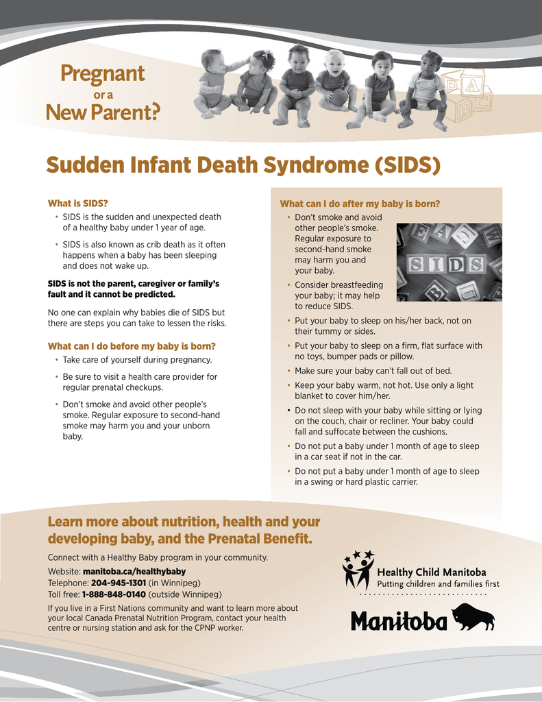 Sudden Infant Death Syndrome (SIDS) What is SIDS? đƫ SIDS is the sudden and unexpected death of a healthy baby under 1 year of age. đƫ SIDS is also known as crib death as it often happens when a baby has been sleeping and does not wake up. SIDS is not the parent, caregiver or family’s fault and it cannot be predicted. No one can explain why babies die of SIDS but there are steps you can take to lessen the risks. What can I do before my baby is born? đƫ Take care of yourself during pregnancy. đƫ Be sure to visit a health care provider for regular prenatal checkups. đƫ Don’t smoke and avoid other people’s smoke. Regular exposure to second-hand smoke may harm you and your unborn baby. What can I do after my baby is born? đƫ Don’t smoke and avoid other people’s smoke. Regular exposure to second-hand smoke may harm you and your baby. đƫ Consider breastfeeding your baby; it may help to reduce SIDS. đƫ Put your baby to sleep on his/her back, not on their tummy or sides. đƫ Put your baby to sleep on a firm, flat surface with no toys, bumper pads or pillow. đƫ Make sure your baby can’t fall out of bed. đƫ Keep your baby warm, not hot. Use only a light blanket to cover him/her. đƫ +ƫ*+0ƫ/(!!,ƫ3%0$ƫ5+1.ƫ5ƫ3$%(!ƫ/%00%*#ƫ+.ƫ(5%*#ƫ on the couch, chair or recliner. Your baby could fall and suffocate between the cushions. đƫ Do not put a baby under 1 month of age to sleep in a car seat if not in the car. đƫ Do not put a baby under 1 month of age to sleep in a swing or hard plastic carrier. Learn more about nutrition, health and your developing baby, and the Prenatal Benefit. Connect with a Healthy Baby program in your community. Website: manitoba.ca/healthybaby Telephone: 204-945-1301 (in Winnipeg) Toll free: 1-888-848-0140 (outside Winnipeg) If you live in a First Nations community and want to learn more about your local Canada Prenatal Nutrition Program, contact your health centre or nursing station and ask for the CPNP worker. Vous êtes enceinte ou vous venez d’avoir un enfant? Syndrome de la mort subite du nourrisson (SMSN) Qu’est-ce que le SMSN? đƫ !ƫ/5* .+)!ƫ !ƫ(ƫ)+.0ƫ/1%0!ƫ 1ƫ*+1..%//+*ƫƫ !/0ƫ(ƫ)+.0ƫ/+1 %*!ƫ!0ƫ%),.h21!ƫ Ě1*ƫ*+1..%//+*ƫ !*ƫ+**!ƫ/*0hƫ>#hƫ !ƫ)+%*/ƫ Ě1*ƫ*ċ đƫ *ƫ,.(!ƫ1//%ƫ !ƫ)+.0ƫ1ƫ!.!1ƫ,.!ƫ-1!ƫƫ (!ƫƫ/!ƫ,.+ 1%0ƫ/+12!*0ƫ(+./-1Ě1*ƫhhƫƫ +.0ƫ!0ƫ*!ƫ/!ƫ.h2!%((!ƫ,/ċ Le SMSN n’est pas la faute des parents, des fournisseurs de soins ou de la famille et il est imprévisible. !./+**!ƫ*!ƫ,!10ƫ!4,(%-1!.ƫ,+1.-1+%ƫ(!/ƫhh/ƫ )!1.!*0ƫ 1ƫČƫ)%/ƫ!.0%*!/ƫ)!/1.!/ƫ,!12!*0ƫ n0.!ƫ,.%/!/ƫ,+1.ƫ.h 1%.!ƫ(!/ƫ.%/-1!/ċ Que puis-je faire avant la naissance de mon bébé? đƫ .!*!6ƫ/+%*/ƫ !ƫ2+1/ƫ,!* *0ƫ(ƫ#.+//!//!ċ đƫ ((!6ƫ2+%.ƫ.h#1(%t.!)!*0ƫ1*ƫ"+1.*%//!1.ƫ !ƫ/+%*/ƫ !ƫ/*0hƫ,+1.ƫ2+/ƫ!4)!*/ƫ,.h*014ċ đƫ !ƫ"1)!6ƫ,/ƫ!0ƫh2%0!6ƫ(ƫ"1)h!ƫ !/ƫ10.!/ċƫ Ě!4,+/%0%+*ƫ.h#1(%t.!ƫHƫ(ƫ"1)h!ƫ/!+* %.!ƫƫ ,!10ƫn0.!ƫ*+%2!ƫ,+1.ƫ2+1/ƫ!0ƫ,+1.ƫ2+0.!ƫhhċ Que puis-je faire après la naissance de mon bébé? đƫ !ƫ"1)!6ƫ,/ƫ!0ƫh2%0!6ƫ(ƫ"1)h!ƫ !/ƫ10.!/ċ đƫ Ě!4,+/%0%+*ƫ.h#1(%t.!ƫHƫ(ƫ "1)h!ƫ/!+* %.!ƫ,!10ƫn0.!ƫ *+%2!ƫ,+1.ƫ2+1/ƫ!0ƫ,+1.ƫ 2+0.!ƫhhċ đƫ +*#!6ƫHƫ((%0!.ƫ2+0.!ƫƫ hhĎƫ!(ƫ,+1..%0ƫ.h 1%.!ƫƫ (!ƫ.%/-1!ƫ !ƫċ đƫ %0!/ƫ +.)%.ƫ2+0.!ƫhhƫ/1.ƫ (!ƫ +/ƫ!0ƫ*+*ƫ,/ƫ/1.ƫ(!ƫ2!*0.!ƫ+1ƫ/1.ƫ(!ƫ¬0hċ đƫ %0!/ƫ +.)%.ƫ2+0.!ƫhhƫ/1.ƫ1*!ƫ/1."!ƫ,(0!ƫ!0ƫ"!.)!Čƫ /*/ƫ&+1!0Čƫ/*/ƫ+. 1.!ƫ !ƫ,.+0!0%+*ƫ!0ƫ/*/ƫ+.!%((!.ċ đƫ //1.!6ġ2+1/ƫ-1!ƫ2+0.!ƫhhƫ*!ƫ,!10ƫ,/ƫ0+)!.ƫ 1ƫ(%0ċ đƫ . !6ƫ2+0.!ƫhhƫ1ƫ$1 Čƫ)%/ƫ/*/ƫ-1Ě%(ƫ%0ƫ0.+,ƫ $1 ċƫ+12.!6ġ(!ƫ Ě1*!ƫ+12!.01.!ƫ(h#t.!ċ đƫ (ƫ*!ƫ"10ƫ,/ƫ +)%.ƫ2!ƫ1*ƫhhƫ(+./-1Ě+*ƫ!/0ƫ//%/ƫƫ +1ƫ((+*#hƫ/1.ƫ1*ƫ*,hČƫ */ƫ1*ƫ"10!1%(ƫ+. %*%.!ƫƫ +1ƫ%*(%*(!ċƫ!ƫhhƫ,!10ƫ0+)!.ƫ!0ƫ/Ěh0+1û!.ƫƫ !*0.!ƫ(!/ƫ+1//%*/ċ đƫ !ƫ(%//!6ƫ,/ƫ1*ƫhhƫ !ƫ)+%*/ƫ Ě1*ƫ)+%/ƫ +.)%.ƫƫ */ƫ1*ƫ/%t#!ƫ Ě10+ƫ/%ƫ2+1/ƫ*Ěn0!/ƫ,/ƫ */ƫ(!ƫ2h$%1(!ċ đƫ !ƫ(%//!6ƫ,/ƫ1*ƫhhƫ !ƫ)+%*/ƫ Ě1*ƫ)+%/ƫ +.)%.ƫƫ */ƫ1*ƫ,+.0!ġhhƫ(*`+%.!ƫ+1ƫ!*ƫ,(/0%-1!ƫ 1.ċ Obtenez des renseignements sur la nutrition, la santé et le développement de votre bébé, ainsi que sur l’allocation prénatale. .+12!6ƫ1*ƫ,.+#.))!ƫhhƫ!*ƫ/*0hƫ */ƫ2+0.!ƫ+))1*10hċ %0!ƫ!ƫčƫmanitoba.ca/healthybabyƫ h(h,$+*!ƫčƫ204 945-1301 ĨHƫ%**%,!#ĩƫ */ƫ".%/ƫčƫ1 888 848-0140ƫĨHƫ(Ě!40h.%!1.ƫ !ƫ%**%,!#ĩ %ƫ2+1/ƫ2%2!6ƫ */ƫ1*!ƫ+))1*10hƫ !/ƫ.!)%t.!/ƫ*0%+*/ƫ!0ƫ-1!ƫ2+1/ƫƫ /+1$%0!6ƫ2+%.ƫ !/ƫ.!*/!%#*!)!*0/ƫ/1.ƫ2+0.!ƫ.+#.))!ƫ* %!*ƫ !ƫ *10.%0%+*ƫ,.h*0(!ƫ(+(Čƫ+))1*%-1!6ƫ2!ƫ2+0.!ƫ!*0.!ƫ !ƫ/*0hƫ+1ƫ2+0.!ƫ ,+/0!ƫ !ƫ/+%*/ƫ%*ü.)%!./ƫ!0ƫ !)* !6ƫHƫ,.(!.ƫHƫ1*ƫ!),(+5hƫ 1ƫċ