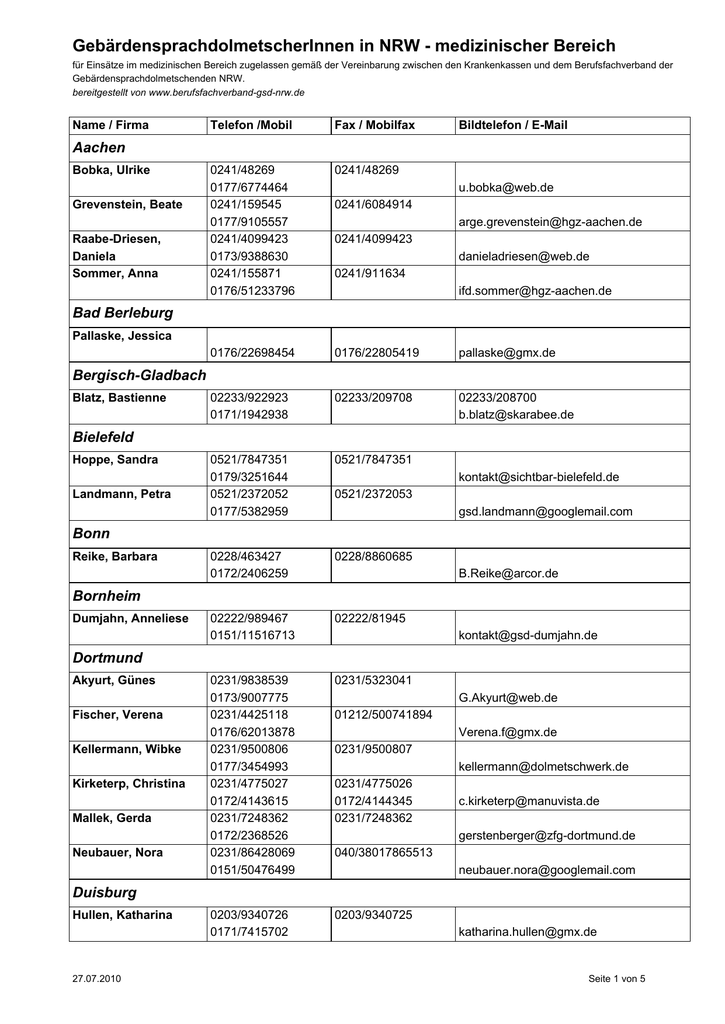 GebärdensprachdolmetscherInnen in NRW - medizinischer Bereich für Einsätze im medizinischen Bereich zugelassen gemäß der Vereinbarung zwischen den Krankenkassen und dem Berufsfachverband der Gebärdensprachdolmetschenden NRW. bereitgestellt von www.berufsfachverband-gsd-nrw.de Name / Firma Telefon /Mobil Fax / Mobilfax Bildtelefon / E-Mail 0241/48269 0177/6774464 0241/159545 0177/9105557 0241/4099423 0173/9388630 0241/155871 0176/51233796 0241/48269 0176/22698454 0176/22805419 [email protected] 02233/922923 0171/1942938 02233/209708 02233/208700 [email protected] 0521/7847351 0179/3251644 0521/2372052 0177/5382959 0521/7847351 0228/463427 0172/2406259 0228/8860685 02222/989467 0151/11516713 02222/81945 0231/9838539 0173/9007775 0231/4425118 0176/62013878 0231/9500806 0177/3454993 0231/4775027 0172/4143615 0231/7248362 0172/2368526 0231/86428069 0151/50476499 0231/5323041 0203/9340726 0171/7415702 0203/9340725 Aachen Bobka, Ulrike Grevenstein, Beate Raabe-Driesen, Daniela Sommer, Anna [email protected] 0241/6084914 [email protected] 0241/4099423 [email protected] 0241/911634 [email protected] Bad Berleburg Pallaske, Jessica Bergisch-Gladbach Blatz, Bastienne Bielefeld Hoppe, Sandra Landmann, Petra [email protected] 0521/2372053 [email protected] Bonn Reike, Barbara [email protected] Bornheim Dumjahn, Anneliese [email protected] Dortmund Akyurt, Günes Fischer, Verena Kellermann, Wibke Kirketerp, Christina Mallek, Gerda Neubauer, Nora [email protected] 01212/500741894 [email protected] 0231/9500807 [email protected] 0231/4775026 0172/4144345 0231/7248362 [email protected] [email protected] 040/38017865513 [email protected] Duisburg Hullen, Katharina 27.07.2010 [email protected] Seite 1 von 5 GebärdensprachdolmetscherInnen in NRW - medizinischer Bereich Name / Firma Telefon /Mobil Fax / Mobilfax 0203/3175363 0177/7639251 0203/3175363 02421/993085 0177/2875396 02233/922923 0173/7293470 02421/993086 Bildtelefon / E-Mail Duisburg Zeus, Judith [email protected] Düren Binczyk, Gisela Zymelka, Michael [email protected] 02233/209708 [email protected] Düsseldorf Coenen, Antje Hehl, Stephan Röper, Anja Söhn, Jennifer Widners, Monika Wünsch, Alexandra 0178/1812436 0178/1812436 0211/7308511 0162/4723093 0211/8309469 0176/23599382 0211/1742414 0179/1407029 0211/483774 0172/6494960 0211/1684035 0174/7932546 [email protected] 0211/7308511 [email protected] 0211/4167767 [email protected] 01212/538971847 [email protected] 0211/5145513 [email protected] 0211/1684035 [email protected] Emsdetten Sündermann, Matthias 02572/8779432 0173/5157781 02572/8779432 0173/5157782 [email protected] Essen Janouch, Karoline Klefeker, Stefanie 0201/5231043 0163/2438574 0201/8761810 0171/3565091 0201/8761809 0171/3565092 [email protected] 0201/8761810 [email protected] Mosquera, Jana-Aline Strube, Antje 0177/4131863 0201/84379103 0172/2441267 Tibo, Sandy [email protected] 0201/84379104 [email protected] 03221/1356121 0170/5429165 [email protected] Euskirchen Wolf, Jan Philipp 02251/5062101 0157/72774475 02251/5069617 0209/1551996 0172/2413010 0209/141391 oder 1552077 - 02181/4769925 0177/3216242 032121431911 [email protected] Gelsenkirchen Männel, Maren [email protected] Grevenbroich Schmelter, Heike 27.07.2010 [email protected] Seite 2 von 5 GebärdensprachdolmetscherInnen in NRW - medizinischer Bereich Name / Firma Telefon /Mobil Fax / Mobilfax 02364/949412 0173/2903553 02364/949510 02381/2798548 0172/2764230 03212/1065090 02233/994303 0174/9898571 02233/994304 Bildtelefon / E-Mail Haltern am See Lorenz, Alexandra [email protected] Hamm Osthof, Stefanie [email protected] Hürth Walenski, Monika [email protected] Iserlohn van Ophuysen, Frauke 02371/22893 0160/95316295 02371/22893 [email protected] Kleve Lange, Svenja 0176/24961527 [email protected] 0176/20176649 [email protected] Koblenz Vöcking, Urte Köln Ackers, Aline Binczyk, Simone Blatz, Bastienne Funk, Dorothea Kahl, Ramona Klante, Katarina Klante, Katarina 0221/5607006 0177/4931843 0221/8004155 0177/2875397 02233/922923 0171/1942938 02233/922923 0177/3192409 0221/6160445 0160/92147992 0172/2707356 0176'/63141533 02233/922923 0221/5607007 0221/248340 0162/8966479 02233/922923 0172/2477317 02233/922923 0172/2707273 02233/922923 0173/7293470 0221/248340 02151/773483 0173/5253099 02151/773483 [email protected] 0221/8004156 02233/209708 [email protected] 02233/208700 [email protected] 02233/209708 [email protected] [email protected] [email protected] 02233/209708 [email protected] Meinicke, Britta Meisen, Magdalena Werner, Stefanie Zymelka, Michael 02233/209708 [email protected] 02233/208700 [email protected] 02233/209708 [email protected] 02233/209708 [email protected] Krefeld Syrzisko, Ursel 27.07.2010 gebaerdendolmetsch.u.syrzisko@t-online. de Seite 3 von 5 GebärdensprachdolmetscherInnen in NRW - medizinischer Bereich Name / Firma Telefon /Mobil Fax / Mobilfax Bildtelefon / E-Mail 02422/904244 0172/2477317 02422/3882 02422/904244 [email protected] 05483/749246 0171/3151451 05483/749245 0171/1801803 Kreuzau / bei Düren Meisen, Magdalena Lienen Recker, Bärbel [email protected] Lüdinghausen Lintz, Silke 01774141994 [email protected] Lünen Siebeck-Reifarth, Marina 02306/9404888 0170/2053634 02306/9404889 02365/208302 0163/7144000 02365/200947 0172/5392836 02365/7295677 0163/8402521 02365/208303 05427/922657 0172/5330623 05427/922658 0172/5311583 02161/2477342 0160/95420896 02161/2478995 0208/781934 0177/5888486 0208/7826880 0178/4484075 0208/496115 0172/9755911 0208/779691 0172/4005625 0208/30250963 0179/3230320 0208/7826448 0251/67543 0173/8826300 0251/5347451 0172/5330622 0251/7125333 0177/7106146 0251/5209570 [email protected] Marl Bloemkolk, Melanie Fischer, Hiltrud Maul, Margit [email protected] 02365/200948 0172/5416553 02365/91640095 0163/8400167 [email protected] [email protected] Melle-Buer Wortmann, Ute [email protected] Mönchengladbach Roubos, Lena [email protected] Mülheim a.d. Ruhr Bergmann, Karin Klose, Michael Knühmann-Stengel, Kira Le