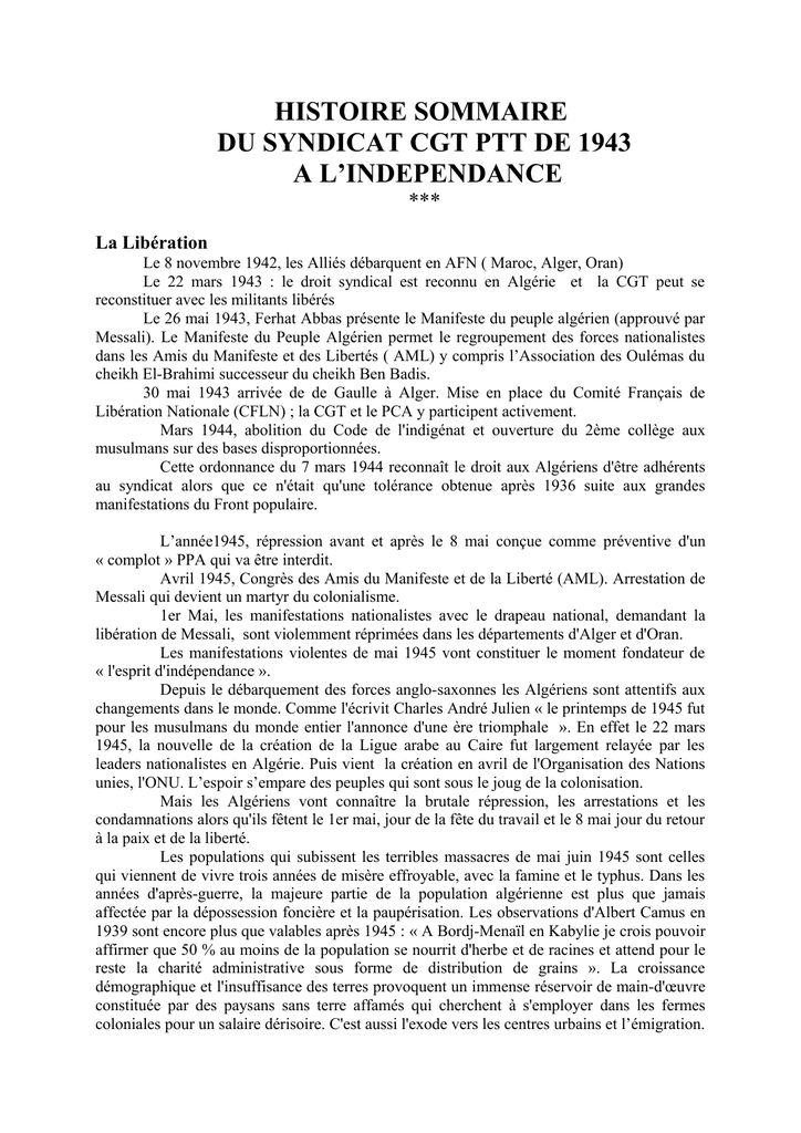 HISTOIRE SOMMAIRE DU SYNDICAT CGT PTT DE 1943 A L’INDEPENDANCE *** La Libération Le 8 novembre 1942, les Alliés débarquent en AFN ( Maroc, Alger, Oran) Le 22 mars 1943 : le droit syndical est reconnu en Algérie et la CGT peut se reconstituer avec les militants libérés Le 26 mai 1943, Ferhat Abbas présente le Manifeste du peuple algérien (approuvé par Messali). Le Manifeste du Peuple Algérien permet le regroupement des forces nationalistes dans les Amis du Manifeste et des Libertés ( AML) y compris l’Association des Oulémas du cheikh El-Brahimi successeur du cheikh Ben Badis. 30 mai 1943 arrivée de de Gaulle à Alger. Mise en place du Comité Français de Libération Nationale (CFLN) ; la CGT et le PCA y participent activement. Mars 1944, abolition du Code de l'indigénat et ouverture du 2ème collège aux musulmans sur des bases disproportionnées. Cette ordonnance du 7 mars 1944 reconnaît le droit aux Algériens d'être adhérents au syndicat alors que ce n'était qu'une tolérance obtenue après 1936 suite aux grandes manifestations du Front populaire. L’année1945, répression avant et après le 8 mai conçue comme préventive d'un « complot » PPA qui va être interdit. Avril 1945, Congrès des Amis du Manifeste et de la Liberté (AML). Arrestation de Messali qui devient un martyr du colonialisme. 1er Mai, les manifestations nationalistes avec le drapeau national, demandant la libération de Messali, sont violemment réprimées dans les départements d'Alger et d'Oran. Les manifestations violentes de mai 1945 vont constituer le moment fondateur de « l'esprit d'indépendance ». Depuis le débarquement des forces anglo-saxonnes les Algériens sont attentifs aux changements dans le monde. Comme l'écrivit Charles André Julien « le printemps de 1945 fut pour les musulmans du monde entier l'annonce d'une ère triomphale ». En effet le 22 mars 1945, la nouvelle de la création de la Ligue arabe au Caire fut largement relayée par les leaders nationalistes en Algérie. Puis vient la création en avril de l'Organisation des Nations unies, l'ONU. L’espoir s’empare des peuples qui sont sous le joug de la colonisation. Mais les Algériens vont connaître la brutale répression, les arrestations et les condamnations alors qu'ils fêtent le 1er mai, jour de la fête du travail et le 8 mai jour du retour à la paix et de la liberté. Les populations qui subissent les terribles massacres de mai juin 1945 sont celles qui viennent de vivre trois années de misère effroyable, avec la famine et le typhus. Dans les années d'après-guerre, la majeure partie de la population algérienne est plus que jamais affectée par la dépossession foncière et la paupérisation. Les observations d'Albert Camus en 1939 sont encore plus que valables après 1945 : « A Bordj-Menaïl en Kabylie je crois pouvoir affirmer que 50 % au moins de la population se nourrit d'herbe et de racines et attend pour le reste la charité administrative sous forme de distribution de grains ». La croissance démographique et l'insuffisance des terres provoquent un immense réservoir de main-d'œuvre constituée par des paysans sans terre affamés qui cherchent à s'employer dans les fermes coloniales pour un salaire dérisoire. C'est aussi l'exode vers les centres urbains et l’émigration. Dans les grandes villes d’Algérie, vont se développer de grands bidonvilles insalubres. Celui de la cité Mahieddine à Alger est monstrueux. Les massacres de mai 1945 vinrent s'ajouter à ceux que la mémoire avait ensevelis mais point oubliés. Un souffle nouveau parcourait les villes comme les campagnes. Ce fut l'œuvre des Amis du Manifeste et de la Liberté (AML), parrainée depuis mars 1944 par les leaders nationalistes. Les militants du PPA furent les plus actifs sur le terrain. La participation des Algériens aux manifestations de mai, avec l'organisation de cortège à part, traduisit bien cette volonté de s'approprier l'espace public, d'en faire le lieu de l'expression politique défiant toutes les interdictions. Nouveau contexte algérien avec le développement des organisations des forces nationalistes et l’algérianisation de la CGT . Mais des tensions et des conflits se produisent et d'autres organisations nationalistes ont été créées : Union Démocratique du Manifeste Algérien ( UDMA de Ferhat ABBAS en avril 1946, Mouvement pour le Triomphe des Libertés Démocratiques MTLD en février 1947 qui légalise en fait le PPA interdit en mai 1945. Le MTLD a une branche armée l'Organisation Spéciale (OS) qui sera démantelée en 1950 par la police française. Les partis nationalistes investissent le terrain de la légalité et participent aux discussions sur le statut organique de l'Algérie en août 1947. Le projet du gouvernement français, fort conservateur, fut vivement critiqué par les députés du PCA et de l'UDMA qui penchaient pour un État associé, tandis que le MTLD se prononçait pour une constituante algérienne souveraine et déniait à l'Assemblée française le « droit de décider du sort de l'Algérie, considérant qu'il appartient au peuple algérien de discuter de son avenir. L'opposition des députés colons mena campagne contre tout changement. Au terme de discussions passionnées, le « statut de l'Algérie » fut adopté le 20 septembre 1947 en l'absence des 12 députés musulmans. Ce « statut octroyé » créa une Assemblée algérienne de 120 membres, faussement paritaire puisqu'elle maintenait le système du double collège à l’avantage de la minorité européenne. A l'occasion des élections des membres de la future Assemblée algérienne en avril 1948, la pratique officielle de la fraude est organisée par le Gouverneur général MarcelEdmond Naëgelen par une gigantesque opération de trucage, en peuplant de candidats purement administratifs la représentation du deuxième collège. Les « élections Naëgelen » resteront dans les annales. Ce qui fait que la soc