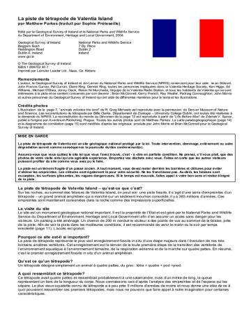 La piste de tétrapode de Valentia Island par Matthew Parkes (traduit par Sophie Préteseille) Edité par le Geological Survey of Ireland et le National Parks and Wildlife Servic e du Department of Environment, Heritage and Local Government, 2004. Geological Survey of Ireland Beggars Bush Haddington Road Dublin 4, Ireland www.gsi.ie National Parks and Wildlife Service 7 Ely Place Dublin 2 Ireland © The Geological Survey of Ireland ISBN 1 899702 40 7 Imprimé par Leinster Leader Ltd., Naas, Co. Kildare Remerciements L’auteur, le Geological Survey of Ireland et Jim Larner du National Parks and Wildlife Service (NPWS) remercient pour leur aide : Iw an Stössel, John Francis Curran, Pat Curran, Claire Ring, Dermot Ring, toutes les personnes impliquées dans la Valentia Heritage Society, Ken Higgs, Ed Williams, Michael O’Shea, Jenny Clack, Roisin Ní Murchada, l’équipe de la Valentia Radio Station, et tous les habitants de Valentia qui se sont intéressés à la pis te et se sentent concernés par son devenir ; Brian McConnell, Gerry French, Ray Weafer, Padraig Connaughton, John Morris et autres personnes du Geological Survey of Ireland qui ont aidé de différentes manières pour le texte et les illustrations. Crédits photos L’illustration de la page 7, “animals colonise the land” de R. Greg Michaels est reproduite avec la permission du Denver Museum of Nature and Science. Les reconstitutions du tétrapode par Billie Clarke, Département de Zoologie – University College Dublin, ont toutes été réalisées à la demande du NPWS. La reconstitution du monde au Dévonien de la page 12 est reproduite à partir de “Life Before Man” de Zdenek V. Spinar, publié à l’origine par Aventinum Publishing, Prague. Toutes les autres photos sont de Matthew Parkes. La carte palaéogéographique (page 14) et le diagramme de corrélation (page 15) sont modifiés d’après les originaux produits par John Morris et Brian McConnell pour le Geological Survey of Ireland. MISE EN GARDE La piste de tétrapode de Valentia est un site géologique national protégé par la loi. Toute intervention, dommage, enlèvement ou autre dégradation auront comme conséquence la poursuite du/des contrevenant(s). Assurez-vous que vous quittez le site tel que vous l’avez trouvé, c’est - à -dire en parfaite condition. Ne prenez, s’il vous plait, que des photos de votre visite ainsi qu’une agréable expérience. Emportez vos déchets avec vous. Faites en sorte que les autres visiteurs puissent profiter du site comme vous avez pu le faire. La piste est un témoin fragile d’un passé ancien. A tout moment, vous devez rester derrière les barrières et clôtures pour éviter d’abîmer les empreintes. Les clôtures sont également là pour votre sécurité. Ne les franchissez pas. Au-delà, les falaises sont escarpées, les surfaces glissantes, les vagues dangereuses. Si le temps est mauvais, faites appel à votre bon sens et restez éloigné de la piste. La piste de tétrapode de Valentia Island – qu’est-ce que c’est? Sur les roches, au sommet des falaises de Valentia Island, on peut voir une piste fossile. Il s’agit d’une série d’empreintes d’un tétrapode – un grand animal amphibien qui a marché sur un sédiment mou/non consolidé, il y a 385 millions d’années. Ces empreintes sont maintenant conservées dans la roche comme des impressions superficielles. La visite du site Le site est un monument géologique national important. Il est la propriété de l’Etat et est géré par le National Parks and Wildlife Service du Department of Environment, Heritage and Local Government afin d’en assurer un accès sans danger pour les visiteurs. Un parking a été aménagé. Un chemin de 200 m conduit le visiteur à des points de vue au sommet de la falaise, près de la piste. Afin de voir la piste dans les meilleures conditions, il est recommandé de venir le matin ou le soir par temps ensoleillé (page 11). L’accès est gratuit. Pourquoi ce site est-il si important? La piste de tétrapode représente le plus vieil enregistrement fossile in situ d’une étape majeure dans l’évolution de nos très lointains ancêtres vertébrés. Cet enregistrement est le témoin de la toute première étape de la transition des vertébrés de l’environnement aquatique à l’environnement terrestre, de la respiration aérienne et de la marche sur quatre pattes. En résumé, c’est le premier enregistrement fossile in situ d’un animal amphibien. Qu’est ce qu’un tétrapode? Un tétrapode désigne simplement un animal à quatre pattes, du grec : tétra = quatre + pod =pied. A quoi ressemblait ce tétrapode? Ce tétrapode avait quatre pattes et ressemblait probablement à une salamandre, mais d’un mètre de long, la queue représentant un tiers de la longueur du corps. Nous connaissons ceci d’après l’analyse des empreintes et de l’espace qui les sépare. Le plus vieux squelette connu de tétrapode a à peu près 5 millions d’années de moins et nous donne une idée de ce à quoi pouvaient ressembler ces premiers tétrapodes, mais nous ne pouvons que faire appel à notre imagination pour certaines caractéristiques. De quelle type de roche s’agit-il? Il s’agit d’une roche sédimentaire. A l’origine, cette roche s’est déposée sous forme de couches de silt/limon et de sable fin. Elle a ensuite été compactée au cours du temps et enterrée sous d’autres sédiments pour devenir une série de couches de grès et micro grès. Toutes les roches sur Valentia Island sont similaires et les géologues les regroupent sous le terme de "Valentia Slate Formation". L’ardoise de Valentia, (le sédiment d’origine était de la boue), a longtemps été exploitée dans la colline qui surplombe la piste de tétrapode. Vous pouvez visiter la Slate Mine Grotto pour observer ces ardoises de plus près. Comment s’est formée la piste? Imaginez un chien traversant une mare boueuse ou ma