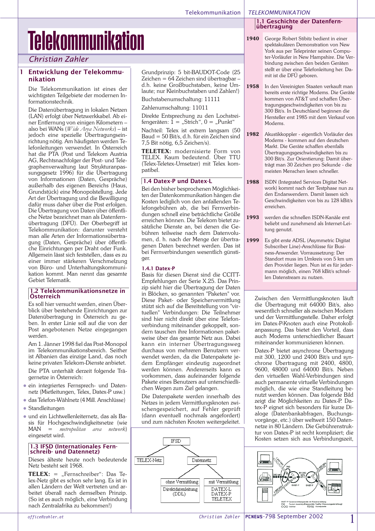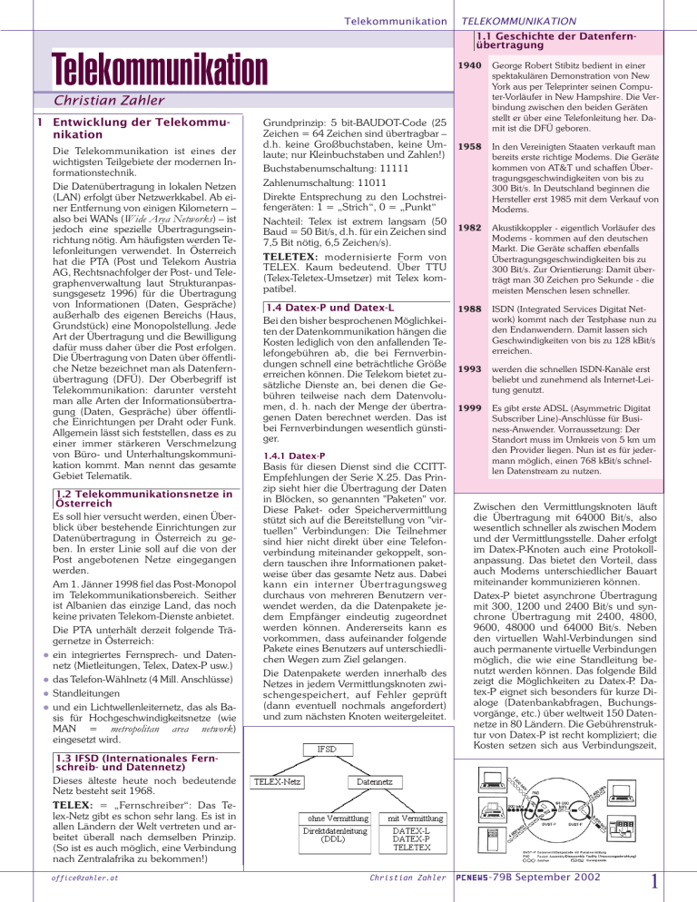 Telekommunikation TELEKOMMUNIKATION 1.1 Geschichte der Datenfernübertragung Telekommunikation 1940 George Robert Stibitz bedient in einer spektakulären Demonstration von New York aus per Teleprinter seinen Computer-Vorläufer in New Hampshire. Die Verbindung zwischen den beiden Geräten stellt er über eine Telefonleitung her. Damit ist die DFÜ geboren. 1958 In den Vereinigten Staaten verkauft man bereits erste richtige Modems. Die Geräte kommen von AT&T und schaffen Übertragungsgeschwindigkeiten von bis zu 300 Bit/s. In Deutschland beginnen die Hersteller erst 1985 mit dem Verkauf von Modems. 1982 Akustikkoppler - eigentlich Vorläufer des Modems - kommen auf den deutschen Markt. Die Geräte schaffen ebenfalls Übertragungsgeschwindigkeiten bis zu 300 Bit/s. Zur Orientierung: Damit überträgt man 30 Zeichen pro Sekunde - die meisten Menschen lesen schneller. 1988 ISDN (Integrated Services Digitat Network) kommt nach der Testphase nun zu den Endanwendern. Damit lassen sich Geschwindigkeiten von bis zu 128 kBit/s erreichen. 1993 werden die schnellen ISDN-Kanäle erst beliebt und zunehmend als Internet-Leitung genutzt. 1999 Es gibt erste ADSL (Asymmetric Digitat Subscriber Line)-Anschlüsse für Business-Anwender. Vorraussetzung: Der Standort muss im Umkreis von 5 km um den Provider liegen. Nun ist es für jedermann möglich, einen 768 kBit/s schnellen Datenstream zu nutzen. Christian Zahler 1 Entwicklung der Telekommunikation Die Telekommunikation ist eines der wichtigsten Teilgebiete der modernen Informationstechnik. Die Datenübertragung in lokalen Netzen (LAN) erfolgt über Netzwerkkabel. Ab einer Entfernung von einigen Kilometern – also bei WANs (Wide Area Networks) – ist jedoch eine spezielle Übertragungseinrichtung nötig. Am häufigsten werden Telefonleitungen verwendet. In Österreich hat die PTA (Post und Telekom Austria AG, Rechtsnachfolger der Post- und Telegraphenverwaltung laut Strukturanpassungsgesetz 1996) für die Übertragung von Informationen (Daten, Gespräche) außerhalb des eigenen Bereichs (Haus, Grundstück) eine Monopolstellung. Jede Art der Übertragung und die Bewilligung dafür muss daher über die Post erfolgen. Die Übertragung von Daten über öffentliche Netze bezeichnet man als Datenfernübertragung (DFÜ). Der Oberbegriff ist Telekommunikation: darunter versteht man alle Arten der Informationsübertragung (Daten, Gespräche) über öffentliche Einrichtungen per Draht oder Funk. Allgemein lässt sich feststellen, dass es zu einer immer stärkeren Verschmelzung von Büro- und Unterhaltungskommunikation kommt. Man nennt das gesamte Gebiet Telematik. l l l l 1.2 Telekommunikationsnetze in Österreich Es soll hier versucht werden, einen Überblick über bestehende Einrichtungen zur Datenübertragung in Österreich zu geben. In erster Linie soll auf die von der Post angebotenen Netze eingegangen werden. Am 1. Jänner 1998 fiel das Post-Monopol im Telekommunikationsbereich. Seither ist Albanien das einzige Land, das noch keine privaten Telekom-Dienste anbietet. Die PTA unterhält derzeit folgende Trägernetze in Österreich: ein integriertes Fernsprech- und Datennetz (Mietleitungen, Telex, Datex-P usw.) das Telefon-Wählnetz (4 Mill. Anschlüsse) Standleitungen und ein Lichtwellenleiternetz, das als Basis für Hochgeschwindigkeitsnetze (wie MAN = metropolitan area network) eingesetzt wird. Grundprinzip: 5 bit-BAUDOT-Code (25 Zeichen = 64 Zeichen sind übertragbar – d.h. keine Großbuchstaben, keine Umlaute; nur Kleinbuchstaben und Zahlen!) Buchstabenumschaltung: 11111 Zahlenumschaltung: 11011 Direkte Entsprechung zu den Lochstreifengeräten: 1 = „Strich“, 0 = „Punkt“ Nachteil: Telex ist extrem langsam (50 Baud = 50 Bit/s, d.h. für ein Zeichen sind 7,5 Bit nötig, 6,5 Zeichen/s). TELETEX: modernisierte Form von TELEX. Kaum bedeutend. Über TTU (Telex-Teletex-Umsetzer) mit Telex kompatibel. 1.4 Datex-P und Datex-L Bei den bisher besprochenen Möglichkeiten der Datenkommunikation hängen die Kosten lediglich von den anfallenden Telefongebühren ab, die bei Fernverbindungen schnell eine beträchtliche Größe erreichen können. Die Telekom bietet zusätzliche Dienste an, bei denen die Gebühren teilweise nach dem Datenvolumen, d. h. nach der Menge der übertragenen Daten berechnet werden. Das ist bei Fernverbindungen wesentlich günstiger. 1.4.1 Datex-P Basis für diesen Dienst sind die CCITTEmpfehlungen der Serie X.25. Das Prinzip sieht hier die Übertragung der Daten in Blöcken, so genannten "Paketen" vor. Diese Paket- oder Speichervermittlung stützt sich auf die Bereitstellung von "virtuellen" Verbindungen: Die Teilnehmer sind hier nicht direkt über eine Telefonverbindung miteinander gekoppelt, sondern tauschen ihre Informationen paketweise über das gesamte Netz aus. Dabei kann ein interner Übertragungsweg durchaus von mehreren Benutzern verwendet werden, da die Datenpakete jedem Empfänger eindeutig zugeordnet werden können. Andererseits kann es vorkommen, dass aufeinander folgende Pakete eines Benutzers auf unterschiedlichen Wegen zum Ziel gelangen. Die Datenpakete werden innerhalb des Netzes in jedem Vermittlungsknoten zwischengespeichert, auf Fehler geprüft (dann eventuell nochmals angefordert) und zum nächsten Knoten weitergeleitet. Zwischen den Vermittlungsknoten läuft die Übertragung mit 64000 Bit/s, also wesentlich schneller als zwischen Modem und der Vermittlungsstelle. Daher erfolgt im Datex-P-Knoten auch eine Protokollanpassung. Das bietet den Vorteil, dass auch Modems unterschiedlicher Bauart miteinander kommunizieren können. Datex-P bietet asynchrone Übertragung mit 300, 1200 und 2400 Bit/s und synchrone Übertragung mit 2400, 4800, 9600, 48000 und 64000 Bit/s. Neben den virtuellen Wahl-Verbindungen sind auch permanente virtuelle Verbindungen möglich, die wie eine Standleitung benutzt werden können. Das folgende Bild zeigt die Möglichkeiten zu Datex-P. Datex-P eignet sich besonders für kurze Dialoge (Datenbankabfr