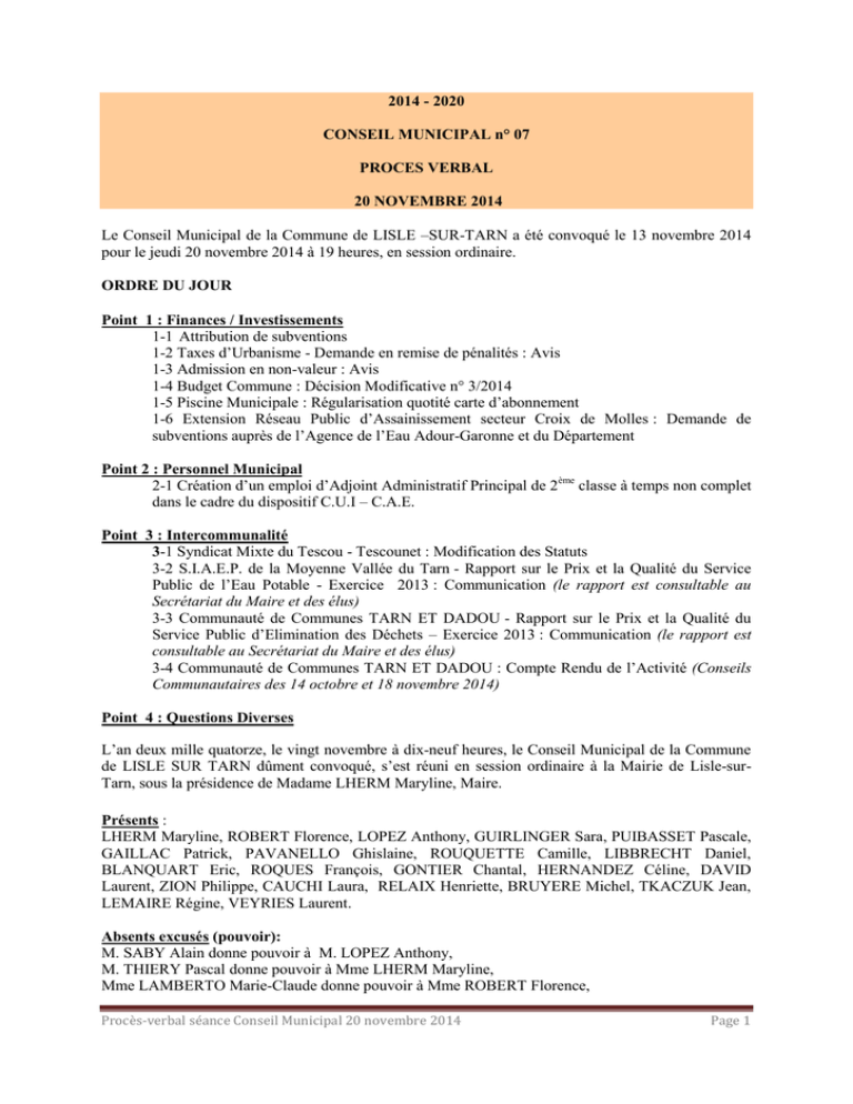 2014 - 2020 CONSEIL MUNICIPAL n° 07 PROCES VERBAL 20 NOVEMBRE 2014 Le Conseil Municipal de la Commune de LISLE –SUR-TARN a été convoqué le 13 novembre 2014 pour le jeudi 20 novembre 2014 à 19 heures, en session ordinaire. ORDRE DU JOUR Point 1 : Finances / Investissements 1-1 Attribution de subventions 1-2 Taxes d’Urbanisme - Demande en remise de pénalités : Avis 1-3 Admission en non-valeur : Avis 1-4 Budget Commune : Décision Modificative n° 3/2014 1-5 Piscine Municipale : Régularisation quotité carte d’abonnement 1-6 Extension Réseau Public d’Assainissement secteur Croix de Molles : Demande de subventions auprès de l’Agence de l’Eau Adour-Garonne et du Département Point 2 : Personnel Municipal 2-1 Création d’un emploi d’Adjoint Administratif Principal de 2ème classe à temps non complet dans le cadre du dispositif C.U.I – C.A.E. Point 3 : Intercommunalité 3-1 Syndicat Mixte du Tescou - Tescounet : Modification des Statuts 3-2 S.I.A.E.P. de la Moyenne Vallée du Tarn - Rapport sur le Prix et la Qualité du Service Public de l’Eau Potable - Exercice 2013 : Communication (le rapport est consultable au Secrétariat du Maire et des élus) 3-3 Communauté de Communes TARN ET DADOU - Rapport sur le Prix et la Qualité du Service Public d’Elimination des Déchets – Exercice 2013 : Communication (le rapport est consultable au Secrétariat du Maire et des élus) 3-4 Communauté de Communes TARN ET DADOU : Compte Rendu de l’Activité (Conseils Communautaires des 14 octobre et 18 novembre 2014) Point 4 : Questions Diverses L’an deux mille quatorze, le vingt novembre à dix-neuf heures, le Conseil Municipal de la Commune de LISLE SUR TARN dûment convoqué, s’est réuni en session ordinaire à la Mairie de Lisle-surTarn, sous la présidence de Madame LHERM Maryline, Maire. Présents : LHERM Maryline, ROBERT Florence, LOPEZ Anthony, GUIRLINGER Sara, PUIBASSET Pascale, GAILLAC Patrick, PAVANELLO Ghislaine, ROUQUETTE Camille, LIBBRECHT Daniel, BLANQUART Eric, ROQUES François, GONTIER Chantal, HERNANDEZ Céline, DAVID Laurent, ZION Philippe, CAUCHI Laura, RELAIX Henriette, BRUYERE Michel, TKACZUK Jean, LEMAIRE Régine, VEYRIES Laurent. Absents excusés (pouvoir): M. SABY Alain donne pouvoir à M. LOPEZ Anthony, M. THIERY Pascal donne pouvoir à Mme LHERM Maryline, Mme LAMBERTO Marie-Claude donne pouvoir à Mme ROBERT Florence, Procès-verbal séance Conseil Municipal 20 novembre 2014 Page 1 Mme ROLLAN Christine donne pouvoir à M. BLANQUART Eric, Mme CHAPUS Virginie donne pouvoir à Mme CAUCHI Laura, Mme SANCHEZ Nicole donne pouvoir à M. TKACZUK Jean. __________________________________________________________________________________ Mme ROBERT est désignée secrétaire de séance. Mme le Maire soumet à l’approbation de l’assemblée le procès-verbal de la séance du Conseil Municipal en date du 16 octobre 2014. M. TKACZUK fait remarquer que, dans sa présentation, Mme CAUMETTE a indiqué que la durée de la capacité de désendettement était de 16,1 ans en 2014 et non de17,1 comme il est stipulé dans le procès-verbal (page 4). Il demande en conséquence que cette durée soit modifiée. Il poursuit en indiquant qu’il s’avèrerait nécessaire de modifier l’intervention de M. SABY relative à la Z.A.C. de Rivalou (page 12). Ce dernier aurait dit que la Z.A.C. préemptait 63 ha. Mme le Maire prend le soin de préciser que ces modifications ne seront prises en compte qu’après vérification. Ledit procès-verbal est approuvé à l’unanimité. Point 1 : Finances / Investissements 1-2 Attribution de subventions M. LIBBRECHT propose à l’assemblée d’attribuer les subventions suivantes : - 500,00 € à l’Association « Les Forains Lislois » pour l’organisation d’animations à l’occasion du marché dominical en période estivale, - 1 000,00 € à l’ «Amicale des Ecoles Publiques » pour l’organisation d’une classe transplantée qui se déroulera du 15 au 19 décembre 2014 à Saint-Pierre dels Forcats (66) et concernera deux classes de CM2 (42 élèves). Mme le Maire tient à souligner l’effort considérable des forains qui cet été ont proposé une animation chaque dimanche. Concernant l’Amicale des Ecoles Publiques, elle précise que c’est en raison du mauvais résultat du vide grenier que cette subvention est sollicitée. Elle participera au financement des frais de transport. Le Conseil Municipal décide d’attribuer les subventions susvisées. Adopté à l’unanimité 1-2 Taxes d’Urbanisme - Demande en remise de pénalités : Avis Mme GUIRLINGER informe l’assemblée que le Conseil Municipal étant compétent pour accorder la remise gracieuse des pénalités liquidées pour défaut de paiement à la date d’exigibilité des taxes d’urbanisme, le Trésor Public a transmis à la Commune la demande de remise gracieuse formulée par M. Vincent FABREGUE d’un montant de 26,00 € (n° de dossier : PC 145 11 E 1059). Le Conseil Municipal donne un avis favorable sur cette remise de pénalités. Adopté à l’unanimité 1-3 Admission en non-valeur : Avis Mme GUIRLINGER informe l’assemblée que le Trésor Public a adressé à la Commune une demande d’admission en non-valeur concernant le budget principal. Il s’agit d’impayés relatifs à la facturation de la cantine et de l’accueil périscolaire pour les années 2013 et 2014 d’un montant total de 154.30 €. Mme GUIRLINGER précise qu’il ne s’agit que d’une régularisation. Procès-verbal séance Conseil Municipal 20 novembre 2014 Page 2 Le Conseil Municipal donne un avis favorable sur cette admission en non-valeur. Adopté à l’unanimité 1-4 Budget Commune : Décision Modificative n° 3/2014 Mme GUIRLINGER propose à l’assemblée d’adopter la décision modificative n°3 suivante : Désignation Dépenses Recettes Diminution Augmentation Diminution Augmentation de crédits de crédits de crédits de crédits INVESTISSEMENT R-1322-0605-02