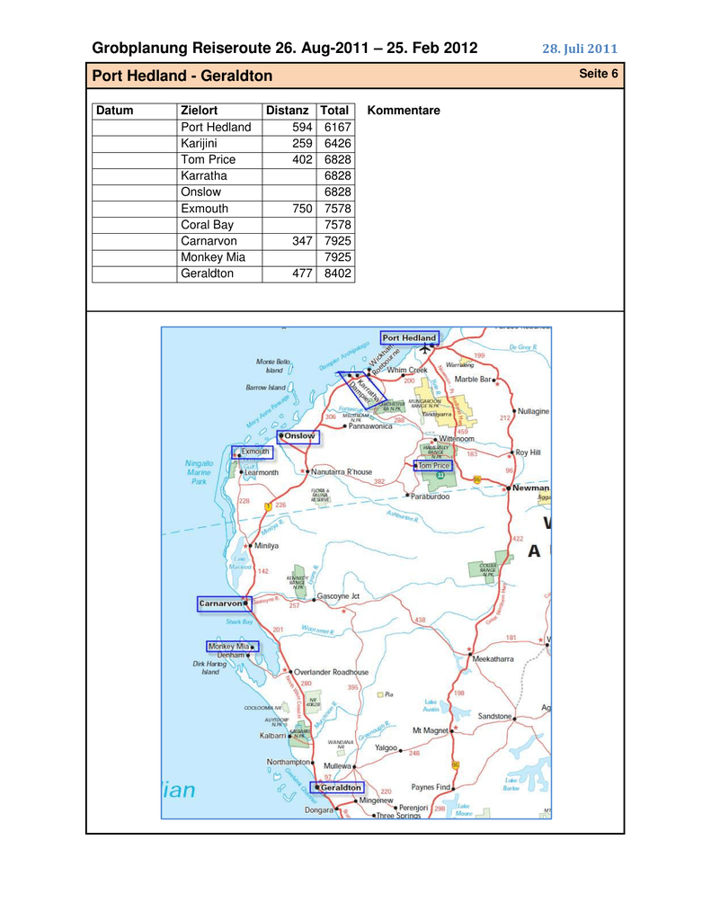 Grobplanung Reiseroute 26. Aug-2011 – 25. Feb 2012 Seite 6 Port Hedland - Geraldton Datum Zielort Port Hedland Karijini Tom Price Karratha Onslow Exmouth Coral Bay Carnarvon Monkey Mia Geraldton 28. Juli 2011 Distanz 594 259 402 Total 6167 6426 6828 6828 6828 750 7578 7578 347 7925 7925 477 8402 Kommentare