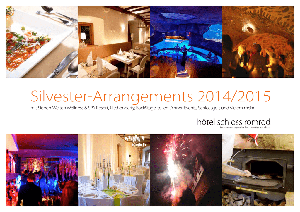 Silvester-Arrangements 2014/2015 mit Sieben-Welten Wellness & SPA Resort, Kitchenparty, BackStage, tollen Dinner-Events, Schlossgolf, und vielem mehr Silvesterprogramm 28. bis 29. Dezember 2014 Samstag, 27.12.2014 – Voranreise und Warm-up zum Sonderpreis Pünktlich zum Festwochenende reisen Sie auf Schloss Romrod an und das zum Sonderpreis mit 25% Rabatt! In unserem Restaurant mathilde ist bereits ein Tisch für Sie gedeckt, an dem Sie einen schönen Abend bei einem Drei-Gänge-Menü aus unserer Schlossküche verbringen können. Selbstverständlich können Sie Ihren ersten Abend auch in unserer gemütlichen havanabar 2059 ausklingen lassen. Sonntag, 28.12.2014 – Wellness-Frühstück, Schlossführung und große Kitchenparty Nachdem Sie Schloss Romrod erreicht haben, können Sie nach Ihrem Check-In sich in aller Ruhe erst einmal den ersten Eindruck von Schloss Romrod und unserem Ambiente machen. Nun beginnt nach der stressigen Weihnachtszeit eine Zeit der Entspannung und des Genießens… Nachdem im Laufe des Vormittags unsere weiteren Silvestergäste eingetroffen sind, laden wir Sie um 14:30 Uhr alle zu einem winterlichen Begrüßungscocktail ein, bevor Sie unser Geschäftsführer Andreas Otterbein auf eine kurzweilige Schlossführung mitnehmen wird. Im Anschluss daran werden Sie selbst aktiv - bei unserer legendären Kitchenparty: Sie schließen sich unserem Team an, lernen Cocktails shaken, erleben eine Weinverkostung im Restaurant und erfahren Wissenswertes über das richtige eindecken und dekorieren feiner Tafeln. Den I-Punkt auf diesen Tag setzt das öffnen unserer Türen in die verwinkelten Räumlichkeiten unserer Schlossküche, bei der Sie gemeinsam mit anderen Hotelgästen unter Anleitung unserer Spitzenköche ein köstliches 3-Gänge Menü zubereiten. In lockerer Atmosphäre können hier wertvolle Kochtricks und Kniffe von unseren Profis für Zuhause gesammelt und vor allem natürlich kräftig geschlemmt werden! Montag, 29.12.2014 – Vital-Frühstück, 7 Welten Wellness Therme & SPA und „Weltreise der Aromen“ Dinner Sicher haben Sie in Ihrem Schlosszimmer gut geschlafen und freuen sich auf unser leckeres Vital-Frühstück mit verschiedenen Säften aus Früchten und Gemüse, kernigen Müslis und kornigen Brötchen. Unser Küchenteam wird mit einem Frühstück-Front-Cooking für ein wenig Abwechslung sorgen und leckere Wellness-Omelettes für Sie zubereiten. Um 11:00 Uhr geht es los in die Barockstadt Fulda ins SIEBEN WELTEN THERME & SPA RESORT. Hier starten Sie eine Reise durch die schönsten Regionen dieser Erde. Entdecken Sie die Schönheiten Asiens, die Wärme Andalusiens, das Flair Arabiens, das Temperament Mexikos, die Herzlichkeit Afrikas, den Zauber Indiens oder die Köstlichkeiten Japans. Im SIEBEN WELTEN THERME & SPA RESORT erleben Sie auf über 30.000 m² die herrlichsten Badekulturen in traumhaftem Ambiente. Für die Gäste, die an diesem Tag erst anreisen, oder diejenigen nicht am Wellnessprogramm teilnehmen möchten, haben wir uns natürlich auch ein schönes Alternativprogramm überlegt: zu aller erst erwartet Sie ein kleiner Lunch in unserem Restaurant, damit Sie danach gestärkt an unserer Schlossführung inklusive Besichtigung der Kirchen und dem Romröder Schloss-Museum teilnehmen können. Am Abend erwartet Sie dann ein ganz außergewöhnliches Dinner, eine „Weltreise der Aromen“. Lassen Sie sich überraschen, denn hier haben sich unser Service- und unser Küchenteam etwas ganz Besonderes ausgedacht… Silvesterprogramm 30. bis 31. Dezember 2014 Dienstag, 30.12.2014 – Schloss-Golf, Lesung vor dem Kamin und historische Tafeley Wir starten wie immer mit einem wunderbaren Themen-Frühstück, bevor wir Sie dann zur einer spannenden Runde Schloss-Golf einladen. Bei dieser Trendsportart aus den USA spielen Sie ganz klassisches Golf, allerdings nicht auf dem grünen Rasen, sondern durch unsere prächtigen Räume und Flure! Am Nachmittag wird es dann gemütlich – in unserem Kaminzimmer vorm knisterterden Feuer können Sie in kuschliger Atmosphäre einer winterlichen Lesung lauschen. Dazu reichen wir Ihnen unseren lecken Schlosspunsch und Gebäck, damit auch für das leibliche Wohl gesorgt ist. Am Abend erwartet Sie der Spielmann Lupus in unserem Gewölbekeller zur traditionellen Tafelrunde – „eine historische Tafeley“. Auf Holzbrettern werden Ihnen wahre Gaumenfreuden serviert, während Sie parallel vom Spielmann Lupus sowohl verbal als auch musikalisch unterhalten werden. Ganz wichtig – bei uns wird nicht mit Händen und Füßen gegessen, sondern ganz brav und stilvoll nach höfischer Art mit Samt, silbernen Kerzenleuchtern, Tonkrügen etc. Mittwoch, 31.12.2014 – Prosecco Frühstück, Bingo und drei verschiedene Silvester-Veranstaltungen Diesen Tag beginnen Sie mit einem prickelnden Prosecco-Frühstück. Danach haben Sie noch etwas Zeit um sich für den letzten Tag des Jahres vorzubereiten. Am frühen Nachmittag werden wir unser fast schon traditionelles Silvester Bingo beginnen. Lassen Sie sich diesen Spaß nicht entgehen – auch hier werden Sie von uns mit Leckereien verwöhnt. Für den Silvesterabend haben wir für Sie drei verschiedene Veranstaltungen parat. Hier haben Sie die Qual der Wahl. Der festlich hergerichtet Rittersaal lädt zu einem stilvollem Silverster-Gala-Abend ein. Nach einem Empfang mit einem Glas Sekt wird Ihnen unser Küchenchef Heiko Mirschel ein exklusives 6-Gang-Menü präsentieren. Eine Liveband mit den größten Hits der letzten 40 Jahre sorgt dazu für eine perfekte Unterhaltung und die nötige „Bewegung“ – lets Dance… Möchten Sie es etwas gemütlicher angehen? Kein Problem! Dann sind Sie in unserem urigen Gewölbekeller bestens aufgehoben. Neben einem köstlichen Silvester-Buffet lassen wir auch hier durch Livemusik die Hüften kreisen. Oder möchten Sie es lieber etwas lockerer angehen? Außergewöhnliches Feiern und Party ohne Ende ist Ihr Motto – dann sind Sie bei unserer „Glamour toujours Silveste