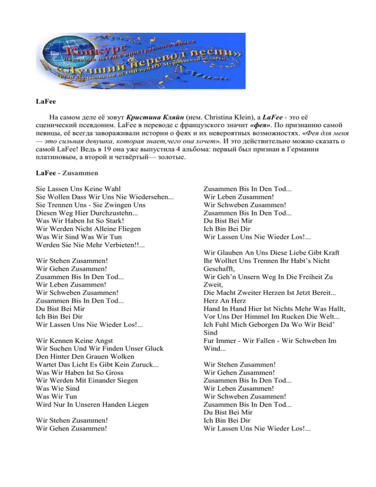 LaFee На самом деле её зовут Кристина Кляйн (нем. Christina Klein), а LaFee - это её сценический псевдоним. LaFee в переводе с французского значит «фея». По признанию самой певицы, её всегда завораживали истории о феях и их невероятных возможностях. «Фея для меня — это сильная девушка, которая знает,чего она хочет». И это действительно можно сказать о самой LaFee! Ведь в 19 она уже выпустила 4 альбома: первый был признан в Германии платиновым, а второй и четвёртый— золотые. LaFee - Zusammen Sie Lassen Uns Keine Wahl Sie Wollen Dass Wir Uns Nie Wiedersehen... Sie Trennen Uns - Sie Zwingen Uns Diesen Weg Hier Durchzustehn... Was Wir Haben Ist So Stark! Wir Werden Nicht Alleine Fliegen Was Wir Sind Was Wir Tun Werden Sie Nie Mehr Verbieten!!... Wir Stehen Zusammen! Wir Gehen Zusammen! Zusammen Bis In Den Tod... Wir Leben Zusammen! Wir Schweben Zusammen! Zusammen Bis In Den Tod... Du Bist Bei Mir Ich Bin Bei Dir Wir Lassen Uns Nie Wieder Los!... Wir Kennen Keine Angst Wir Suchen Und Wir Finden Unser Gluck Den Hinter Den Grauen Wolken Wartet Das Licht Es Gibt Kein Zuruck... Was Wir Haben Ist So Gross Wir Werden Mit Einander Siegen Was Wie Sind Was Wir Tun Wird Nur In Unseren Handen Liegen Wir Stehen Zusammen! Wir Gehen Zusammen! Zusammen Bis In Den Tod... Wir Leben Zusammen! Wir Schweben Zusammen! Zusammen Bis In Den Tod... Du Bist Bei Mir Ich Bin Bei Dir Wir Lassen Uns Nie Wieder Los!... Wir Glauben An Uns Diese Liebe Gibt Kraft Ihr Wolltet Uns Trennen Ihr Habt’s Nicht Geschafft, Wir Geh’n Unsern Weg In Die Freiheit Zu Zweit, Die Macht Zweiter Herzen Ist Jetzt Bereit... Herz An Herz Hand In Hand Hier Ist Nichts Mehr Was Hallt, Vor Uns Der Himmel Im Rucken Die Welt... Ich Fuhl Mich Geborgen Da Wo Wir Beid’ Sind Fur Immer - Wir Fallen - Wir Schweben Im Wind... Wir Stehen Zusammen! Wir Gehen Zusammen! Zusammen Bis In Den Tod... Wir Leben Zusammen! Wir Schweben Zusammen! Zusammen Bis In Den Tod... Du Bist Bei Mir Ich Bin Bei Dir Wir Lassen Uns Nie Wieder Los!...