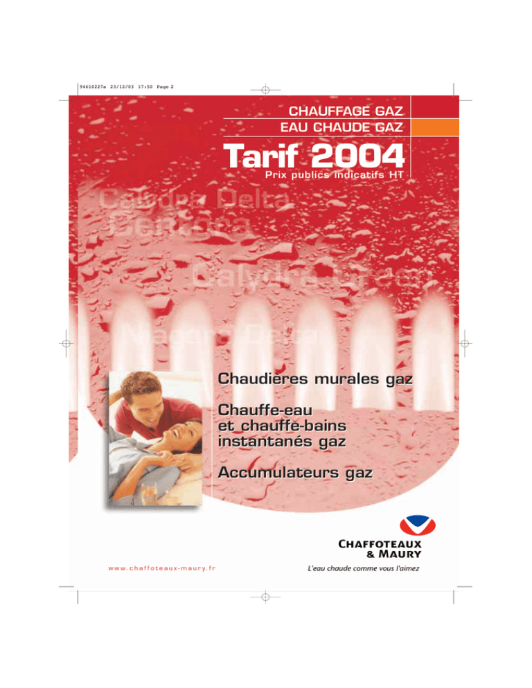 94610227a 23/12/03 17:50 Page 2 CHAUFFAGE GAZ EAU CHAUDE GAZ Tarif 2004 Prix publics indicatifs HT Chaudières murales gaz Chauffe-eau et chauffe-bains instantanés gaz Accumulateurs gaz w w w. c h a f f o t e a u x - m a u r y. f r 94610227a 23/12/03 17:50 Page 3 Tarif 2004 Applicable sur les livraisons à compter du 01/02/2004 Sommaire L’esprit de service .................................................... p.4 Accessoires pour chaudières murales Informations colisage................................................ p.5 Accessoires pour toutes chaudières murales ........ p.18-19 Accessoires pour chaudières murales étanches .... p.20-21 Chaudières murales gaz Chauffage seul ...................................................... p.6-7 Chauffe-eau et chauffe-bains gaz Chauffage et eau chaude instantanée....................... p.8-9 Eau chaude gaz instantanée................................ p.22-24 Chauffage et eau chaude à mini-accumulation ....... p.10-11 Eau chaude gaz accumulée................................. p.24-25 Chauffage et eau chaude à accumulation intégrée . p.12-13 Chauffage et eau chaude à accumulation séparée.. p.14-15 Garantie ............................................................... p.26 Chaudières murales gaz à condensation ............... p.16-17 Conditions générales de vente.................................. p.27 Chaudières à gaz Chaffoteaux & Maury Les réponses précises à des besoins multiples Ancien ou neuf, maison ou appartement, les chaudières murales gaz Chaffoteaux & Maury s’adaptent à tous les modes de vie, à tous les budgets, à toutes contraintes d’installation. En somme, à toutes les attentes. De la chaudière mixte instantanée à la chaudière à ballon d’accumulation (intégré ou séparé), il existe forcément une solution performante qui réponde aux besoins de chauffage et d’eau chaude, même les plus spécifiques. Les chaudières mixtes instantanées Economiques et compactes, les chaudières mixtes instantanées assurent à la fois le chauffage et la production d'eau chaude, selon la demande. Les chaudières à mini-accumulation De la taille d’une chaudière instantanée, les chaudières à mini-accumulation réduisent le temps d’attente et garantissent une meilleure stabilité de l’eau chaude (ex : utilisation simultanée douche + robinet). Maintenue en température dans un ballon intégré de 6 litres, l’eau est réchauffée en fonction de la demande. Les chaudières à condensation La préocupation environnementale de Chaffoteaux & Maury se traduit par une offre de chaudières à condensation : un meilleur rendement énergétique pour une diminution de la consommation d'énergie; un confort optimum grâce à la basse température et aux performances acoustiques inégalées. 2 - Chaffoteaux & Maury - Tarif Gaz 2004 Les chaudières à accumulation intégrée Les qualités d’une chaudière murale (faible encombrement, facilité de pose...), plus le niveau de confort irréprochable des systèmes à accumulation, vous obtenez un concept 2 en 1 pour une solution grand confort. Leur ballon intégré de 60 litres offre des performances comparables aux solutions avec ballon de stockage séparé, l’encombrement en moins. Les chaudières à accumulation séparée Chauffer et stocker dans un ballon de l’eau chaude immédiatement disponible, sans être limité par la puissance de la chaudière, c’est désormais possible. Cette solution est particulièrement adaptée à des besoins intensifs en eau chaude sanitaire ou à des configurations spécifiques d’installation. 94610227a 23/12/03 17:51 Page 4 Guide de choix des chaudières murales gaz Ce guide présente les chaudières à gaz naturel pouvant être préconisées dans le cadre d'une offre La qualité de vie DolceVita® : 4 offres pour répondre à toutes les attentes de vos clients DolceVita® ESSENTIEL : DolceVita® PERFORMANCE : Une solution de chauffage et d’eau chaude efficace pour les partisans de la simplicité et de la praticité, voulant allier confort et économies. Une solution robuste et performante, qui apporte le maximum d’économie et donne une réelle plus-value au logement pour ceux qui souhaitent optimiser leur investissement. DolceVita® SENSATIONS : DolceVita® PREMIUM : Une solution qui privilégie le confort dans tous ses états et laisse toute liberté de décoration à ceux qui sont sensibles au bien-être et à la beauté des formes. Une solution qui intègre des techniques innovantes et convient aux plus exigeants en termes de confort, d’économies et de respect de l’environnement. La gamme Chaffoteaux & Maury offre également d'autres produits performants susceptibles de répondre à vos besoins : chaudières chauffage seul et mixte. APPARTEMENT Mini Accumulation Intégrée Séparée DolceVita® Essentiel 1 SDB CALYDRA DELTA 24 CF VMC FF CALYDRA DELTA 28 CF CALYDRA DELTA 28 FF NIAGARA DELTA 24 CF VMC FF NIAGARA DELTA 28 CF 30 FF CENTORA 3.24 CF/VMC/FF + DUO 55 CENTORA 3.24 CF/VMC/FF + DUO 80 CENTORA 3.24 CF/VMC/FF + DUO 100 CENTORA 3.24 CF/VMC/FF + DUO 150 à 200 CENTORA 2.xx CF/ VMC/FF + CELECTIC 80 et 100 CENTORA 2.xx CF/ VMC/FF + CELECTIC 150 CALYDRA GREEN 30 FF CENTORA GREEN 3.24 FF + DUO 80 à 100 CENTORA GREEN 3.24 FF + DUO 150 à 200 • • • • • • • • • • • • • • • • • • • • 2 SDB DolceVita® Sensations 1 SDB • • • • • • • • • 2 SDB DolceVita® Performance 1 SDB • • • • • • • 2 SDB DolceVita® Premium 1 SDB 2 SDB • • • • • • • • • • MAISON INDIVIDUELLE 1 salle de Bains <90 M3 CALYDRA DELTA 24 CF/VMC/FF et 28 CF CALYDRA DELTA 28 FF NIAGARA DELTA 24 CF/VMC/FF, 28 CF et 30 FF CENTORA 3.24 CF/VMC/FF + DUO 55 CENTORA 3.24 CF/VMC/FF + DUO 80 CENTORA 3.24 CF/VMC/FF + DUO 100 CENTORA 3.24 CF/VMC/FF + DUO 150 à 200 CENTORA 2.xx CF/ VMC/FF + CELECTIC 80 à 100 CENTORA 2.xx CF/ VMC/FF + CELECTIC 150 CALYDRA GREEN 30 FF CENTORA G
