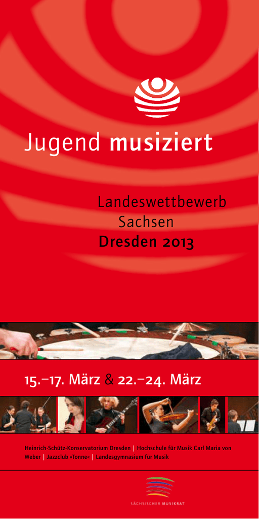 Jugend musiziert Landeswettbewerb Sachsen Dresden 2013 15.–17. März & 22.–24. März Heinrich-Schütz-Konservatorium Dresden | Hochschule für Musik Carl Maria von Weber | Jazzclub »Tonne« | Landesgymnasium für Musik Anzeige Inhaltsverzeichnis | Impressum Seite Unser Dank ..................................................................................................................................... 4 Zeitplan-Übersicht ....................................................................................................................... 5 Grußwort .......................................................................................................................................... 6 Ein Wort vorab ............................................................................................................................... 7 Organisatorische Hinweise ....................................................................................................... 8 Sonderpreise | Fördermaßnahmen ....................................................................................... 9 Das Beratungsgespräch | Hinweise zur Wertung | Wertungsinstrumente ........... 10 Die Jurys | Hinweis zu den Wertungsprogrammen........................................................ 11 Die Wettbewerbsorte – Orientierungsplan Dresden ...................................................... 58 Wertungsprogramme (nach Orten, in Zeitplanreihenfolge geordnet) 1. Wettbewerbswochenende 15.–17. März Hochschule für Musik ...................................................................................................... 12–15 Heinrich-Schütz-Konservatorium ................................................................................. 16–23 Landesgymnasium für Musik ........................................................................................ 24–29 Jazzclub »Tonne« ............................................................................................................... 30–33 2. Wettbewerbswochenende 22.–24. März Hochschule für Musik ..................................................................................................... 34–42 Heinrich-Schütz-Konservatorium ................................................................................ 44–47 Landesgymnasium für Musik (Kretschmerstraße) ................................................ 48–53 Landesgymnasium für Musik (Mendelssohnallee) ............................................... 54–56 Wertungsprogramme (nach Kategorien, in Zeitplanreihenfolge geordnet) Akkordeon ............................................................................................................................ 16–19 Duo Klavier und ein Blechblasinstrument ................................................................. 25–29 Duo Klavier und ein Holzblasinstrument ................................................................... 12–15 Ensemble Alte Musik ........................................................................................................ 54–56 Gesang (Pop) ....................................................................................................................... 32–33 Harfen-Ensemble ....................................................................................................................... 53 Jazz Ensembles ................................................................................................................... 30–31 Klavier-Kammermusik ...................................................................................................... 48–49 Kontrabass ................................................................................................................................... 42 Mallets ........................................................................................................................................... 24 Percussion .................................................................................................................................... 24 Viola ............................................................................................................................................... 47 Violine ................................................................................................................................... 34–40 Violoncello ........................................................................................................................... 44–46 Vokal-Ensemble 2 Gesangsstimmen ........................................................................... 50–51 Vokal-Ensemble 3–6 Gesangsstimmen ...................................................................... 51–52 Zupfinstrumente Gitarrenduos ...................................................................................... 20–21 Zupfinstrumente Ensembles ........................................................................................... 22–23 Impressum Herausgeber: Sächsischer Musikrat e.V. Präsident: Prof. Dr. Christoph Krummacher Berggartenstraße 11 | 01277 Dresden Telefon (0351) 802 42 85 | Fax (0351) 802 30 23 Redaktion: Torsten Tannenberg, Matthias Pagenkopf Redaktionsschluss: 22.02.2013 Fotos Titelseite: Làszlò Tòth | Gestaltung: Matthias Pagenkopf 3 Unser Dank Wir danken unseren Partnern, die den Landeswettbewerb »Jugend musiziert« Sachsen seit vielen Jahren kontinuierlich fördern, für die vertrauensvolle Zusammenarbeit und das Engagement. Sächsisches Staatsministerium für Wissenschaft und Kunst Die Sparkassen in Sachsen gemeinsam mit ihrem Ostdeutschen Sparkassenverband AUGUST FÖRSTER GmbH Weiterhin danken wir für die Unterstützung unseren Gastgebern und Förderern im Jahr 2013. gefördert durch die 4 Stadt Dresden Dresdner Stiftung Kunst & Kultur der Ostsächsischen Sparkasse Dresden Hochschule für Musik Carl Maria von Weber Dresden Jazzclub »Tonne« Landesgymnasium für Musik