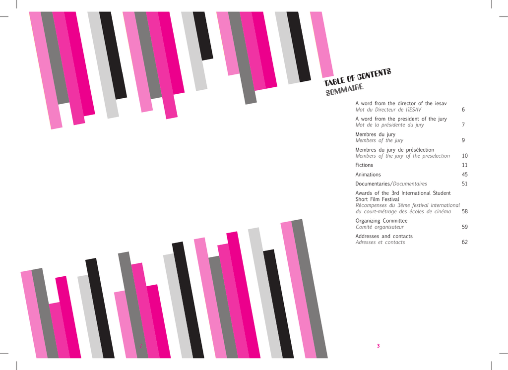 ents f Cont o e l b Ta aire Somm A word from the director of the iesav Mot du Directeur de l’IESAV 6 A word from the president of the jury Mot de la présidente du jury 7 Membres du jury Members of the jury 9 Membres du jury de présélection Members of the jury of the preselection 10 Fictions 11 Animations 45 Documentaries/Documentaires 51 Awards of the 3rd International Student Short Film Festival Récompenses du 3ème festival international du court-métrage des écoles de cinéma 58 2 Organizing Committee Comité organisateur 59 Addresses and contacts Adresses et contacts 62 3 av he ies t f o r recto i d e h t from eur de l’IESAV d r o ct aw u Dire d t o M Each recurrence of an international festival is a new occasion to conquer the world. Not with guns or violence, but with friendship, inquisitiveness, discovery, and the coming together of people, each from a different world. We all have something from elsewhere to say and show. Today, cinema students say it through their short films. And it is wonderful when all these different worlds connect, through images and sounds with the realities of the here and now of each of us. That’s what makes us thrill to be at the cinema, and to make cinema. Cinema has always been a fertile terrain for the coming together of time and space. Present, past, and future, reality and the fantastic, the deeply sad and the hilariously funny... Cinema knows no age and no finite landscape. It belongs to all times and all places. This year we are celebrating the 20th anniversary of the IESAV, this institute of theatrical, audiovisual and cinema studies. Twenty years: does that make us young, or does it age us? Age in this context is irrelevant. What counts is being. And since we are all here united by this festival, gathered around these 69 films, 18 countries and 27 film schools, it is the ultimate proof of vitality and youth, of the love of life and of the will to possess it. Speaking of the love of life, you will forgive my subjective digression. I can not but pay tribute to Nadeen Boulos, the main creator of the spirit of our festival. Nadeen left us last year to be elsewhere. Wherever she is now, she must be surrounded by stars in infinity, and I’m sure she’s making her own cinema with new friends. She will always have a place of honor in this festival. Have a great festival. Paul Mattar Director of the IESAV-USJ Chaque édition d’un festival international est une occasion nouvelle de conquérir le monde. Non par les armes ou la force mais par l’amitié, par la curiosité, par la découverte, par la rencontre de tous les autres venus d’ailleurs. Nous avons tous un ailleurs à dire et à montrer. Aujourd’hui, c’est par leurs courtsmétrages que les étudiants de cinéma le font. Et c’est formidable quand tous les ailleurs, à travers images et sons, se connectent avec les réalités d’ici. L’ici de chacun de nous. C’est ce qui nous rend heureux d’être au cinéma. C’est ce qui nous rend heureux de faire du cinéma. Le cinéma a toujours été un terrain extrêmement fécond de rencontres conjuguées à tous les temps et à tous les espaces. Présent, passé, futur, réel, imaginaire, drôle, grave, incongru, fantastique… Le cinéma n’a plus de lieu et n’a plus d’âge. Il est de tous les lieux et de tous les âges. A propos d’âge, nous fêtons cette année le vingtième anniversaire de l’IESAV, notre institut d’études scéniques, audiovisuelles et cinématographiques. Vingt ans, est-ce le bel âge ? Est-ce trop ou pas assez ? Quelle importance ? Parler d’âge est futile. C’est exister et bien exister qui me paraît le plus important. Et comme dans ce festival nous sommes tous bien là, ensemble réunis, autour de ces 69 films sélectionnés dans 18 pays et 27 écoles de cinéma, c’est la plus grande preuve de vitalité et de jeunesse. C’est notre amour de la vie et notre volonté de la posséder que nous voulons dire. A propos d’amour de la vie, vous me pardonnerez ma digression subjective. Je suis incapable de passer sous silence le tribut que notre institut doit à celle qui fut le principal artisan de l’esprit de ce festival, Nadeen Boulos qui nous a quittés pour vivre son ailleurs. Là où elle se trouve en ce moment, sans doute dans le firmament des étoiles, je suis sûr qu’elle fait son cinéma avec ses nouveaux amis. En tout cas, dans notre festival, il y aura toujours une place d’honneur qui lui sera réservée. Bon festival. Paul Mattar Directeur de l’IESAV-USJ 6 y he jur t f o t esiden y r p e h r t from dente du ju d r o si aw la pré e d t Mo What a pleasure to be back in Beirut as president of the 3rd Student Short Film Festival! I must say there’s a love story between Lebanon and me... First of all because my best friend for thirty years, Sonia, is Lebanese. This loyal and strong friendship motivated my desire to discover this country. I used to grab a taste of this place through the flavor of a «baba ghanouj» and the subtle perfume of the orange flower in white coffee. To tope it all, I was adopted by almost every Lebanese living in Paris. But in Lebanon, there was this never-ending war, despite our prayers. And then one day…it all ended and I was probably the first post-war tourist. To tell the truth, I felt I was visiting my Lebanese family. What unforgettable moments! Today, I am back to this country and I’m glad to discover the work of these young directors. It’s stirring to be the witness of new talents, and I don’t doubt the quality of the short films selected for this festival. The director’s camera has its own language, an international language. That’s what I call the magic of cinema. As for judging the quality of their work, it will be difficult, but those are the rules of the game! Luckily, I have a jury on which I can count, and I thank the members in advance… We will discover these images, these fragments of life, as gifts from these artists in 