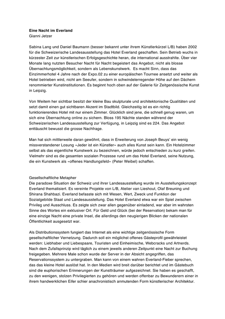 Eine Nacht im Everland Gianni Jetzer Sabina Lang und Daniel Baumann (besser bekannt unter ihrem Künstlerkürzel L/B) haben 2002 für die Schweizerische Landesausstellung das Hotel Everland geschaffen. Sein Betrieb wuchs in kürzester Zeit zur künstlerischen Erfolgsgeschichte heran, die international ausstrahlte. Über vier Monate lang nutzten Besucher Nacht für Nacht begeistert das Angebot, nicht als blosse Übernachtungsmöglichkeit, sondern als Lebenskunstwerk. Es macht Sinn, dass das Einzimmerhotel 4 Jahre nach der Expo.02 zu einer europäischen Tournee ansetzt und weiter als Hotel betrieben wird, nicht am Seeufer, sondern in schwindelerregender Höhe auf den Dächern renommierter Kunstinstitutionen. Es beginnt hoch oben auf der Galerie für Zeitgenössische Kunst in Leipzig. Von Weitem her sichtbar besitzt der kleine Bau skulpturale und architektonische Qualitäten und setzt damit einen gut sichtbaren Akzent im Stadtbild. Gleichzeitig ist es ein richtig funktionierendes Hotel mit nur einem Zimmer. Glücklich sind jene, die schnell genug waren, um sich eine Übernachtung online zu sichern. Bloss 195 Nächte standen während der Schweizerischen Landesausstellung zur Verfügung, in Leipzig sind es 224. Das Angebot enttäuscht bewusst die grosse Nachfrage. Man hat sich mittlerweile daran gewöhnt, dass in Erweiterung von Joseph Beuys’ ein wenig missverstandener Losung «Jeder ist ein Künstler» auch alles Kunst sein kann. Ein Hotelzimmer selbst als das eigentliche Kunstwerk zu bezeichnen, würde jedoch entschieden zu kurz greifen. Vielmehr sind es die gesamten sozialen Prozesse rund um das Hotel Everland, seine Nutzung, die ein Kunstwerk als «offenes Handlungsfeld» (Peter Weibel) schaffen. Gesellschaftliche Metapher Die paradoxe Situation der Schweiz und ihrer Landesausstellung wurde im Ausstellungskonzept Everland thematisiert. Es vereinte Projekte von L/B, Atelier van Lieshout, Olaf Breuning und Shirana Shahbazi. Everland befasste sich mit Wesen, Wert, Zweck und Funktion der Sozialgebilde Staat und Landesausstellung. Das Hotel Everland etwa war ein Spiel zwischen Privileg und Ausschluss. Es zeigte sich zwar allen gegenüber einladend, war aber im wahrsten Sinne des Wortes ein exklusiver Ort. Für Geld und Glück (bei der Reservation) bekam man für eine einzige Nacht eine private Insel, die allerdings den neugierigen Blicken der nationalen Öffentlichkeit ausgesetzt war. Als Distributionssystem fungiert das Internet als eine wichtige zeitgenössische Form gesellschaftlicher Vernetzung. Dadurch soll ein möglichst offenes Gästeprofil gewährleistet werden: Liebhaber und Liebespaare, Touristen und Einheimische, Webcracks und Artnerds. Nach dem Zufallsprinzip wird täglich zu einem jeweils anderen Zeitpunkt eine Nacht zur Buchung freigegeben. Mehrere Male schon wurde der Server in der Absicht angegriffen, das Reservationssystem zu untergraben. Man kann von einem wahren Everland-Fieber sprechen, das das kleine Hotel auslöst hat. In den Medien wird breit darüber berichtet und im Gästebuch sind die euphorischen Erinnerungen der Kunstträumer aufgezeichnet. Sie haben es geschafft, zu den wenigen, stolzen Privilegierten zu gehören und werden offenbar zu Bewunderern einer in ihrem handwerklichen Eifer schier anachronistisch anmutenden Form künstlerischer Architektur. Kunstwerk Hotelzimmer In der Kunst sind seit den neunziger Jahren zahlreiche Dispositive anzutreffen, in denen sich der Betrachter einbringen muss, um das Kunstwerk in eigener Erfahrung zu erleben: Supermarkt, Wohnen oder Kochen im Museum sind angesagt. Die Gegenwartskunst hat dadurch eine radikale Erweiterung erfahren. Der Betrachter wird zum aktiven Partizipienten, zum Akteur: «An die Stelle des Werks als Objekt traten offene Ereignisse. Der Autor, das Werk und der Betrachter, die drei Konstanten der klassischen Kunst, wurden im Sinne der erwähnten Reflexivität radikal hinterfragt und transformiert ... Anstelle des Werks als Objekt traten offene Ereignisse, Handlungen, Prozesse, Spiele, Handlungsanweisungen, Konzepte. Aus dem passiven Betrachter wurde der Mitschöpfer, Mitspieler, Teilnehmer. Die Grenze zwischen den diversen sozialen Akteuren auf dem Feld der Kunst und zwischen ästhetischen und nicht-ästhetischen Objekten und Ereignissen wurde teilweise durchlässig und unsichtbar.» Nicht nur in diesem sozialen Kontext ist das Hotel Everland zu deuten. Es geht auch um das Verhandeln von Privilegien. Die Hotelgäste sind bloss ein Teil des Kunstprojekts. Das Hotel Everland nutzt gezielt die bühnenartige Öffentlichkeit seiner Ausstellung, um Diskussionen zu provozieren. Am Tag dürfen sich neugierige Ausstellungsbesucher dem Hotel nähern und einen Blick durch die Glastüre in sein Inneres werfen und davon träumen, wie es wäre, wenn … Es ist eine private Enklave in der Öffentlichkeit des Kunstraumes und fordert Besucher und Hotelgäste jeden Tag von neuem auf, die Grenze zwischen privatem und öffentlichem Interesse neu zu verhandeln. Alle Gespräche, Bekanntschaften und Meinungsverschiedenheiten sind integraler Bestandteil des Projektes. L/B versuchen in ihrem Werk, Kunst und Alltag so nahe wie möglich zusammenzuführen. Im Gegensatz zu modernistischen Utopien haben sie jedoch den Anspruch aufgegeben, eine Einheit zwischen beiden anzustreben: «Kunst kann nie wirklich Alltag sein. Das käme einer Quadratur des Kreises gleich. Das hindert uns aber nicht daran, es trotzdem zu versuchen. Wir hatten schon immer den Anspruch Grenzen zu überschreiten.» Wie auch manch andere Installation der Gegenwart ist das Hotel Everland sowohl eine funktionierende Dienstleistung als auch ein Kunstwerk. Realität und Kunst vermengen sich hier in komplexer und widersprüchlicher Art und Weise. Vision Hotel L/B sind für ihre wohnlichen Installationen bekannt, in denen sie die Grenze zwischen Kunst und Design bewusst unterwandern. Eines ihrer Markenzeichen sind Muster, die sie den siebziger Jahren entlehnen. Teppiche, Tapet