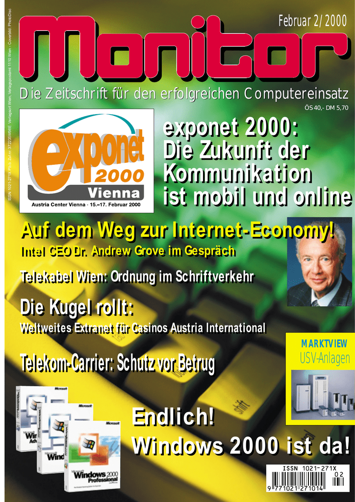 ISSN 1021-271X P.b.b. Zul.nr. 372235W98E Verlagsort Wien, Verlagspostamt 1110 Wien - Coverbild: PhotoDisc Februar 2/2000 Die Zeitschrift für den erfolgreichen Computereinsatz ÖS 40,- DM 5,70 exponet 2000: Die Zukunft der Kommunikation ist mobil und online Auf dem Weg zur Internet-Economy! Intel Intel CEO CEO Dr. Dr. Andrew Andrew Grove Grove im im Gespräch Gespräch Telekabel Telekabel Wien: Wien: Ordnung Ordnung im im Schriftverkehr Schriftverkehr Die Kugel rollt: Weltweites Weltweites Extranet Extranet für für Casinos Casinos Austria Austria International International MARKTVIEW Telekom-Carrier: Schutz vor Betrug USV-Anlagen Endlich! Windows 2000 ist da! EDITORIAL Visionen, Windows 2000 und exponet “Das Ambiente für unser Gespräch war ein eleganter Salon im Four Seasons Hotel gleich bei der Park Lane. Grove stellte sich bei unserem Treffen als ein charmanter Mann heraus, mit stechendem Blick, dem nichts entgeht. Und er hat einen scharfen Verstand.” So beginnt unser englischer Autor Jonathan Webster sein Interview mit dem IntelChef Dr. Andrew Grove. Und dieser wird gleich recht deutlich: “Den Regierungen sage ich: Habt Geduld. Die Zeit wird kommen, in der alle Probleme, die wir Verantwortlichen zu lösen versuchen, sehr viel klarer sein werden. Lasst uns erst dann regulieren, sonst könnten wir die Gans umbringen, die uns die goldenen Eier des e-Commerce legt. Bis dahin rate ich allen Firmen, die mit dem Internet zu tun haben, dass sie auch bestimmte ethische Ziele im Auge behalten sollen. Eines davon ist die goldene Regel: stiftet keinen Schaden.” Lesen Sie den ersten Teil des Interviews ab Seite 12. Auch der neue Geschäftsführer von Fujitsu Siemens Computers in Österreich, Georg Obermeier, formuliert in einem Interview seine recht ehrgeizigen Pläne: Als EuropaZiel peilt das Unternehmen den ersten Platz an, weltweit wollen wir auf jeden Fall den dritten Platz erreichen. Die Pole Position am österreichischen Markt werden wir daher weiter ausbauen, Schwerpunkte sind die Betreuung der Klein- und Mittelbetriebe und das Consumer-Geschäft. Tempo, flache Hierarchien und kurze Kommunikationswege sind die Erfolgsdevise für unser Team. Es gilt einfach, auf möglichst effizienten Wegen und mit geringen Kosten gute Produkte in den Markt zu bringen.” Mehr dazu finden Sie ab Seite 86. monitor 2/2000 Das “Thema” dieses Heftes ist die exponet Wien, der wir auf insgesamt 35 Seiten eine umfassende Berichterstattung widmen. Unser AutorenEhepaar Ilse und Rudolf Wolf hat wieder einmal hart dafür gearbeitet, um den ausstellenden Firmen die aktuellsten Informationen zu entlocken und Ihnen präsentieren zu können. Das konsequente Beibehalten des Fachmesse-Konzepts hat sich jedenfalls bewährt: Die exponet Wien wird auch heuer vom 15. bis 17. Februar mit rund 300 Ausstellern wieder die österreichische IT-Leitmesse für das professionelle Business sein. Informieren Sie sich in unserem exponet-Teil, damit Sie gut vorbereitet Ihren Messebesuch gezielt gestalten können. Die exponet nimmt auch das Unternehmen LG Soft zum Anlaß, seine GIDEON-Technologie vorzustellen. “Wir sind HightechSoftware-Entwickler und haben in drei Jahren intensiver Arbeit unser Produkt GIDEON entwickelt, das es nun zu vermarkten gilt”, erläutert dazu Geschäftsführer Johannes Leitner. Als “Certified Solution Partner” von Oracle hat das Unternehmen für die Casinos Austria International (CAI) das Global Knowledge Network (GKN) umgesetzt. Die CAI-Lösung ist eine via Internet weltweit verfügbare Applikation zur zentralen Datenverwaltung, zur konzerninternen Kommunikation sowie zum Web-Publishing (Verwaltung und Publikation öffentlich zugänglicher Daten). Den Anwenderbericht über diese Lösung finden Sie ab Seite 40. “Ein Traum: Mit Windows 2000 bringt Microsoft erstmals ein Betriebssystem auf den Markt, das wirklich gut ist. NT 4 war stabil, Windows 98 schick, Windows 2000 DI Rüdiger Maier, Chefredakteur ist beides.” So beginnt unser Testspezialist Hannes Jansky seine umfassende und informative Geschichte, aus der die Erfahrungen des Anwenders sprechen. “Während NT 4.0 sich nur in Workstation- und Server-Variante teilte, kommen bei Windows 2000 zwei neue hinzu. Die kleinste Version, die der NT Workstation entspricht, heißt Windows 2000 Professional. Es sollte binnen kurzer Zeit zum Standard für jeden Arbeitsplatz werden.” Die ganze Geschichte, angereichert mit einem kurzen Interview mit Thomas Lutz über den Führungswechsel bei Microsoft, finden Sie ab Seite 80. Bleibt mir nur noch, Ihnen eine anregende und informative Lektüre zu wünschen, Ihr P.S.: Wer den amerikanischen Originaltext von Evan Mahaneys “Leprechauns” (siehe “Moniskop, S. 102) lesen will, findet ihn auf unserer Webseite. 3 Inhalt WIRTSCHAFT 6 8 10 12 16 Acer: Spitzenplatz bei Notebooks Winterheller nach Deutschland Infomatec: Neue Vertriebs-/Marketingleitung Intel - Immer gut für Überraschungen: Interview mit Intels CEO Dr. Andrew Grove IT im Jahr 2000: CeBIT gibt die Trends vor LÖSUNGEN 22 26 “Einfach easy”: Archiv Austria sorgt bei Telekabel Wien für Ordnung beim Schriftverkehr Data Systems Austria: Neues Logistikkonzept für Benedikt&Jäger Die exponet bietet Ihnen auch heuer wieder ei Event! Erfahren Sie alles über die wichtigsten N THEMA 27 30 31 32 33 34 36 39 40 43 44 45 46 47 48 49 50 51 52 53 54 55 56 57 58 58 60 61 exponet 2000: IT-Leitmesse mit Erfolg Die Zukunft der Kommunikation ist mobil und online Acer: CeBIT-Neuigkeiten auf der exponet USV-Überwachung auf “JAVA”-Basis Kapsch: Schneller Datentransfer Rittal: Ordnung im System Centura im Aufwind Navision Financials auf Windows 2000 Die Kugel rollt: Extranet-Applikation für die Casinos Austria International Host-Mobility und WebConnectivity Mit Sicherheit durchs Internet WIFI: Cisco Networking Academy Netzwerklösungen für jede Unternehmensgröße schoeller.the NetWorkers Webfähige Host-Bestellsysteme IBM: e-Business und neue Kommun