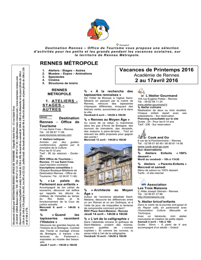Cauquil De st i n at io n R en n e s – O f f i c e d e T o u r is me v o u s p ro p o s e u n e sé le ct i o n d ’a ct iv it és p o u r l e s p et it s et l e s g r an d s p e n d an t l e s v ac an c es s co l a ir e s, s u r le t e r ri t o i r e d e R en n e s Mé t r o p o le . Document réalisé par DESTINATION RENNES- OFFICE DE TOURISME - Chapelle Saint-Yves - 11 rue Saint-Yves CS 26410 35064 Rennes Cedex / Tél. : 02 99 67 11 11 / Fax : 02 99 67 11 10 / [email protected] / www.tourisme-rennes.com Ouvert tous les jours (sauf juillet et août), le lundi de 13h à 18h, du mardi au samedi de 10h à 18h et le dimanche et les jours fériés de 10h à 13h et de 14h à 17h (sauf le 1er/01, 1er/05 et 25/12) - Juillet-Août : Du lundi au samedi de 9h à 19h et le dimanche et jours fériés de 10h à 13h et de 14h à 17h. RENNES MÉTROPOLE 1. 2. 3. 4. 5. Vacances de Printemps 2016 Ateliers - Stages – Autres Musées – Expos – Animations Spectacles Cinéma Structures de loisirs RENNES MÉTROPOLE Académie de Rennes 2 au 17avril 2016 « Á la recherche tapisseries rennaises » des De l’hôtel de Blossac à l’église SaintMelaine en passant par la mairie de Rennes, retrouve des tapisseries d’époques différentes, évoquant des thèmes variés, accrochées çà et là dans la ville. Vendredi 8 avril – 14h30 à 16h30 Destination Rennes - Office de Tourisme 11 rue Saint-Yves – Rennes Tél. : 02 99 67 11 66 www.tourisme-rennes.com Ateliers ludiques Animés par des guidesconférenciers, agréés par le ministère de la Culture Pour les 6-12 ans Tarif : 5€ (la séance) - Durée : 2h RDV Office de Tourisme – Rennes, 11 rue Saint-Yves (sauf mention contraire) Inscriptions conseillées à l’Espace Boutique-Billetterie de Destination Rennes - Office de Tourisme / Tél. : 02 99 67 11 66) « Rennes au Moyen Âge » Au cours de ce rallye, tu marcheras dans les pas d’Anne de Bretagne, des tournois de chevalerie, des remparts, des maisons à pans-de-bois… Tout en relevant les défis proposés pour gagner des points ! Mercredi 13 avril - 14h30 à 16h30 « Quand les tapisseries racontent l’Histoire » Découvre les grandes heures de l’histoire de la Bretagne, Combat des Trente et mariage d’Anne de Bretagne, à travers « les tentures du Parlement », exposées au musée des beauxarts. Jeudi 7 avril – 14h30 à 16h30 Cook and Go 6 rue de la Parcheminerie – Rennes Tél. : 02 99 51 93 49 / 06 80 61 14 06 www.cook-and-go.com Sur réservations Ateliers Enfants dessert » « 100% Mardi au vendredi – 10h à 11h30 Ateliers « Parents-Enfants » Mercredi et samedi Menu de saison ou 100% dessert Tarifs : cf site internet « Le palais du Parlement aux enfants » Accompagné de ton cahier de souvenirs, découvre cet édifice qui rappelle les décors du château de Versailles au temps du Roi Soleil, et le fonctionnement de la Cour de justice actuelle. Mercredi 6 avril – 14h30 à 16h30 L’Atelier Gourmand 154 rue Eugène Pottier - Rennes Tél. : 09 82 58 11 24 www.atelier-gourmand.fr Atelier culinaire Réalisation de deux ou trois recettes. Chaque enfant repart avec ses préparations – Sur réservation Planning consultable sur le site Durée : 2h - Pour les 6-14 ans Tarif : 23€ - Sur reservation « Architecte Âge » au Moyen Autour de l’ancienne abbatiale SaintMelaine, découvre les différences entre un arc Roman et un arc Gothique, et à l’aide de jeux, de maquettes tu tenteras de comprendre comment ça tient ! RDV Place Saint-Melaine - Rennes Jeudi 14 avril – 14h30 à 16h30 « L’art de la calligraphie » Dans l’abbatiale romane et gothique de Saint-Melaine, vivaient des moines, souvent qualifiés de « moines copistes ». Et comme les novices, tu seras initié à l’art de la calligraphie. Vendredi 15 avril - 14h30 à 16h30 Association Les Trois Maisons 2, Allée Joseph Gémain - Rennes Tél. : 02 99 67 27 66 http://troismaisons.org Atelier bricol’enfants Dans le cadre de la journée anti-gaspi et du Repair café, en partenariat avec l’Association Culture Manuelle et Technique. Avec un bénévole, mini atelier menuiserie et création de petits objets Samedi 2 avril – 14h à 18h Durée : 30mn – Á partir de 6 ans accompagné d’un adulte – Gratuit Repair café Venez apprendre avec les bénévoles à réparer votre jouet, votre vélo, votre vêtement, etc. Mardi 12 avril – 15h à 19h30 Durée : variable - Á partir de 6 ans accompagné d’un adulte – Gratuit Atelier T-Rèse Marteline 10 rue Francisco Ferrer – Rennes Tél. : 06 85 18 59 40 Stages « Mosaïque » adulte/enfant Avec Stéphanie Leray-Corbin. Venez découvrir ou approfondir la technique de la mosaïque. Agitez votre créativité en réalisant un projet personnel, accompagné d’une mosaïste. Passez un moment convivial à l’atelier. Volume, incrustation, monochrome, mortier, pixel-art, transparence, etc. Matériel et outils fournis. Apportez votre support - Sur réservation uniquement – Samedi 2 au samedi 16 avril Tarif : en fonction de la prestation Théâtre du Cercle 30bis rue de Paris - Rennes Tél. : 02 99 27 53 03 www.theatreducercle.com Stage d’initiation théâtre « langue des signes » Venez jouer avec vos signes et vos mots, autour des expressions populaires et la langue française. Avec Clémence Colin (10 Doigts Cie) et Leslie Evrard (Cie Zusvex). Lundi 4 au merc. 6 avril - 9h30 à 16h Pour les 8-14 ans Tarif : 45€ (dispositif Sortir accepté) Stage radio « Vibrations radio » Stage à Parigné (proche Fougères), possibilité de co-voiturage depuis Rennes. Réaliser des interviews, écrire des chroniques, inventer des jingles, imaginer des récits absurdes, etc. Au programme : des temps théoriques d’apprentissage, de la prise de son, de l’écoute, de l’animation, de l’écriture, de la mise en scène et du plaisir. Avec Salima Malik Rivière de l’Armada Productions et Mathis Bois de la Cie Zusvex. Lundi 4 au jeudi 7 avril - 9h30 à 17h30 Pour les 13-