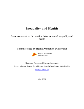 Inequality and Health Basic document on the relation between social inequality and health Commissioned by Health Promotion Switzerland Hanspeter Stamm and Markus Lamprecht Lamprecht and Stamm Social Research and Consultancy AG • Zurich [email protected] May 2009 Contents: 1. Introduction: Why is inequality such an important issue for health promotion? 3 2. What is inequality and what effect does it have? 4 2.1. From difference to inequality 4 2.2. Inequalities in contemporary society 5 2.3. What effect does inequality have? 7 2.4. How does inequality affect health? 12 3. Inequality and health in Switzerland 14 3.1. The extent of inequality 14 3.2. Health inequality in Switzerland 19 4. What can and should health promotion achieve? 27 5. Summary and outlook 31 References 33 Appendix 1: Notes on the inequality models of the Swiss Federal Office of Public Health and the World Health Organization 36 Appendix 2: Selected Swiss health promotion projects related to the problem of inequality 37 Endnotes 39 Basic Document “Social Inequality“, May 2009 2 1. Introduction: Why is inequality such an important issue for health promotion? Men in Switzerland live on average about five years less (79 years) than women (84 years). Men unfortunate enough to have completed only compulsory education have an even lower life expectancy: thirty-year-old men with only mandatory school education will reach an average age of little over 73, whereas same age female academics will reach an average age of a little over 85.1 Moreover, the Swiss health survey shows that low income persons feel less healthy, are heavier in weight and have worse smoking habits than high income persons.2 Finally the study “Sport Schweiz 2008” reveals that the proportion of people who do not engage in sports activities is higher in foreigners as well as in people with low income or low education (see chapter 3) 3. These few examples demonstrate that there is a clear relation between education, income, sex and national origin, on the one hand, and health, health behaviour and life expectancy, on the other. While this is not a new finding, it is frequently forgotten when it comes to concrete initiatives to improve health. Information on health-related behaviours and new health promoting initiatives are advertised on posters, in the general belief that the messages are equally understood by all and that all share the same willingness for behaviour change. Obviously this is not the case. Depending on social background and position in society, individuals have different health risks and different capabilities of adopting health promoting behaviour. This is why, when planning and implementing programmes of health promotion and prevention, social inequality must always be kept in mind. Yet this endeavour becomes complicated just by the fact that the general notion of “social inequality” refers to a variety of different influencing factors, with some having conflicting effects on health and health behaviour. In other words: Looking at the differences in education or income does not suffice. Rather, when concluding that not all members of society have the same chances to lead a healthy life, it is important to examine how exactly the different social circumstances affect lives and whether other factors are involved. This document seeks to bring order into some of these different interactions and relationships. The following chapter clarifies the question as to what social inequality is and how it affects health (chapter 2). Selected results on the extent of inequality and its impact on health in Switzerland are presented in chapter 3. Chapters 4 and 5 present concrete examples of how the problem of inequality can be addressed in health promotion. As a brief, practice-oriented introduction to the problem of inequality, this text can certainly not replace the abundance of original contributions and text books dealing with this topic. Therefore, the references included in this document point to further worthwhile readings. Basic Document “Social Inequality“, May 2009 3 2. What is inequality and what effect does is have? 2. 1. From difference to inequality A review of the history of mankind shows that inequality has been a constant companion of social development for millennia. It is difficult to find an era or society that did not have powerful and powerless, rich and poor, privileged and disadvantaged people. Critics of inequality emerged time and time again – one just has to think of the criticism of the rich in the New Testament, of Jean-Jacques Rousseau's essay on inequality or Karl Marx and his belief in a classless society. In addition, “equality” was the motto of the popular movement during the French Revolution. Nonetheless society has remained one that is marked by a multitude of inequalities. In addition to the most obvious differences in power, income and wealth, we observe many more inequalities. Examples include children who start life from unequal positions due to their parents' social status (social milieu), the surprisingly resistant beliefs regarding unequal skills due to gender or nationality leading to unequal treatment in everyday life, or occupational and educational differences which both substantially influence social circumstances . Not every observed difference in life is an inequality. Two conditions have to be fulfilled for differences to become inequalities. They are illustrated in figure 2.1 4: • First, the differences need to be perceived and rated as relevant by a population majority. This is to say, the differences have to be such that they can be rated as “more” or “less”, or “better” or “worse”. As shown in figure 2.1, such ratings are imposed by society and may be based on consensus or by the use of force. The first case would apply when the majority of the population believes it to be right that well trained specialists should earn more than unskilled workers, the second cas