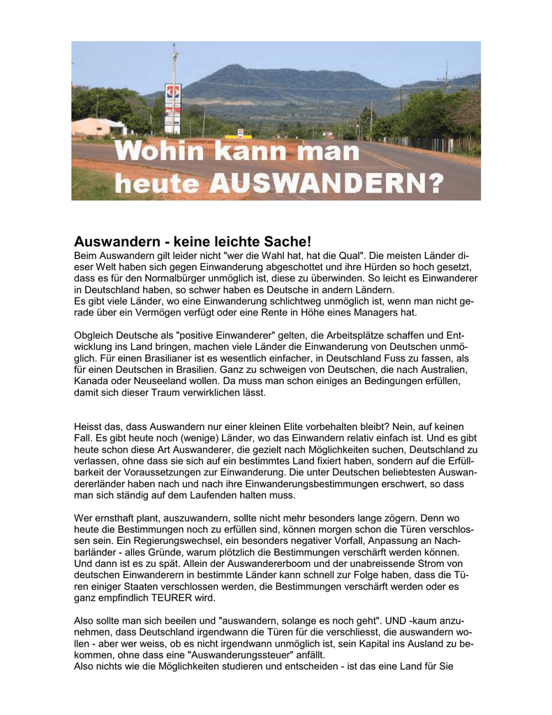 Auswandern - keine leichte Sache! Beim Auswandern gilt leider nicht "wer die Wahl hat, hat die Qual". Die meisten Länder dieser Welt haben sich gegen Einwanderung abgeschottet und ihre Hürden so hoch gesetzt, dass es für den Normalbürger unmöglich ist, diese zu überwinden. So leicht es Einwanderer in Deutschland haben, so schwer haben es Deutsche in andern Ländern. Es gibt viele Länder, wo eine Einwanderung schlichtweg unmöglich ist, wenn man nicht gerade über ein Vermögen verfügt oder eine Rente in Höhe eines Managers hat. Obgleich Deutsche als "positive Einwanderer" gelten, die Arbeitsplätze schaffen und Entwicklung ins Land bringen, machen viele Länder die Einwanderung von Deutschen unmöglich. Für einen Brasilianer ist es wesentlich einfacher, in Deutschland Fuss zu fassen, als für einen Deutschen in Brasilien. Ganz zu schweigen von Deutschen, die nach Australien, Kanada oder Neuseeland wollen. Da muss man schon einiges an Bedingungen erfüllen, damit sich dieser Traum verwirklichen lässt. Heisst das, dass Auswandern nur einer kleinen Elite vorbehalten bleibt? Nein, auf keinen Fall. Es gibt heute noch (wenige) Länder, wo das Einwandern relativ einfach ist. Und es gibt heute schon diese Art Auswanderer, die gezielt nach Möglichkeiten suchen, Deutschland zu verlassen, ohne dass sie sich auf ein bestimmtes Land fixiert haben, sondern auf die Erfüllbarkeit der Voraussetzungen zur Einwanderung. Die unter Deutschen beliebtesten Auswandererländer haben nach und nach ihre Einwanderungsbestimmungen erschwert, so dass man sich ständig auf dem Laufenden halten muss. Wer ernsthaft plant, auszuwandern, sollte nicht mehr besonders lange zögern. Denn wo heute die Bestimmungen noch zu erfüllen sind, können morgen schon die Türen verschlossen sein. Ein Regierungswechsel, ein besonders negativer Vorfall, Anpassung an Nachbarländer - alles Gründe, warum plötzlich die Bestimmungen verschärft werden können. Und dann ist es zu spät. Allein der Auswandererboom und der unabreissende Strom von deutschen Einwanderern in bestimmte Länder kann schnell zur Folge haben, dass die Türen einiger Staaten verschlossen werden, die Bestimmungen verschärft werden oder es ganz empfindlich TEURER wird. Also sollte man sich beeilen und "auswandern, solange es noch geht". UND -kaum anzunehmen, dass Deutschland irgendwann die Türen für die verschliesst, die auswandern wollen - aber wer weiss, ob es nicht irgendwann unmöglich ist, sein Kapital ins Ausland zu bekommen, ohne dass eine "Auswanderungssteuer" anfällt. Also nichts wie die Möglichkeiten studieren und entscheiden - ist das eine Land für Sie unmöglich, geht es vielleicht in einem anderen besser und Sie entscheiden sich für dieses, BEVOR die Bestimmungen verschärft werden. Jeder Mensch hat andere Vorraussetzungen für das Auswandern - die einen sind gut ausgebildet und wollen ihre Arbeit in einem anderen Land besser bezahlt haben, die anderen befinden sich schon im Ruhestand und möchten ihren Lebensabend in einem sonnigen Land verbringen, wo sie für ihr Geld bessere Lebensqualität bekommen, wieder andere möchten einen kompletten Neuanfang und sind bereit, ihr Leben den neuen Umständen anzupassen und auch in anderen Bereichen zu arbeiten. Also nichts wie die Möglichkeiten studieren und entscheiden - ist das eine Land für Sie unmöglich, geht es vielleicht in einem anderen besser und Sie entscheiden sich für dieses, BEVOR die Bestimmungen verschärft werden. Jeder Mensch hat andere Vorraussetzungen für das Auswandern - die einen sind gut ausgebildet und wollen ihre Arbeit in einem anderen Land besser bezahlt haben, die anderen befinden sich schon im Ruhestand und möchten ihren Lebensabend in einem sonnigen Land verbringen, wo sie für ihr Geld bessere Lebensqualität bekommen, wieder andere möchten einen kompletten Neuanfang und sind bereit, ihr Leben den neuen Umständen anzupassen und auch in anderen Bereichen zu arbeiten. Und schliesslich sind da diese, die eigentlich gar keine Chancen auf Veränderung und Fortschritt haben, weder in Deutschland noch im Ausland, und die dennoch ständig auf der Suche sind, ob es nicht doch ein Land gibt, wo ihre Möglichkeiten reichen, um ein neues Leben zu beginnen. Die folgenden Seiten geben eine Übersicht darüber, welches Land welche Einwanderungsbestimmungen hat. Welche Hürden müssen Sie überwinden, um in diesen Ländern Fuss zu fassen? Dürfen Sie arbeiten und unter welchen Voraussetzungen? Natürlich kann ich hier nicht sämtliche Länder der Erde auflisten, daher habe ich die beliebtesten Auswandererländer hier zusammengefasst. SPANIEN Spanien ist ohne Zweifel das liebste Land der Deutschen. Millionen machen dort jedes Jahr Urlaub, ob es Mallorca, die Canaren oder das Festland ist. Da kommen bei vielen Menschen die Gedanken auf, dort definitiv leben zu wollen, und Tausende tun dies auch schon. Spanien bietet unglaublich viele verschiedenen Landschaften und Möglichkeiten, allein schon auf den Canaren. Spanien bietet auch den unschätzbaren Vorteil, dass es zur Europäischen Union gehört und die Einwanderung verhältnismässig leicht ist. Viele Landsleute und relative Nähe zu Freunden und Verwandten in Deutschland sind ebenfalls grosse Vorteile. Also kann man Spanien mit gutem Gewissen für Auswanderer empfehlen. Der einzige Nachteil: Spanien hat den Euro, und Euro-Länder sind teuer. Wen es dennoch nach Spanien zieht, hier die mässigen Voraussetzungen zum Einwandern: EU-Mitglieder Jedes Mitglied der europäischen Union hat das Recht hier in Barceona zu Leben und zu Arbeiten. Wer länger als drei Monate hier lebt, muß eine Identifikationsnummer - genannt NIE (Numero de Identificacion de Extranjero) - beantragen. In Barcelona gibt es dafür die Ausländerbehörde (Oficina de Extranjeros). Man sollte seinen Ausweis (oder Paß), eine Ausweiskopie, 3 Paßbilder und Zeit mitbringen, da sich vor dem Büro meist eine Schlange bildet. Die Nummer wird innerhalb von einem Mo