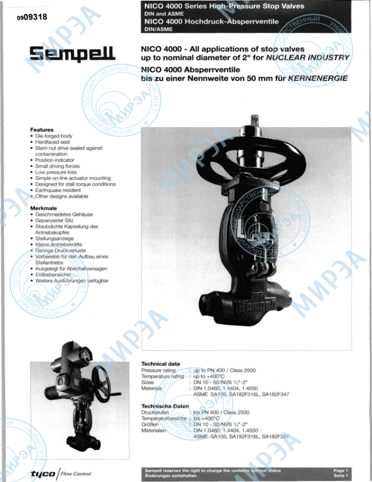 NICO 4000 Series High-Pressure Stop Valves 0909318 DIN and ASME NICO 4000 Hochdruck-Absperrventile DIN/ASME 5empeli NICO 4000 - All applications of stop valves up to nominal diameter of 2" for NUCLEAR INDUSTRY NICO 4000 Absperrventile bis zu einer Nennweite von 50 mm fur KERNENERGIE Features Die-forged body Hardfaced seat Stem nut drive sealed against contamination Position indicator Small driving forces Low pressure loss Simple on-line actuator mounting Designed for stall torque conditions Earthquake resident Other designs available Merkmale Geschmiedetes Gehause Gepanzerter Sitz Staubdichte Kapselung des Antriebskopfes Stellungsanzeige Kleine Antriebskrafte Geringe Druckverluste Vorbereitet fur den Aufbau eines Stellantriebs Ausgelegt fur Abschaltversagen Erdbebensicher Weitere Ausfuhrungen verfugbar Technical data Pressure rating Temperature rating Sizes Materials Technische Daten Druckstufen Temperaturbereiche GroBen Materialien tqca I Flow Control up to PN 400 / Class 2500 up to +400°C DN10-50/NVSV 2 "-2" DIN 1.0460, 1.4404, 1.4550 ASME SA105, SA182F316L, SA182F347 bis PN 400 / Class 2500 bis +400°C DN 10-50/NVS V2"-2" DIN 1.0460, 1.4404, 1.4550 ASME SA105, SA182F316L, SA182F347 Sempell reserves the right to change the contents without notice Anderungen vorbehalten NICO 4000 Series High-Pressure Stop Valves Type 110-212 NICO 4000 Hochdruck-Absperrventile Тур 110-212 Type 110-212 Тур 110-212 HP Stop Valve TUV - Type-testet up to PN 400 / Class 2500 DN 10-50 /NVSV*"- 2" HD Absperrventil TUV - Bauteilgepruft bis PN 400 / Class 2500 DN 10-50/NVS VV'-2" Easy changing over to actuators Einfaches Umrusten auf Antrieb Low friction bearing, extension compensation Reibungsarme Lager, Dehnungskompensation Protection long-term lubrication Gekapselte Langzeitschmierung Visual position indicator Visuelle Stellungsanzeige Stripper Abstreifer Two-piece gland Zweiteilige Stopfbuchsbrille One-piece, non-rotating stem (17% Cr) Einteilige, nichtdrehende Spindel (17% Cr) Pure graphite packing Packung aus Reingrafit Hard-faced body seat, stellite or cobalt-free Gepanzerter Gehausesitz, Stellit Oder kobaltfrei Low pressure loss Geringer Druckverlust Cylindrical connections: easy to weld and test Zylindrische Anschlusse: leicht schweifien und prufen Sempel reserves the right to change the contents without notice Anderungen vorbehalten tL/ca Flow Control NICO 4000 Series High-Pressure Stop Valves Type 111-212 NICO 4000 Hochdruck-Absperrventile Тур 111-212 Type 111-212 Тур 111-212 HP Stop Valve up to PN 400 / Class 2500 DN 1 0 - 5 0 / N V S V2"-2" HD Absperrventil bis PN 400 / Class 2500 DN 1 0 - 5 0 / N V S V2"-2" Design features Type 111-212 Konstruktionsmerkmale Тур 111-212 two-piece body/bonnet design Body from bar material Many variations of material Gehause/Bugel zweiteilig Gehauseunterteil aus Stangenmaterial GroBe Materialvariationen ti/ca >Flow Control Sempell reserves the right to change the contents without notice Anderungen vorbehalten NICO 4000 Series High-Pressure Stop Valves Type 111-246 NICO 4000 Hochdruck-Absperrventile Тур 111-246 Type 111-2461 (only DN 40-50 / 2") Тур 111-2461 (nur DN 40-50 / 2") Type 111-246111 Тур 111-246Ш HP Stop Valve with Bellows up to PN 160 / Class 900 DN 40-50 / NVS 2" HD Absperrventil mit Faltenbalg bis PN 160/Class 900 DN 40-50 / NVS 2" HP Stop Valve with Bellows up to PN 400 / Class 2500 DN 1 0 - 5 0 / N V S V / - 2 " HD Absperrventil mit Faltenbalg bis PN 400 / Class 2500 DN 10-50 / NVS V / - 2 " Design features Type 111-246 Body and bonnet die-forged Bellows designed for 5000 cycles Safety stuffing-box Body of bar material in material spec. 16, 66 Sempell reserves the right to change the contents without notice Anderungen vorbehalten Konstruktionsmerkmale Тур 111-246 Gehause und Bugelaufsatz gesenkgeschmiedet Faltenbalg fur 5000 Lastwechsel ausgelegt Sicherheitsstopfbuchse Gehause aus Stangenmaterial bei Werkstoff 16, 66 tqcal Flow Control NICO 4000 Series High-Pressure Stop Valves Type 211-231 NICO 4000 Hochdruck-Absperrventile Тур 211-231 Type 211-231 Тур 211-231 HP Piston Check Valve up to PN 400 / Class 2500 DN 1 0 - 5 0 / N V S ' / 2 " - 2 " HD Ruckschlagventil bis PN 400 / Class 2500 DN 1 0 - 5 0 / N V S V2"-2" Design features Type 211-231 Body and bonnet cover die-forged Spring for vertical installing Flat seat Guided disc Body of bar material in material spec. 16, 66 tqcal Flow Control Konstruktionsmerkmale Тур 211-231 Gehause und Gehausedeckel gesenkgeschmiedet Feder fur vertikale Installation Flachsitz Gefuhrter Ring Gehause aus Stangenmaterial bei Werkstoff 16, 66 Sempell reserves the right to change the contents without notice Anderungen vorbehalten NICO 4000 Series High-Pressure Stop Valves Type 110-212 NICO 4000 Hochdruck-Absperrventile Тур 110-212 Sempell reserves the right to change the contents without notice Anderungen vorbehalten tijca Flow Control NICO 4000 Series High-Pressure Stop Valves Dimensions NICO 4000 Hochdruck-Absperrventile Abmessungen Socketweld end SchweiBmuffe Plain Unbearbeitet E CM YZ E U z ^ t Flanges ace. to DIN/ASME Specifications. Flansche entspr. DIN/ASME Normen. _.. —^ 1 . 3 •да= — r.|U—'-I Buttweid end SchweiBende — L1 Dimensions/Weight in m m / k g / Abmessungen/Gewicht in m m / k g ТУре/Тур PN max. Class max. DN NVS L L1 b H H1 H2* h D Stroke/Hub Weight/Gewicht 10/15 1/2" 160 300 120 250 195 620 35 200 10 8 110-212 400 2500 25 1" 180 360 130 300 245 650 45 225 15 12 40/50 2" 300 530 170 455 385 820 75 350 30 40 10/15 1/2" 160 300 140 250 195 620 35 200 10 19 111-212 400 2500 25 1" 180 360 140 300 245 650 45 225 15 19 111-2461 160 900 40/50 2" 300 530 180 550 470 650 75 350 13 58 40/50 2" 300 530 220 455 385 820 75 350 30 72 10/15 1/2" 160 300 130 390 355 55 45 225 8 23 111-246111 400 2500 25 40/50 1 2" 180 300 360 530 180 130 640 390 355 560 55 740 45 75 225 350 8 13 23 65 10/15 1/2" 160 300 130 130 211-231 400 2500 25 1 180 360 130 130 40/50 2" 300 530 18
