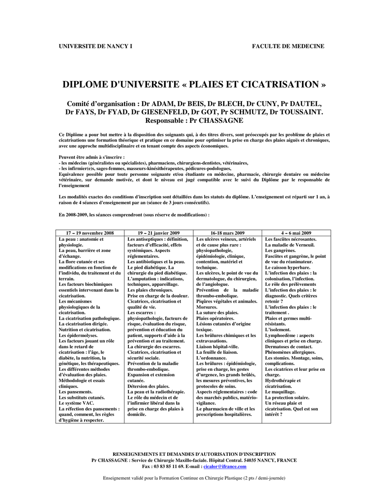 UNIVERSITE DE NANCY I FACULTE DE MEDECINE DIPLOME D'UNIVERSITE « PLAIES ET CICATRISATION » Comité d’organisation : Dr ADAM, Dr BEIS, Dr BLECH, Dr CUNY, Pr DAUTEL, Dr FAYS, Dr FYAD, Dr GIESENFELD, Dr GOT, Pr SCHMUTZ, Dr TOUSSAINT. Responsable : Pr CHASSAGNE Ce Diplôme a pour but mettre à la disposition des soignants qui, à des titres divers, sont préoccupés par les problème de plaies et cicatrisations une formation théorique et pratique en ce domaine pour optimiser la prise en charge des plaies aiguës et chroniques, avec une approche multidisciplinaire et en tenant compte des aspects économiques. Peuvent être admis à s'inscrire : - les médecins (généralistes ou spécialistes), pharmaciens, chirurgiens-dentistes, vétérinaires, - les infirmier(e)s, sages-femmes, masseurs-kinésithérapeutes, pédicures-podologues, Equivalence possible pour toute personne soignante et/ou étudiante en médecine, pharmacie, chirurgie dentaire ou médecine vétérinaire, sur demande motivée, et dont le niveau est jugé compatible avec le suivi du Diplôme par le responsable de l’enseignement Les modalités exactes des conditions d'inscription sont détaillées dans les statuts du diplôme. L’enseignement est réparti sur 1 an, à raison de 4 séances d'enseignement par an (séance de 3 jours consécutifs). En 2008-2009, les séances comprendront (sous réserve de modifications) : 17 --- 19 novembre 2008 La peau : anatomie et physiologie. La peau, barrière et zone d’échange. La flore cutanée et ses modifications en fonction de l’individu, du traitement et du terrain. Les facteurs biochimiques essentiels intervenant dans la cicatrisation. Les mécanismes physiologiques de la cicatrisation. La cicatrisation pathologique. La cicatrisation dirigée. Nutrition et cicatrisation. Les épidermolyses. Les facteurs jouant un rôle dans le retard de cicatrisation : l’âge, le diabète, la nutrition, la génétique, les thérapeutiques. Les différentes méthodes d’évaluation des plaies. Méthodologie et essais cliniques. Les pansements. Les substituts cutanés. Le système VAC. La réfection des pansements : quand, comment, les règles d’hygiène à respecter. 19 --- 21 janvier 2009 Les antiseptiques : définition, facteurs d’efficacité, effets systémiques. Aspects réglementaires. Les antibiotiques et la peau. Le pied diabétique. La chirurgie du pied diabétique. L’amputation : indications, techniques, appareillage. Les plaies chroniques. Prise en charge de la douleur. Cicatrices, cicatrisation et qualité de vie. Les escarres : physiopathologie, facteurs de risque, évaluation du risque, prévention et éducation du patient, supports d’aide à la prévention et au traitement. La chirurgie des escarres. Cicatrices, cicatrisation et sécurité sociale. Prévention de la maladie thrombo-embolique. Expansion et extension cutanée. Détersion des plaies. La peau et la radiothérapie. Le rôle du médecin et de l’infirmier libéral dans la prise en charge des plaies à domicile. 16-18 mars 2009 Les ulcères veineux, artériels et de cause plus rare : physiopathologie, épidémiologie, clinique, contention, matériel et technique. Les ulcères, le point de vue du dermatologue, du chirurgien, de l’angiologue. Prévention de la maladie thrombo-embolique. Piqûres végétales et animales. Morsures. La suture des plaies. Plaies opératoires. Lésions cutanées d’origine toxique. Les brûlures chimiques et les extravasations. Liaison hôpital-ville. La feuille de liaison. L’ordonnance. Les brûlures : épidémiologie, prise en charge, les gestes d’urgence, les grands brûlés, les mesures préventives, les protocoles de soins. Aspects réglementaires : code des marchés publics, matériovigilance. Le pharmacien de ville et les prescriptions hospitalières. 4 --- 6 mai 2009 Les fasciites nécrosantes. La maladie de Verneuil. Les gangrènes. Fasciites et gangrène, le point de vue du réanimateur. Le caisson hyperbare. L’infection des plaies : la colonisation, l’infection. Le rôle des prélèvements L’infection des plaies : le diagnostic. Quels critères retenir ? L’infection des plaies : le traitement . Plaies et germes multirésistants. L’isolement. Lymphoedème : aspects cliniques et prise en charge. Dermatoses de contact. Phénomènes allergiques. Les stomies. Montage, soins, complications. Les cicatrices et leur prise en charge. Hydrothérapie et cicatrisation. Le maquillage. La protection solaire. Un réseau plaie et cicatrisation. Quel est son intérêt ? RENSEIGNEMENTS ET DEMANDES D'AUTORISATION D'INSCRIPTION Pr CHASSAGNE : Service de Chirurgie Maxillo-faciale. Hôpital Central. 54035 NANCY, FRANCE Fax : 03 83 85 11 69. E-mail : [email protected] Enseignement validé pour la Formation Continue en Chirurgie Plastique (2 pts / demi-journée)