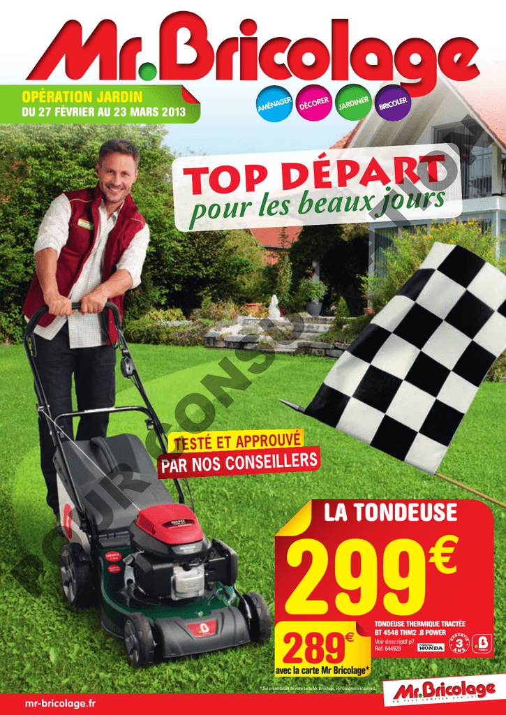 OPÉRATION JARDIN ER NAG AMÉ INER OLER BRIC JARD LA TONDEUSE € 299 289 G A 3 • Voir descriptif p7. Réf. 644928 IE € TONDEUSE THERMIQUE TRACTÉE BT 4548 THM2 .B POWER RANT • P O U R C O N S U LT A T IO N DU 27 FÉVRIER AU 23 MARS 2013 R ORE DÉC ANS avec la carte Mr Bricolage* * Sur présentation de votre carte Mr. Bricolage, voir conditions en page 2. mr-bricolage.fr O N P E U T C O M P T E R S U R L U I Retrouvez vite notre nouveau guide jardin en magasin ou sur www.mr-bricolage.fr RETROUVEZ TOUS NOS CONSEILS ET VIDÉOS, AINSI QUE LA LISTE DES M A MAGASINS SUR MR-BRICOLAGE.FR Hervé, r rvé, A T IO N TOUT POUR LE JARDIN ! Conseiller iller a age Mr Bricolage ault) (34 - Hérault) U LT Pourr grands jardins ou petits balcons balcons, ce catalogue vous propose tout ce qu’il faut pour entretenir et aménager votre extérieur. Certains produits bénéficient d’un prix encore plus avantageux sur présentation de votre carte Mr Bricolage... alors n’hésitez pas ! O N S TAEG fixe de 0%. Mensualités de 50€ Montant total dû par l’emprunteur = 500€ Un crédit vous engage et doit être remboursé. Vérifiez vos capacités de remboursement avant de vous engager. Pour un financement** de 500 € remboursable en 10 mensualités. Du 27 février au 23 mars 2013 C Payez en 10 fois au TAEG fixe de 0% R Crédit affecté* de 500 € à 21 500 € au TAEG fixe de 0% et taux débiteur fixe de 0%, remboursable sur une durée 10 mois, mensualités de 50 € à 2150 €. P O U Exemple* pour un financement de 500 €** au TAEG fixe de 0% (taux débiteur fixe de 0%). Remboursement en 10 mensualités de 50 €. Montant total dû par l’emprunteur : 500 € hors assurance facultative. Coût mensuel de l’assurance facultative : 0,54 €*** perçu en plus de la mensualité. Votre magasin Mr. Bricolage est mandaté de façon exclusive par LaSer Cofinoga en tant qu’intermédiaire de crédit, chargé de fournir à la clientèle les informations et explications sur les crédits proposés et de collecter les éléments pour la formalisation des demandes de crédit. Vous pouvez vous opposer sans frais à l’utilisation de vos données personnelles à des fins de prospection en matière de crédit. Pour ce faire, il vous suffit alors d’adresser votre réclamation par courrier à Service Assistance Client TSA 70014 33914 Bordeaux Cedex 9. * Exemple représentatif indiqué sur la base d’une première échéance 30 jours après la date du financement. Conditions au 01/11/12. ** Sous réserve d’acceptation de votre dossier par LaSer Cofinoga SA au capital de 135 000 000 € - SIREN 682 016 332 RCS Paris ORIAS n° 07023 103, 18 rue de Londres 75449 Paris cedex 09, tél. : 05 56 55 25 95 et après expiration du délai légal de rétractation en vigueur. Coût du crédit pris en charge par le magasin. Le TAEG fi xe est calculé hors assurance facultative.***Soit 0,108% du capital emprunté - Contrat groupe N°2006/410 (Décès + Invalidité + Arrêt de Travail) souscrit par LaSer Cofinoga SA auprès de Cardif Assurance Vie, S.A. au capital de 688 507 760 €, 732 028 154 R.C.S. Paris et CARDIF Assurances Risques Divers, S.A. au capital de 14 784 000 €, 308 896 547 R.C.S. Paris dont le siège social est au 1 Bd Haussmann 75009 Paris. Entreprises régies par le code des assurances. Offre de crédit affecté alternative à la carte de crédit B Premium. 2 BÉNÉFICIEZ DE L’AVANTAGE CARTE TE MR BRICOLAGE sur les produits signalés en catalogue 1€ D’ACHAT = 1POINT 300 Points 10€ EN CHÈQUE FIDÉLITÉ * *Chèque utilisable en une seule fois sur un achat supérieur à sa valeur faciale, et sur présentation de la carte de fidélité Mr.Bricolage. Non remboursable, non cumulable avec d’autres offres de fidélité en cours, hors promotions, électroportatif, outillage motorisé de jardin, matériaux, combustible et services. La carte de fidélité Mr.Bricolage est une carte payante valable dans les magasins Mr.Bricolage adhérant au programme de fidélité pendant 3 ans après le règlement de la cotisation de 10 €. Les prix cartes sont valables sur certains produits signalés en catalogue, sur présentation de la carte Mr Bricolage. Voir liste des magasins participants au dos du catalogue Avec Mr. Bricolage, prenez soin de votre maison, elle vous le rendra. € POTAGER 59 € 5490 € 4990 icolage** avec la carte Mr Br ver vos plantes Idéal pour culti r un balcon ou aromatiques su une terrasse IO N 1 A T MON ESPACE POTAGER ANIS Dim. L. 78 x l. 40 x H. 75 cm. Volume de terre 50 L. Coloris anis. Avec 3 crochets pour suspendre les outils. Réf. 628434 € 1 CARRÉ POTAGER LT 2 € 2 CARRÉ POTAGER À ÉTAGES U 550 Avec toile. Dim. 140 x 140 x 36 cm. En pin traité autoclave. Réf. 650273 SUSPENSION LOTUS Avec toile. Dim. 120 x 120 x 25/50/70 cm. En pin traité autoclave. Réf. 650275 O N Diam. 30 x H. 62 cm. Contenance 5,3 L. Avec soucoupe clipsée coloris fuchsia Réf. 647675 Existe aussi en coloris anis et aubergine. Réf. 647673 - 647674 S 6990 € C 590 R MON CARRE POTAGER VILMORIN EN ENGRAIS FRAISIERS .B 800 G BIO Adapté pour toutes les Ad variétés de fraisiers et petits va fruits, utilisable en agriculture fru biologique , soit 5,63 € le kilo. bi Réf. 645313 Ré ENGRAIS POTAGER .B 800 G BIO Adapté à la fertilisation de tous les légumes et fruits du jardin. Il améliore leur saveur et permet ddes récoltes abondantes. ENGRAIS NF U 42-001 - Engrais NPK contenant de la magnésie 42 et du soufre. NPK OM 2.7.14+ 2MGO+ 15SO3 ++Nutriactiv. Produit utilisable en Agriculture bbiologique. Dose d’emploi : de 50 à 120 g/m2 selon les usages. Soit 5,63 € le kilo. se Réf. 645314 R Existe aussi en 5 kg à 12,90 €, soit 2,58 € le kilo. Ex Réf. 642492 R U 5 références de semences : carotte suprême, haricot eclarel, radis kocto, tomate cerise, laitue batavia kamikaze. Réf. 647493 Diam. 20 cm. Coloris taupe. Réf. 647653 Existe aussi en coloris lin et anthracite. Réf. 648001 - 64800