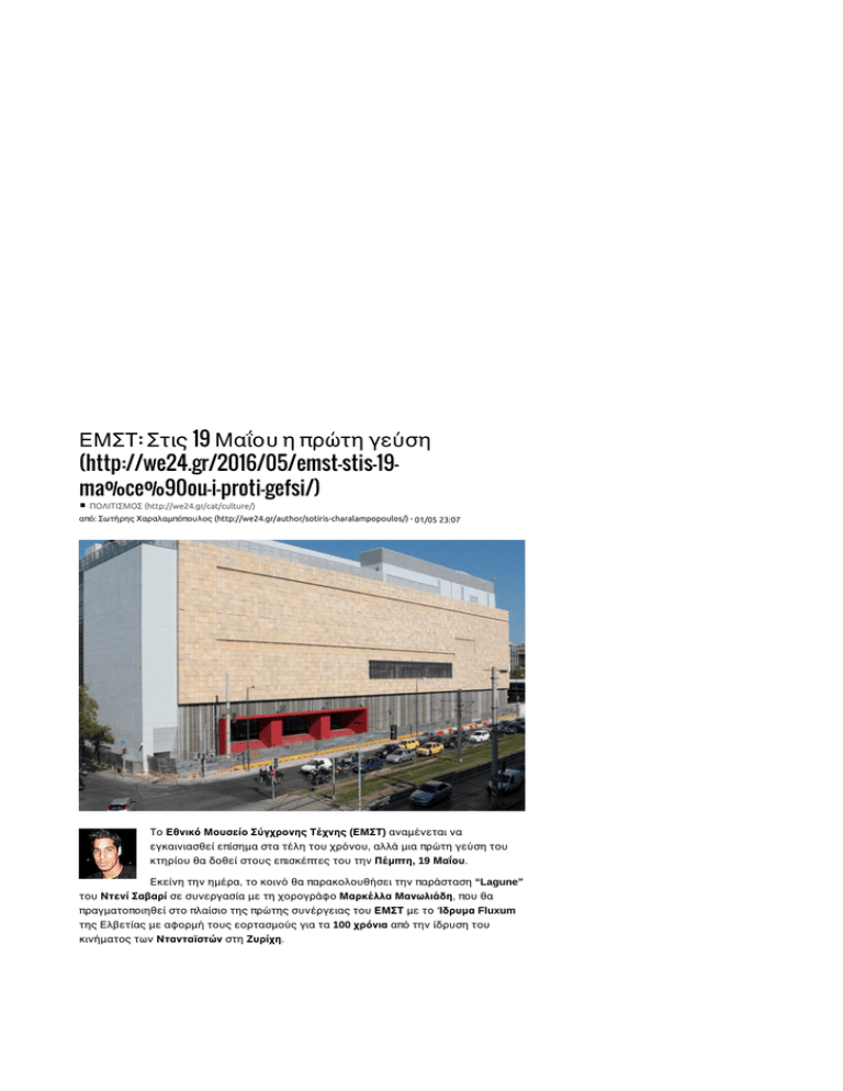 "#$%: $&'( 19 #)*+, - ./0&- 1234- | We24.gr - "5-μ7/84- 9)' 2.'9+'585:) μ2 ;')<+/2&'9=&-&) 08.05.16 07:22 (http://we24.gr) WE ARE (http://we24.gr/cat/weare/) ΠΑΙΔΕΙΑ (http://we24.gr/cat/education/) LIFE (http://we24.gr/cat/life/) ΠΟΛΙΤΙΣΜΟΣ (http://we24.gr/cat/culture/) ΤΕΧΝΟΛΟΓΙΑ (http://we24.gr/cat/technology/) ΠΟΛΙΤΙΚΗ (http://we24.gr/cat/politics/) ΥΓΕΙΑ (http://we24.gr/cat/health/) ΑΘΛΗΤΙΣΜΟΣ (http://we24.gr/cat/sports/) ΟΙΚΟΝΟΜΙΑ (http://we24.gr/cat/economy/) ΕΜΣΤ: Στις 19 Μαΐου η πρώτη γεύση (http://we24.gr/2016/05/emst-stis-19ma%ce%90ou-i-proti-gefsi/) ■ ΠΟΛΙΤΙΣΜΟΣ (http://we24.gr/cat/culture/) (https://www.facebook.com/we24.gr) (https://plus.google.com/u/0/b/108294135669501845311/108 από: Σωτήρης Χαραλαμπόπουλος (http://we24.gr/author/sotiris-charalampopoulos/) - 01/05 23:07 (https://twitter.com/we24gr) (https://www.youtube.com/channel/UCtW2UvZRdurZOwRbW nM1_Q) ΔΕΛΤΙΟ ΕΙΔΗΣΕΩΝ (http://we24.gr/cat/deltio-eidiseon/) (http://we24.gr/cat/news-in-english/) (http://we24.gr/cat/actualites-enfrancais/) (http://we24.gr/cat/новини- на-български-език/) (http://we24.gr/cat/lajme-ne-shqip/) ΤΕΛΕΥΤΑΙΕΣ ΕΙΔΗΣΕΙΣ (http://we24.gr/cat/politics/) Το Εθνικό Μουσείο Σύγχρονης Τέχνης (ΕΜΣΤ) αναμένεται να εγκαινιασθεί επίσημα στα τέλη του χρόνου, αλλά μια πρώτη γεύση του κτηρίου θα δοθεί στους επισκέπτες του την Πέμπτη, 19 Μαΐου. Εκείνη την ημέρα, το κοινό θα παρακολουθήσει την παράσταση “Lagune” του Ντενί Σαβαρί σε συνεργασία με τη χορογράφο Μαρκέλλα Μανωλιάδη, που θα πραγματοποιηθεί στο πλαίσιο της πρώτης συνέργειας του ΕΜΣΤ με το Ίδρυμα Fluxum της Ελβετίας με αφορμή τους εορτασμούς για τα 100 χρόνια από την ίδρυση του κινήματος των Ντανταϊστών στη Ζυρίχη. Tweet Like 2 0 (http://we24.gr/2016/05/pgdm-proti-provapics-vids/) ΠΓΔΜ: Πρώτη πρόβα (pics, vids) (http://we24.gr/2016/05/pgdmproti-prova-picsvids/) από: Σωτήρης Χαραλαμπόπουλος (http://we24.gr/author/sotirischaralampopoulos/) - 04/05 18:02 Μοιραστείτε το.. ■ EUROVISION (http://we24.gr/cat/culture/eurovision/) http://we24.gr/2016/05/emst-stis-19-ma*ou-i-proti-gefsi/ Page 1 sur 5