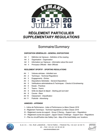 RÈGLEMENT PARTICULIER SUPPLEMENTARY REGULATIONS Sommaire/Summary DISPOSITION GÉNÉRALES - GENERAL DISPOSITIONS Art Art Art Art 1 2 3 4 Définition de l’épreuve - Definition of the meeting Organisation - Organisation Information sur l’épreuve - Information about the event Principaux Officiels - Main Officials REGLEMENT SPORTIF - SPORTING REGULATIONS Art Art Art Art Art Art Art Art Art Art Art 1 2 3 4 5 6 7 8 9 10 11 Voitures admises - Admitted cars Technique - Technical Regulations Engagements - Entries Dispositions Générales - General Dispositions Vérifications administratives & Techniques - Checks & Scrutineering Essais - Practices Teams - Teams Grille de départ et départ - Starting grid and start Course - Race Classement - Classification Publicité - Advertising ANNEXES - APPENDIX I – Indice de Performance - Index of Performance Le Mans Classic 2016 II – Règlement Technique - Technical regulations Le Mans Classic 2016 III – Règlement course de support - Group C Racing – Support race – Regulations IV – Règlement course de support - Jaguar Classic Challenge – Support race – Regulations V – Plan du circuit/Position des Safety Cars - Map of the track/Safety cars’ locations S.A.V.H. – 103, RUE LAMARCK – 75018 PARIS – FRANCE TEL +33 (0)1 42 59 73 40 – FAX +33 (0)1 42 59 48 28 www.lemansclassic.com I - DISPOSITIONS GENERALES ARTICLE 1 – DEFINITION DE L’EPREUVE Le MANS CLASSIC est une épreuve Nationale à Participation Etrangère Autorisée (NPEA). Le présent règlement a reçu le permis d'organisation N° 501 en date du 12.05.2016 Deux courses de support sont organisées dans le cadre du Mans Classic et font l’objet de règlements spécifiques : - Une course de la série Groupe C Racing (cf Annexes III et IIIbis) - Une course du Jaguar Classic Challenge (cf Annexe IV) ARTICLE 2 – ORGANISATION 2.1/ Le Mans Classic est organisé conformément aux prescriptions : - du Code Sportif International de la FIA 2016. - de la Fédération Française du Sport Automobile 2016. - du Règlement Particulier de l’épreuve. 2.2/ Par le fait même de leur engagement et de leur participation à l’épreuve, les concurrents et les conducteurs, s’engagent à respecter le règlement en toutes circonstances. ARTICLE 3 – INFORMATIONS SUR L’EPREUVE 3.1/ L’Association Sportive Automobile ACO des 24 Heures du Mans organise “Le Mans Classic” avec les moyens de SAVH créatrice de l’épreuve. 3.2/ DateS de l’Epreuve :6 – 7 - 8, 9 et 10 juillet 2016 3.3/ Longueur du Circuit : 13,629 km 3.4/ Engagements Dans la limite des places disponibles, les engagements pourront être acceptés jusqu’au 15 juin à minuit (les dates limites d’engagements peuvent être prorogées. Les engagements se font uniquement sur invitation). 3.5/ Voitures admises VÉHICULES HISTORIQUES CATEGORIE DE VEHICULES Voitures Voitures Voitures NOMBRE AUTORISE En course, départ arrêté Aux essais, (valeurs départ lancé) Tourisme et GT Sport bi-places avant le 01/01/1966 Vitesse 68 (75) 81 Sport bi-places à partir du 01/01/1966 Vitesse 68 (75) 81 3.6/ Accessibilité au circuit L’accès du circuit sera autorisé pour les concurrents à partir du mercredi 6 juillet 14h00. Le Parc du Houx sera ouvert le mercredi 6 juillet à partir de 14h00. 3.7/ Vérifications Administratives et Techniques. Elles se feront sur convocations : Vérifications Administratives ................... Mercredi 6 juillet de 14h30 à 18h00 Jeudi 7 juillet de 8h30 à 18h00 Lieu ........................................................ Welcome Vérifications Techniques ......................... Elles se feront sur le circuit dans chacun des paddocks Mercredi 6 juillet 14h30 à 18h00 Jeudi 7 juillet de 8h30 à 18h00 REGLEMENT PARTICULIER LE MANS CLASSIC 2016 – V6 14-04-2016 I – GENERAL DISPOSITIONS ARTICLE 1 – DEFINITION OF THE MEETING “LE MANS CLASSIC” is a National Historic Race, with authorised foreign participation (NPEA). These regulations were granted the Organisation permit number N°501 on 12.05.2016. Two support races are organized during the Le Mans Classic event with specific regulations: - A race of Group C Racing Series (refer to Appendix III & III bis) - A race of Jaguar Classic Challenge (refer to Appendix IV) ARTICLE 2 – ORGANISATION 2.1/ Le Mans Classic is organised according to the following prescriptions: - 2016 FIA International Sporting Code (I.S.C.) - 2016 French Automobile Federation (F.F.S.A.) - The Supplementary Regulations of the event 2.2/ By entering the event, the competitors and drivers undertake to abide by the regulations, whatever the circumstances are. ARTICLE 3 – INFORMATION ABOUT THE EVENT 3.1/ The “Association Sportive Automobile ACO” organises “Le Mans Classic” by the means of SAVH, creator of the meeting. 3.2/ Dates of the event : Wednesday 6, Thursday 7, Friday 8, Saturday 9 and Sunday 10 of July 2016 3.3/ Length of the track : 13,629 km 3.4/ Entries : Within the limit of the availabilities, the entries will be accepted until 15 June 2016 midnight (The deadlines can be extended. Entries can only be made on invitation). 3.5/ Admitted Cars HISTORIC CARS CATEGORIES Touring cars and GT TSRC before 01/01/1966 AUTHORISED NUMBER Race, standing start Practice (Race, rolling start) 68 (75) 81 68 (75) 81 Sprint TSRC From 01/01/1966 Sprint 3.6/ Access to the circuit Access to the circuit for competitors will be allowed from Wednesday 6th of July - 14:00 The Parc du Houx will be open from Wednesday 6th of July – 14:00 3.7/ Checks and Scrutineering. To be made on notification Administrative Checks ................. Wednesday 6th of July from 14:30 to 18:00 Thursday 7th of July from 8:30 to 18:00 Location ...................................... Welcome Center Scrutineering ............................... Will take place at the circuit in each paddock Wednesday 6th of July from 14:30 to 18:00 Thursday 7th of July from 8:30 to 18:00 REGLEMENT PARTICULIER LE MANS C