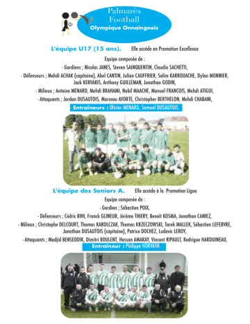 Palmarès Football Olympique Onnaingeois L'équipe U17 (15 ans). Elle accède en Promotion Excellence Equipe composée de : - Gardiens ; Nicolas JANES, Steven SAINQUENTIN, Claudio SACHETTI, - Défenseurs ; Mehdi ACHAK (capitaine), Abel CANTIN, Julien CAUFFRIER, Salim KARROUACHE, Dylan MONNIER, Jack KERVAKIS, Anthony GUILLEMAN, Jonathan GODIN, - Milieux ; Antoine MENARD, Mehdi BRAHAMI, Nabil MAACHE, Manuel FRANCOIS, Mehdi ATIGUI, - Attaquants ; Jordan DUSAUTOIS, Marceau AVORTE, Christopher BERTHELON, Mehdi CHABANI, - Entraîneurs : Olivier MENARD, Samuel DUSAUTOIS. L'équipe des Seniors A. Elle accède à la Promotion Ligue Equipe composée de : - Gardien ; Sébastien POIX, - Défenseurs ; Cédric BIHI, Franck GLINEUR, Jérôme THIERY, Benoît KOSMA, Jonathan CANIEZ, - Milieux ; Christophe DELCOURT, Thomas KAROLCZAK, Thomas KRZECZOWSKI, Tarek MALLEK, Sébastien LEFEBVRE, Jonathan DUSAUTOIS (capitaine), Patrice DOCHEZ, Ludovic LEROY, - Attaquants ; Madjid BENSEDDIK, Dimitri BOULENT, Hassan AMARAY, Vincent RIPAULT, Rodrigue HARDUINEAU, - Entraîneur : Philippe HORVATH. Palmarès Athlétisme Association Sportive Athlétique d’Onnaing Amélia DELALLEAU, 10 ans, poussine 1ère place au cross country de Montigny en Gohelle et à la course de Bruay sur Escaut. 8ème au championnat départemental de cross country à Fourmies (janvier 2010). Corentin CARLIER, 15 ans, minime 3ème place à la course de Saultain et de Sebourg. Participation au championnat départemental de cross country à Fourmies (janvier 2010). Noémie CARLIER, 12 ans, benjamine Corentin CARLIER Amélia DELALLEAU Noémie CARLIER 4ème place à la course de Saultain. Participation au championnat départemental de cross country à Fourmies (janvier 2010). Noémie MASSON, 10 ans, poussine Participation au championnat départemental d’athlétisme (juin 2010). Théophile MENGELLE, 10 ans, poussin 3ème en cross au challenge Michel Bernard. Omar BEN vétéran BALLA, 1er au 5 km à la course de Marly (juin 2010). En catégorie «éveil athlé», 8 ans Romain DELALLEAU, Cyndel WASZCZYSZYN, et Angelo COMIN 1ers en individuel endurance au championnat du Nord (Fourmies, janvier 2010). Adeline BALLEUX 1ère en endurance au challenge Michel Bernard. Thomas BASINSKI, Jérémy BASINSKI, Yanis LEFEVRE, Lucas BERDOU, Thomas KINNEN, Léa KINNEN, Camille MERIAUX, Sandy HOSDEZ, et Maxime COMIN ont participé aux kids athlétics et ont obtenu de bons résultats. 2 Entraîneurs : Jean-Philippe BALLEUX, Grégory BALLEUX, Sébastien WASZCZYSZYN, Odette BALLEUX, Elisabelle DELORME. Palmarès combat Ecole Ying Chuan de Kung Fu et Tai Chi Chuan d’Onnaing Stéphane TISON, senior, catégorie lourd 1er à la Coupe fédérale nationale d’assauts à Saint Maur des Fossés (avril 2010). Palmarès Tir à l’arc Les Archers d’Onnaing Océane RUFFI, 10 ans, poussine, catégorie arc classique sans viseur Championne du Nord en salle (Courchelettes - janvier 2010). 3 compétitions, 3 podiums, 3 premières places. Emilie VANDENEECKHOUTTE, 15 ans, minime, catégorie arc à poulies avec viseur Championne du Nord en salle (Courchelettes - janvier 2010). Championne du Nord - Pas de Calais en salle (Nœux les Mines - janvier 2010). Championne de France en extérieur (Poitiers - mai 2010). 10 compétitions, 10 premières places. Eric VANDENEECKHOUTTE, 45 ans, senior, catégorie arc classique avec viseur Valentin VANDENEECKHOUTTE, 12 ans, benjamin, catégorie arc classique avec viseur 16ème au championnat de France (Poitiers - mai 2010). 16ème au championnat de France (Poitiers - mai 2010). 11 compétitions, 5 podiums. 10 compétitions, 7 podiums. Gaetan ANIERE, 27 ans, senior, catégorie arc à poulies avec viseur Louis DELHAYE, 64 ans, vétéran, catégorie arc à poulies avec viseur Médaille de bronze au championnat du Nord en salle (Courchelettes - janvier 2010). Vice-champion du Nord en salle (Courchelettes - janvier 2010). Médaille de bronze au championnat régional en salle (Noeux les mines - janvier 2010). Champion du Nord - Pas de Calais en salle (Nœux les Mines - janvier 2010) et en extérieur (Anzin - mai 2010). 8ème au Championnat de France en extérieur (Poitiers - mai 2010). Médaille de bronze au championnat de France en extérieur (Poitiers - mai 2010). 12 compétitions, 8 podiums. 10 compétitions, 10 podiums dont 8 premières places. 3 Palmarès Tennis de Table TTO Aurélien VANDEPUTTE, 7 ans, Ritchy CARCEL, 7 ans et Clément LASSELIN, 6 ans, poussins Participation au Top District. Aurélien Vandeputte et Ritchy Carcel obtiennent respectivement les 2ème et 3ème places aux Individuels du Valenciennois. Vanessa VILAIN, 8 ans, benjamine Sélectionnée au Top Régional et aux Individuelles Régionales. Equipe Régionale 3 féminine Accession en Régionale 2. Equipe composée de Laura DEFROMONT, 13 ans, Mélissa VILAIN, 14 ans, et Karine JOSSE, 13 ans. Laura JOSSE, 19 ans, senior Montée en critérium fédéral Nationale 2 dames. Lucie MARIAGE, senior Médaille de bronze à la finale régionale par classement, catégorie 1.000 à 1.299 points. Aymeric SAMARCQ, 25 ans, senior Meilleure progression mensuelle nationale. Nadine KORYCIAK, vétérane Médaille de bronze à la finale régionale par classement, catégorie 500 à 599 points. Jean-Marcel BATON et Christian LANDAT, vétérans 1ers au championnat départemental vétérans. 4 Entraîneur : Jean-Marie CAPIAUX. Palmarès Tir Sportif Avenir d’Onnaing Gwendoline HENNEBERT, poussine Championne de France en individuel et par équipe en carabine 10 m 40 balles couché (championnat de France handisport Dieuze). Détient le record de France en carabine 10m 40 balles couché. Arnaud LERNOUD, benjamin Vice-champion de France en individuel et par équipe en carabine 10m 40 balles couché (championnat de France handisport - Dieuze). Clément BOMBLED, 16 ans Vice-champion du Nord par équipe en carabine 10m (13-16 ans) (départementaux UFOLEP hiver). Médaille de bronze au championnat régional par éq