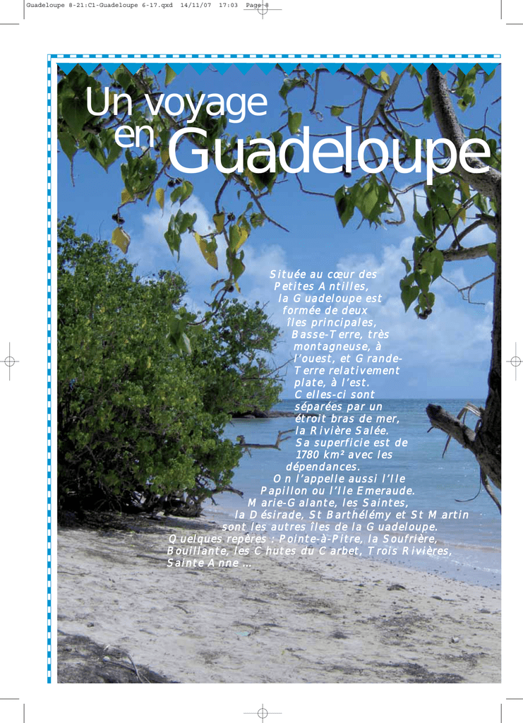 Guadeloupe 8-21:C1-Guadeloupe 6-17.qxd 14/11/07 17:03 Page 8 Un voyage en Guadeloupe Située au cœur des Petites Antilles, la Guadeloupe est formée de deux îles principales, Basse-Terre, très montagneuse, à l’ouest, et GrandeTerre relativement plate, à l’est. Celles-ci sont séparées par un étroit bras de mer, la Rivière Salée. Sa superficie est de 1780 km² avec les dépendances. On l’appelle aussi l’Ile Papillon ou l’Ile Emeraude. Marie-Galante, les Saintes, la Désirade, St Barthélémy et St Martin sont les autres îles de la Guadeloupe. Quelques repères : Pointe-à-Pitre, la Soufrière, Bouillante, les Chutes du Carbet, Trois Rivières, Sainte Anne … Guadeloupe 8-21:C1-Guadeloupe 6-17.qxd 14/11/07 17:03 Page 9 U N V O YA G E E N G U A D E L O U P E GUADELOUPE : 1 780 km 2 De façon générale A savoir Décalage horaire : La Guadeloupe fut découverte en 1493 par Christophe Colomb. Antérieurement peuplée par les Indiens Caraïbes, les premiers européens arrivent au XVIIe siècle. Depuis 1946, c’est un département d’Outre-Mer. Avec la musique (biguine, zouk), la cuisine est un des grands attraits de ces îles et vous apprécierez les nombreuses spécialités : accras, boudins, crabe farci, colombo, flan coco, banane verte, riz créole, etc … De nombreuses excursions sont possibles au départ des hôtels (en autocar, en bateau, page 7). Nous vous recommandons de louer une voiture au départ de France pour plus d’autonomie (prix intéressants, page 6). Formalités : Carte nationale d’identité ou passeport (en cours de validité). Climat : Climat tropical tempéré par les alizés (de 23 à 35° selon la période de l’année). Eau à 25/26°. Petite saison des pluies de juillet à septembre. Par rapport à la France, compter - 6 heures en Eté - 5 heures en Hiver Electricité : 220 volts dans tous les établissements touristiques. Monnaie : L’Euro. Attention les chèques de métropole ne sont pas acceptés (hors place). Langue : Le Français est la langue officielle mais tout le monde parle aussi le Créole. Combinés Guadeloupe/Martinique Parce que parfois vous hésitez entre ces deux îles, ou encore vous disposez de temps, n’hésitez pas à nous demander de combiner deux séjours. Cela sera fait entièrement à la carte, selon vos désirs, en bateau, en avion, avec des durées variables sur chaque île. Rendez-vous en page 7. Vue aérienne Ilet Caret 9 Guadeloupe 8-21:C1-Guadeloupe 6-17.qxd 14/11/07 17:03 Page 10 Résidence Le Domaine de May - Location À PARTIR DE 508 € * Prix par logement et par semaine (7 nuits), location seule Selon logement Période Du 01/11 au 14/12 Studio 2 personnes Appart. F2 2 personnes Appart. F3 4 personnes Bungalow F2 4 personnes 342 435 516 550 Du 15/12 au 31/03 451 559 700 746 Du 01/04 au 31/10 367 451 537 563 Durée minimum : 3 nuits (diviser la semaine par sept, multiplier par le nombre de nuits, et ajouter 10 € par jour) A régler sur place, par personne : petitdéjeuner 7 €, dîner 25 € Possibilité de lit supplémentaire enfant + 17 € par jour Notre coup de cœur Un havre de paix, proche de Saint-François, au charme typiquement caraïbes. Location de voiture recommandée. Taxe de séjour à régler sur place * Prix à partir de, base 4 personnes, vols Air France, au départ de Paris hors taxes, 7 nuits en « Appartement F3 », entre le 1/05 et le 12/06, avec location de voiture Situation : St-François, GrandeTerre (au sud-est), 35 km de l’aéroport. A 5 mn en voiture de St-François et des plages, dans un grand parc tropical, le Domaine de May vous offre un petit paradis exotique, calme et attachant. Votre logement : un ensemble de 19 logements, en bungalows, studios et appartements (sur 2 étages), de 2 à 4 personnes. Climatisation dans les chambres de 18h30 à 7h30, télévision, moustiquaire, salle de douche et WC. Possibilité de barbecue. - 4 studios pour 2 personnes : chambre avec grand lit, kitchenette, terrasse de 6 m² - 5 appartements F2 pour 2 personnes : chambre avec grand lit ou 2 lits, cuisine/séjour, terrasse de 10 m² - 3 bungalows F2 pour 4 personnes : chambre avec grand lit, séjour avec 2 lits simples, cuisine, 2 petites terrasses - 5 appartements F3 pour 4 La Colline Verte - Location personnes : 2 chambres avec grand lit et 2 lits simples, cuisine/séjour A disposition : piscine, chaises longues, restaurant. A proximité : à 5 mn en voiture, casino, marina, nombreux commerces et restaurants, différents sports, possibilité d’excursions. À PARTIR DE 571 € * Notre coup de cœur Situation : Deshaies, BasseTerre (au nord), 30 mn de l’aéroport. Dans un cadre de verdure, à 5 mn de l’une des plus belles plages de Guadeloupe et avec vue panoramique sur l’îlet Kawane, cette location vous permettra de découvrir le paysage varié et fascinant de la région. Prix par logement et par nuit, location seule Selon logement Période En double En single En double + 1 enfant En double + 2 enfants Du 01/11 au 16/12 Du 01/05 au 30/06 Du 01/09 au 31/10 41 41 45 49 Du 17/12 au 30/04 65 57 74 81 Du 01/07 au 31/08 43 43 48 53 Supplément climatisation (bungalow occupé) : 9 € par jour Taxe de séjour à régler sur place * Prix à partir de, base 2 personnes, vols Air France, au départ de Paris hors taxes, entre le 1/05 et le 12/06, avec location de voiture 10 Votre logement : 10 chalets créoles (5 bungalows) avec cuisine aménagée et salon sur terrasse, grand lit ou 2 lits, petit jardin individuel, ventilateur dans la chambre. A disposition : piscine. A proximité : restaurants, commerces. A voir sur place : visite guidée de l’île, planche à voile, plongée sousmarine, pêche au gros, tennis, balades en mer, excursions, jeux pour enfants, mini-golf. La vue sur la mer de tous les bungalows, la taille du lieu qui en fait une expérience différente, un accueil créole de qualité. Location de voiture recommandée Guadeloupe 8-21:C1-Guadeloupe 6-17.qxd 14/11/07 17:03 Pag