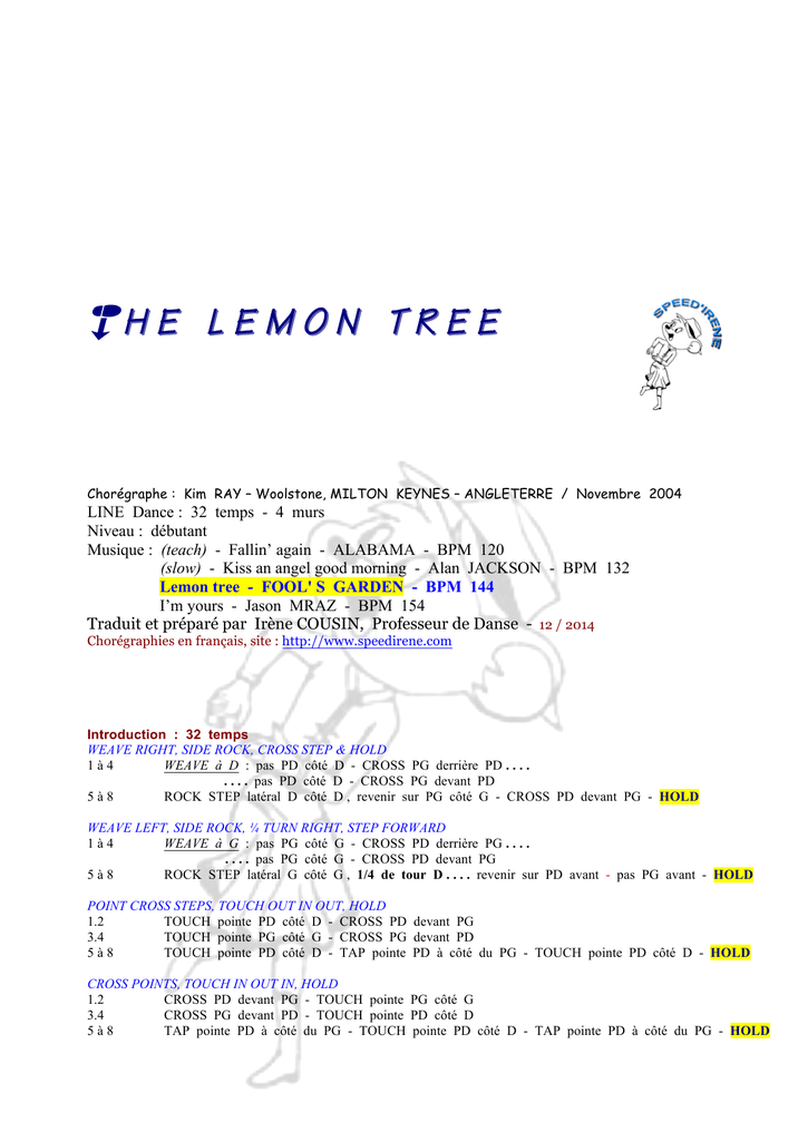TH E L E M O N T R E E Chorégraphe : Kim RAY – Woolstone, MILTON KEYNES – ANGLETERRE / Novembre 2004 LINE Dance : 32 temps - 4 murs Niveau : débutant Musique : (teach) - Fallin’ again - ALABAMA - BPM 120 (slow) - Kiss an angel good morning - Alan JACKSON - BPM 132 Lemon tree - FOOL' S GARDEN - BPM 144 I’m yours - Jason MRAZ - BPM 154 Traduit et préparé par Irène COUSIN, Professeur de Danse - 12 / 2014 Chorégraphies en français, site : http://www.speedirene.com Introduction : 32 temps WEAVE RIGHT, SIDE ROCK, CROSS STEP & HOLD 1à4 WEAVE à D : pas PD côté D - CROSS PG derrière PD . . . . . . . . pas PD côté D - CROSS PG devant PD 5à8 ROCK STEP latéral D côté D , revenir sur PG côté G - CROSS PD devant PG - HOLD WEAVE LEFT, SIDE ROCK, ¼ TURN RIGHT, STEP FORWARD 1à4 WEAVE à G : pas PG côté G - CROSS PD derrière PG . . . . . . . . pas PG côté G - CROSS PD devant PG 5à8 ROCK STEP latéral G côté G , 1/4 de tour D . . . . revenir sur PD avant - pas PG avant - HOLD POINT CROSS STEPS, TOUCH OUT IN OUT, HOLD 1.2 TOUCH pointe PD côté D - CROSS PD devant PG 3.4 TOUCH pointe PG côté G - CROSS PG devant PD 5à8 TOUCH pointe PD côté D - TAP pointe PD à côté du PG - TOUCH pointe PD côté D - HOLD CROSS POINTS, TOUCH IN OUT IN, HOLD 1.2 CROSS PD devant PG - TOUCH pointe PG côté G 3.4 CROSS PG devant PD - TOUCH pointe PD côté D 5à8 TAP pointe PD à côté du PG - TOUCH pointe PD côté D - TAP pointe PD à côté du PG - HOLD The Lemon Tree Choreographed by Kim RAY Description : 32 count, 4 wall, Beginner Line Dance Music : Lemon tree by FOOL’S GARDEN [Dish of the Day] WEAVE RIGHT, SIDE ROCK, CROSS STEP & HOLD 1-2 Step right to right side, cross step left behind right 3-4 Step right to right side, cross step left in front of right 5-6 Rock right to right side, recover on left 7-8 Cross right over left, hold WEAVE LEFT, SIDE ROCK, ¼ TURN RIGHT, STEP FORWARD 9-10 Step left to left side, cross step right behind left 11-12 Step left to left side, cross step right over left 13-14 Rock left to left side, 1/4 turn right stepping forward on right 15-16 Step forward on left, hold POINT CROSS STEPS, TOUCH OUT IN OUT, HOLD 17-18 Point right toe to right side, cross step right over left 19-20 Point left toe to left side, cross step left over right 21-22 Touch right toe to right side, touch right toe next to left 23-24 Touch right toe to right side, hold CROSS POINTS, TOUCH IN OUT IN, HOLD 25-26 Cross step right over left, point left toe to left side 27-28 Cross step left over right, point right toe to right side 29-30 Touch right toe next to left, touch right toe to right side 31-32 Touch right toe next to left, hold REPEAT http://www.kickit.to/