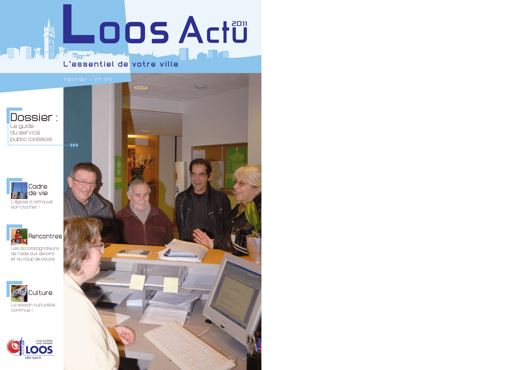 2011 L ’ e s s e n t i e l d e vo t r e v i l l e Févr ie r -n ° 1 1 4 Dossier : Le guide du service public loossois Cadre devie L’église a retrouvé son clocher ! Rencontres Les accompagnateurs de l’aide aux devoirs et au coup de pouce Culture La saison culturelle continue ! Loosjumelée avecGeseke S o mmair e En direct @vec vous ! Vivre à Loos page 2 Loos Rétro page 2 Édito page 3 Agenda du Maire page 3 Arrêt sur images pages 4 et 5 Vie Municipale Cadre de Vie Vie Économique page 6 page 8 page 15 Dossier Le guide du service public loossois État civil page 14 Rencontre Les accompagnateurs de l’aide aux devoirs page 16 pages 9 à 12 page 13 propriétaire, une attention toute particulière concernant le nettoyage de leurs déjections canines. Vous pouvez trouver des Toutounet et des Puppiclean, sacs de ramassage gratuits, dans les accueils publics municipaux. Ne reste plus qu’à vous en servir ! Les chiens doivent obligatoirement être tenus en laisse ; hormis dans les espaces qui leur sont réservés. C’est le cas, par exemple, au Parc de Loisirs et de Nature où une aire de 6 000 m² a été mise à leur disposition afin qu’ils puissent courir en toute liberté. Rappelons également que les fidèles compagnons de l’homme nécessitent, de la part de leur Veille du ramassage des encombrants, j’ai trouvé sur mon trottoir des bidons contenant des produits huileux ou d’origine pétrolière. Est-ce normal ? Culture Loisirs page 17 page 18 Agenda page 19 Anonyme Ménagers Spéciaux (DMS) car ils représentent un danger pour la population et l’environnement. Déposés sur un trottoir, ils sont dangereux pour le personnel de collecte et peuvent altérer le bon fonctionnement des centres de traitement. C’est pourquoi des collectes spécifiques sont organisées pour les DMS. Pour en connaître les dates, vous pouvez consulter l’agenda global en page 19 du Loos Actu, le site Internet ville-loos.fr, ou vous procurer le calendrier des collectes de DMS disponible en mairie. Non, ces produits sont appelés Déchets 2 Réalisée en cuivre et ornementée de motifs naturalistes, elle pèse 90 kilos. Mais pourquoi n’est-elle plus à sa place ? Durant la première guerre mondiale, elle fut très certainement fondue par les allemands. La cloche d’origine a donc été remplacée par une nouvelle, en 1924. Cependant, tout aussi mystérieusement, elle disparut à nouveau et fut retrouvée, en 2005, au Centre So- À Loos, le ser vice public est une tradition bien ancrée, c o m m e n t l e d é fi n i r i e z - v o u s ? Toute l'équipe municipale attache énormément d'importance à la qualité du service public dans notre ville. L'idée qui sous-tend l'action municipale est que chaque Loossois doit pouvoir compter sur un service de qualité et à un juste prix, quels que soient ses besoins. Comme vous pourrez le lire dans le dossier consacré à ce sujet dans ce numéro, notre ville dispose d'une large palette de services pour les Loossois de tous âges, principalement réalisés par les services municipaux, et nous en sommes fiers. Une offre d'animations riche et variée, un programme culturel de qualité, une politique de service de la petite enfance et des personnes âgées qui offre de la souplesse, doivent permettre à chaque Loossois de bien vivre au quotidien. Mais bien vivre sa ville ne se limite pas aux ser vices publics… Vous avez raison et parce que mieux vivre sa ville au quotidien ce n'est pas que des services, la municipalité cherche toujours à améliorer notre cadre de vie. J'en veux pour preuve notre attachement au patrimoine de notre ville. La magnifique opération de rénovation de la flèche du clocher de l'église Notre-Dame en est un bon exemple récent. Notre environnement change aussi, je pense notamment à l’inauguration de 122 logements au domaine du Pavé d’Emmerin qui marque le début d’une série de création de près de 885 logements sur les emplacements des anciennes friches industrielles, qui permettront à terme à de nombreuses familles de s’épanouir dans notre ville. L o o s R ét r o Le journal d’informations municipales de la Ville de Loos est édité par le Service Communication de la Mairie de Loos 104 rue du Maréchal Foch 59120 Loos Tél : 03.20.10.40.00 - Email : [email protected] Directeur de la publication : Daniel Rondelaere Rédaction et photos : services municipaux, Agence Aria-Nord Dépôt légal : 1er trimestre 2011 Conception graphique & impression : sarl Graph1prim - Loos. d it o La municipalité cherche toujours à améliorer notre cadre de vie. Vous avez été nombreux à nous envoyer des emails concernant les chiens non tenus en laisse dans les espaces verts et lieux publics. Voici donc un rappel des règles à tenir avec son animal de compagnie. Sans doute avez-vous déjà vu cette grande cloche dans les couloirs de l’Hôtel de Ville… Toutefois, peu de gens connaissent son histoire : la voici. Il s’agit de la cloche du Beffroi. Elle fut, très probablement, fondue et installée en même temps que la construction de l’Hôtel de Ville, en 1884. É dÉ it o Le guide E n d ir e c t @ ve c vo u s ! La cloche du Beffroi Entretien avec Daniel Rondelaere, Maire de Loos, Conseiller Général du Nord Expressions politiques cial Arago ; soit une semaine avant la cérémonie de classement du Beffroi au patrimoine mondial de l’UNESCO. Le saviez-vous ? En 1930, les pompiers utilisèrent la cloche en guise de clairon pour signifier la création du corps des pompiers volontaires. Ce bulletin d’information municipal est imprimé sur papier 100% recyclé, dans le respect de la démarche imprim’Vert qui implique : - élimination conforme des déchets dangereux : solvants de nettoyage, solutions de mouillage usées, boîte d’encres, cartouches de toner… - stockage des liquides dangereux en rétention, - abandon des produits étiquetés toxiques au profit de produit moins dangereux , - utilisation d’un p