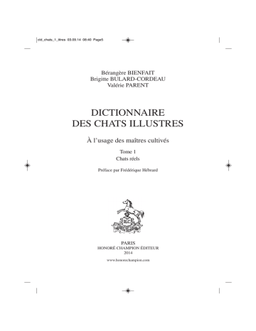 cld_chats_1_titres 03.09.14 08:40 Page5 Bérangère BIENFAIT Brigitte BULARD-CORDEAU Valérie PARENT DICTIONNAIRE DES CHATS ILLUSTRES À l’usage des maîtres cultivés Tome 1 Chats réels Préface par Frédérique Hébrard PARIS HONORÉ CHAMPION ÉDITEUR 2014 www.honorechampion.com CLD_8_chats_illustres.qxp 25.07.14 10:08 Page345 TABLE DES MATIÈRES PRÉFACE par Frédérique Hébrard : Le chat… Les chats . . . . . AVANT-PROPOS par : Bérangère Bienfait . . . . . . . . . . . . . . . . . . . . . . . . . . . . . . . . . Brigitte Bulard-Cordeau . . . . . . . . . . . . . . . . . . . . . . . . . . . . . Valérie Parent . . . . . . . . . . . . . . . . . . . . . . . . . . . . . . . . . . . . . A 9 13 15 17 Acer et Perilla, reporters félins dans les jardins du musée d’Art de Philbrook, Tulsa, Oklahoma (États-Unis) . . . . . . 21 Ahmedabad, cause d’un incident diplomatique (États-Unis – Inde) . . . . . . . . . . . . . . . . . . . . . . . . . . . . . . . 22 Acoustic Kitty, chat-espion de la C.I.A. (États-Unis) . . . . . . . All Ball, le chat qui s’amusait avec Koko le gorille, Californie (États-Unis) . . . . . . . . . . . . . . . . . . . . . . . . . . . . Amourette, le brillant destin d’une chatte muse (France) . . . 21 22 23 Andrew, membre du Club des mascottes des Forces alliées (Angleterre) . . . . . . . . . . . . . . . . . . . . . . . . . . . . . . . . . . . . 24 Anfield Cat (Kenny), invité surprise lors d’un match de football, Liverpool (Angleterre), Moglet . . . . . . . . . . . 24 Andy, rescapé d’une chute de 16 étages, Floride (États-Unis) Apache, le chat qui vole, Paris, (France), Mounette, Ophélie, Harfang, Hugin, Loukoum, Titou, Luhna . . . . . . . . . . . . . Ariel, chat de Carl van Vechten, New-York (États-Unis) . . . . Arthur, héros chéri de la télévision anglaise (Angleterre) . . . Azincourt, chats de la capitainerie (Angleterre) . . . . . . . . . . . 24 25 25 26 26 CLD_8_chats_illustres.qxp 25.07.14 10:08 Page346 346 B DICTIONNAIRE DES CHATS ILLUSTRES Baba, première championne Mau (États-Unis) Geppa, Jojo, Liza . . . . . . . . . . . . . . . . . . . . . . . . . . . . . . . . 29 Baggage, inspirateur d’un programme TV, (Angleterre) . . . . 30 Baby, chat guide d’aveugle, Los Angeles (États-Unis) . . . . . 29 Barre de Rouille, le chat roux tigré de Joris Karl Huysmans (France), Mouche . . . . . . . . . . . . . . . . . . . . . . . . . . . . . . . . 30 Bébert, l’Ulysse de l’Odyssée célinienne (France) . . . . . . . . . 31 Bastet, déesse à tête de chatte (Égypte) . . . . . . . . . . . . . . . . . 31 Beerbohm, rival des plus grands tragédiens britanniques, Londres (Angleterre) . . . . . . . . . . . . . . . . . . . . . . . . . . . . . 33 Beppo, le chat héros de Lord Byron . . . . . . . . . . . . . . . . . . . . 34 Berlioz, pensionnaire du premier Café des Chats, 3e arrondissement (Paris), Djenko, Habby, Idylle, Khalessi, Lovely, Marguerite, Oréa, Pattenrond, Pépite, Rosa, Saha . . . . . . . . . . . . . . . . . . . . . . . . . . . . . . . 35 Belaud, le Chartreux du poète du Bellay (France) . . . . . . . . . Beppo, le chat clairvoyant de Jorge Luis Borges (Argentine) Bimbo, compagnon de Paul Klee (Suisse), Fripouille ou Fritzy, Nuggi, le Gris . . . . . . . . . . . . . . . . . . Blackberry, fondatrice de la race Munchkin (États-Unis), Bobby, Toulouse . . . . . . . . . . . . . . . . . . . . . . . . . . . . . . . . . Blackie, chat du Président Calvin Coolidge, Washington (États-Unis), Bounder, Climber, Smokey, Tiger, Timmie . . Blackie, ce chat qui parlait et plaidait, Augusta, Géorgie (États-Unis) . . . . . . . . . . . . . . . . . . . . . . . . . . . . . . . . . . . . Blackie, chat millionnaire (Angleterre) . . . . . . . . . . . . . . . . . Bob, le chat de James Bowen, Londres (Angleterre) . . . . . . . Boon, héritier de Beryl Reid, Bershire (Angleterre), Coco, Eileen, Hamish, Tuffnel . . . . . . . . . . . . . . . . . . . . . . 33 34 35 36 37 37 38 39 39 CLD_8_chats_illustres.qxp 25.07.14 10:08 Page347 TABLE DES MATIÈRES Bosh et Tommy, les deux chats d’Anne Frank, Amsterdam (Pays-Bas) . . . . . . . . . . . . . . . . . . . . . . . . . . . . . . . . . . . . . Bourget, Loulou, Mistigris, les trois matous de François Coppée (France) . . . . . . . . . . . . . . . . . . . . . . . 40 40 Brillant, le chat de Louis XV et de Marie Leszczynska, Versailles (France) . . . . . . . . . . . . . . . . . . . . . . . . . . . . . . . 41 Brownie et Minky, fondateurs de la race York Chocolat, état de New-York (États-Unis) . . . . . . . . . . . . . . . . . . . . . 41 Calice ou la vie de chat rêvée auprès de William Burroughs, Missouri (États-Unis) . . . . . . . . . . . . . . . . . . . . . . . . . . . . 45 Caritta, à chat perché sur Edgar Poe (États-Unis) . . . . . . . . . 46 Brocolis, brigadière de l’armée suisse, Lyss (Suisse) . . . . . . . C 347 Calvin, inspirateur de deux auteurs (États-Unis) . . . . . . . . . . 41 45 Casper, passager du bus n° 3, Plymouth (Angleterre) . . . . . . 46 Caterer, le chat qui tuait des pigeons pour nourrir Henry Wyatt, Maidstone (Angleterre) . . . . . . . . . . . . . . . . 48 Catarina, inspiratrice d’Edgar Poe (États-Unis) . . . . . . . . . . 47 Cat Mando (Cat Mandu), co-leader d’un parti politique (Angleterre) . . . . . . . . . . . . . . . . . . . . . . . . . . . . . . . . . . . . 48 Chamane, égérie pour la Française des jeux (France), Enchanting, Fripouille, Gaby, Grand Vizir, Guimauve, Gribouille, Gyp, Lilo, Miaou, Mystik, Phénix, Pitchoune, Pucinette, Punky . . . . . . . . . . . . . . . . . . . . . . . . . . . . . . . . 49 Cent chats pour une publicité Ikéa, Wembley (Angleterre) . . Chanoine, le chat très digne de Victor Hugo, (France), Gavroche . . . . . . . . . . . . . . . . . . . . . . . . . . . . . . . . . . . . . . Chase No Face, Lexington, Kentucky (États-Unis) . . . . . . . . Chopin adoucit les mœurs de Fitzgerald (États-Unis) . . . . . . Le chat d’Howard Hughes (États-Unis)