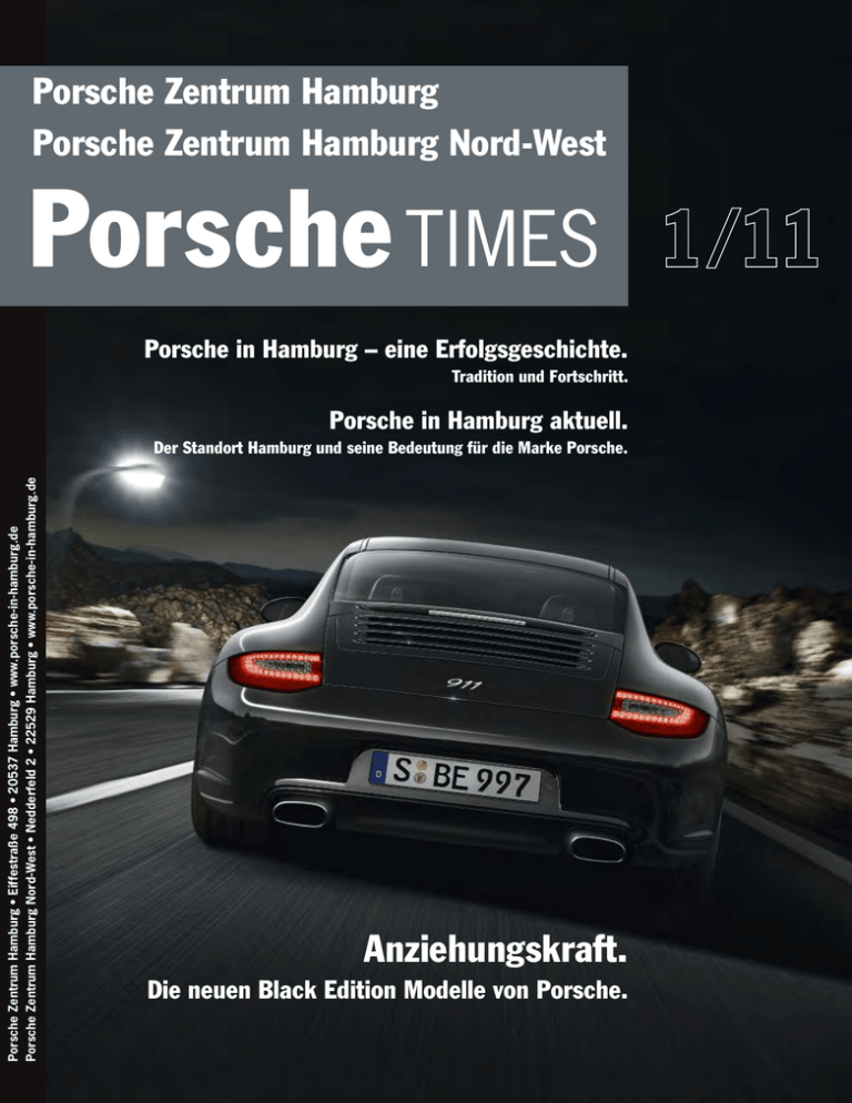 Porsche Zentrum Hamburg Porsche Zentrum Hamburg Nord-West Porsche in Hamburg – eine Erfolgsgeschichte. Tradition und Fortschritt. Porsche in Hamburg aktuell. Porsche Zentrum Hamburg • Eiffestraße 498 • 20537 Hamburg • www.porsche-in-hamburg.de Porsche Zentrum Hamburg Nord-West • Nedderfeld 2 • 22529 Hamburg • www.porsche-in-hamburg.de Der Standort Hamburg und seine Bedeutung für die Marke Porsche. Anziehungskraft. Die neuen Black Edition Modelle von Porsche. Please enjoy responsibly. www.massvoll - geniessen.de www.moet-hollywood.de INHALT Seite 3 | PORSCHE TIMES | EDITORIAL AUSGABE 1/11 „Wir blicken zielstrebig in die Zukunft, ohne dabei unsere Wurzeln zu vergessen.“ Die neuen Porsche Black Edition Modelle. 4 12 Tradition und Fortschritt. Porsche in Hamburg – eine Erfolgsgeschichte. Wir möchten sie Ihnen heute vorstellen. Liebe Porsche Freunde, sehr geehrte Damen und Herren, Unsere Teams. Porsche steht für Visionen weit über den Tachorand hinaus. Zu- 14 Der Standort Hamburg und seine Bedeutung für die Marke Porsche. 15 Cayenne und 911 ausgezeichnet. 17 Sieben hinreißende Leasingangebote für den Porsche 911 Carrera. 18 Anziehungskraft. 20 Aus Überzeugung. 23 Mobiler Informationsvorsprung mit Ihrem Porsche Zentrum Hamburg: 24 Porsche Exclusive feiert Geburtstag. als bisheriger Inhaber nach rund sechs Jahrzehnten aus dem 25 Jahre erfolgreiche Traumarbeit. Porsche Geschäft zurückgezogen. Selbstverständlich bleiben Ih- Ausgesuchte Tequipment Angebote zum Auftakt in die neue Saison. nen Ihre vertrauten Ansprechpartner erhalten, die Mitarbeiter und Porsche in Hamburg aktuell. gleich ist Porsche ein Unternehmen mit starken Idealen. Sämtliche Innovationen bauen auf den Traditionen und den Werten des 25 26 27 28 Gold für Porsche. Unternehmens und seines Gründers auf. Die Porsche Welt ist beständig in Bewegung, und gleichzeitig machen die Stuttgarter Auf Wolke sieben. Die neuen Black Edition Modelle von Porsche. Der neue Panamera S Hybrid. Ab in die App. das, was sie schon immer getan haben: faszinierende Traumwagen entwickeln. Auch in den Porsche Zentren in Hamburg gehen Erneuerung und Tradition seit nunmehr 60 Jahren harmonisch Hand in Hand. Im Februar haben wir Sie über die jüngste Veränderung informiert: Die Porsche Deutschland GmbH übernahm die Porsche Zentren Hamburg und Hamburg Nord-West. Der Raffay-Verbund hat sich Glänzende Aussichten für Ihren Porsche. Mitarbeiterinnen beider Porsche Zentren wurden von Porsche Nie hat es mehr Freude gebracht, in die Jahre zu kommen. übernommen. Auf diese Weise garantieren wir Ihnen den rei- Die Porsche Classic Card. bungslosen, erstklassigen und persönlichen Service, den Sie von Hightech für Klassiker. Und solche, die es noch werden wollen. uns erwarten dürfen. Heute möchten wir Sie einladen, ab Seite 4 Das Porsche Classic Radio-Navigationssystem. Herbert Linge: Motorsportler und Porsche Urgestein. Ein Mann der ersten Stunde. 29 Die neue 918 Spyder Kollektion. 30 Porsche Tour Toskana. Vorbote der Zukunft. mit uns die Geschichte von Porsche in Hamburg Revue passieren zu lassen. Und wir freuen uns, die Faszination Porsche auch in Zukunft für Sie erlebbar zu machen. Mit herzlichen Porsche Grüßen Kapriolen schlagen im Chianti. Impressum Porsche Times erscheint beim Porsche Zentrum Hamburg Nord-West. Nedderfeld 2, 22529 Hamburg, Tel. +49 (0)40 557768-0, Fax +49 (0)40 557768-22, E-Mail [email protected], www.porsche-in-hamburg.de, Auflage: 2.600 Stück. Porsche Times erscheint beim Porsche Zentrum Hamburg, Eiffestraße 498, 20537 Hamburg, Tel.: +49 (0)40 21105-0, Fax +49 (0)40 21105-234, E-Mail: [email protected], www.porsche-in-hamburg.de; Auflage: 3.700 Stück. Redaktion: Deutschmann Kommunikation, Winterhunder Kai 10, 22299 Hamburg. Für unverlangt eingesandte Fotos und Manuskripte wird keine Haftung übernommen. Die Verantwortung für die redaktionellen Inhalte und Bilder dieser Ausgabe übernimmt das Porsche Zentrum. Ausgenommen davon sind die offiziellen Seiten der Porsche Deutschland GmbH. Wilfried Hallier Götz von Tschirnhaus Geschäftsführer Geschäftsführer Porsche Zentrum Porsche Zentrum Hamburg Nord-West Hamburg PORSCHE INTERN PORSCHE TIMES | AUSGABE 1/11 | Seite 4 Tradition und Fortschritt. Porsche in Hamburg – Porsche Boxster, Cayman, 911, 1950 – der Startschuss für Zweifellos ein rasanter Start, doch Panamera und Cayenne – nie war Porsche in der Hansestadt. Ferdinand Porsche und seiner Firma, die Auswahl vielfältiger und facet- der Dr. Ing. h.c. F. Porsche KG, fehlt hr Herz für Porsche entdecken die zunächst das Kapital, um in Produkti- Hanseaten erstmals am Ballin- on gehen zu können. Ausgerechnet tenreicher als heute. Doch nicht I nur die neuesten Modelle, auch die damm 35. In den exklusiven Verkaufs- ein Hamburger, Leopold von Raffay, Klassiker sind im Norden gefragter räumen des Raffay-Unternehmens ist springt in die Bresche. Gemeinsam 1950 einer der ersten Sportwagen mit anderen VW-Großhändlern streckt ausgestellt – ein Porsche des Typs er das notwendige Kapital vor. denn je. Die Hanseaten haben eindeutig ein Faible für die Traumwa- 356. Zwischen den VW Käfern bringt gen „made in Zuffenhausen“, was er die Augen der Passanten zum Der Startschuss für die offiziellen Zulassungszahlen Leuchten und stiehlt den Volkswagen einen Mythos. eindrucksvoll belegen. Hamburg klar die Schau. Die ersten 50 Exemplare des 356 ent- ist Deutschlands unangefochtene Bereits 1948 ist der Prototyp im stehen noch in Gmünd, wohin Porsche Porsche Hauptstadt. Und das hat österreichischen Gmünd in Hand- mit seinem Konstruktionsbüro kriegs- Tradition: Die Erfolgsgeschichte arbeit gefertigt worden. Ein Er- bedingt umsiedeln muss. Dann wird in folgsmodell von der ersten Stunde Stuttgart-Zuffenhausen eine provisori- an – und das nicht nur im hohen sche Fertigungsanlage eingerichtet – begann bereits in den Fünfziger Norden. Die legendäre „Nummer der Beginn einer Sportwagenentwick- Jahren 