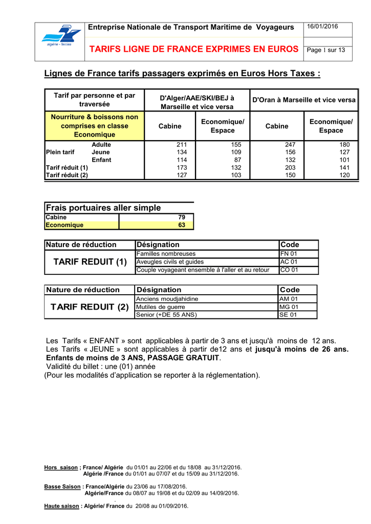 Entreprise Nationale de Transport Maritime de Voyageurs 16/01/2016 TARIFS LIGNE DE FRANCE EXPRIMES EN EUROS Page 1 sur 13 Lignes de France tarifs passagers exprimés en Euros Hors Taxes : Tarif par personne et par traversée D'Alger/AAE/SKI/BEJ à Marseille et vice versa Nourriture & boissons non comprises en classe Economique Plein tarif Cabine Adulte Jeune Enfant 211 134 114 173 127 Tarif réduit (1) Tarif réduit (2) Economique/ Espace D'Oran à Marseille et vice versa Cabine 155 109 87 132 103 247 156 132 203 150 Economique/ Espace 180 127 101 141 120 Frais portuaires aller simple Cabine Economique Nature de réduction TARIF REDUIT (1) Nature de réduction TARIF REDUIT (2) 79 63 Désignation Code Familles nombreuses Aveugles civils et guides Couple voyageant ensemble à l'aller et au retour FN 01 AC 01 CO 01 Désignation Code Anciens moudjahidine Mutiles de guerre Senior (+DE 55 ANS) AM 01 MG 01 SE 01 Les Tarifs « ENFANT » sont applicables à partir de 3 ans et jusqu'à moins de 12 ans. Les Tarifs « JEUNE » sont applicables à partir de12 ans et jusqu'à moins de 26 ans. Enfants de moins de 3 ANS, PASSAGE GRATUIT. Validité du billet : une (01) année (Pour les modalités d’application se reporter à la réglementation). Hors saison ; France/ Algérie du 01/01 au 22/06 et du 18/08 au 31/12/2016. Algérie /France du 01/01 au 07/07 et du 15/09 au 31/12/2016. Basse Saison : France/Algérie du 23/06 au 17/08/2016. Algérie/France du 08/07 au 19/08 et du 02/09 au 14/09/2016. . Haute saison : Algérie/ France du 20/08 au 01/09/2016. Entreprise Nationale de Transport Maritime de Voyageurs 16/01/2016 TARIFS LIGNE DE FRANCE EXPRIMES EN EUROS Page 2 sur 13 Lignes de France suppléments exprimés en euros par personne et par traversée : Code L 21 E L 31 E Classe cabine Définition des installations Hors saison Haute/Basse Catégorie "L" LUXE ( cabine & salon ) avec sanitaire privé A 1 lit dans cabine A 2 A 1 lit dans cabine A 3 180 270 200 300 Catégorie "L" LUXE ( cabine & salon )sans exclusivite avec sanitaire privé L2E L3E A 2 lits dans cabine A2 A 3 lits dans cabine A 3 90 90 100 100 Catégorie "A": cabine en exclusivité ( sanitaire privé avec hublot ) A 21 E A 32 E A 43 E A 42 E A 1 lit dans A 2 lit dans A 3 lit dans A 2 lit dans cabine A 2 cabine A 3 cabine A 4 cabine A 4 90 51 40 60 96 57 44 66 Catégorie "A": cabine sans exclusivité (vendue en homme ou en femme avec sanitaire privé & hublot) A2E A3E A4E A 2 lits bas ou superposés dans cabine A 2 A 3 lits dans cabine A 3 A 4 lits dans cabine A 4 45 34 30 48 38 33 Catégorie "B": cabine intérieure en exclusivité ( sanitaire privé ) B 21 I B 42 I B 43 I B 32 I A 1 lit dans A 2 lit dans A 3 lit dans A 2 lit dans cabine A 2 cabine A 4 cabine A 4 cabine A 3 70 48 32 42 82 54 36 48 Catégorie "B": cabine intérieure sans exclusivité ( vendue en homme ou en femme avec sanitaire privé ) B2I B3I B4I Code ES EF A 2 lits bas ou superposés dans cabine A 2 A 3 lits dans cabine A 3 A 4 lit dans cabine A 4 35 28 24 Classe économique Définition des installations Hors Saison couchette avec lavabo FAUTEUIL Hors saison ; France/ Algérie du 01/01 au 22/06 et du 18/08 au 31/12/2016. Algérie /France du 01/01 au 07/07 et du 15/09 au 31/12/2016. Basse Saison : France/Algérie du 23/06 au 17/08/2016. Algérie/France du 08/07 au 19/08 et du 02/09 au 14/09/2016. . Haute saison : Algérie/ France du 20/08 au 01/09/2016. 20 1 41 32 27 Haute /Basse 30 2 Entreprise Nationale de Transport Maritime de Voyageurs 16/01/2016 TARIFS LIGNE DE FRANCE EXPRIMES EN EUROS Page 3 sur 13 Lignes de France tarifs de transport des véhicules exprimés en euros hors taxes : Catégorie code Accompagnés Non accompagnés Aller simple Aller simlpe Véhicules de tourisme VT 398 485 Fourgons VU 788 1 045 Fourgons Réservation en GS obligatoire Frais portuaires Aller simple 52 FOURGONS : De dimensions maximales de 06 mètres de longueur (c’est la longueur maximale des véhicules de ce type en circulation) et 2,30m de haut. Si ces conditions ne sont pas remplies : réservation et taxation « fret ». Véhicule de tourisme de plus de 6 m de longueur (limousine ou autres). ATTENTION : Les véhicules de type professionnel tels que benne – plateau - bétonnière, fourgon équipés pour la vente sur les marchés ne peuvent bénéficier de ce tarif, ils sont soumis aux règles « fret ». TAXE DE HAUTEUR : L’embarquement à bord car-ferries des voitures de tourisme dont la hauteur excède 2,00 mètres par suite d’une surcharge de la galerie sur le toit sera refusé. Exceptionnellement et dans la limite des places disponibles, une dérogation pourra être accordée si la hauteur est comprise entre 2,00 m et 2,40 m. Dans ce cas-là, une taxe sera perçue d'un montant de 50 EUROS au niveau des agences et de 70 EUROS au niveau des ports d’embarquement. Toutefois les bagages en surcharge sur la galerie pourront être enregistre au service bagage. La compagnie a couvert sa responsabilité civile pour tous les dommages causes aux véhicules. VALIDITE DU BILLET 01 ANNEE. Hors saison ; France/ Algérie du 01/01 au 22/06 et du 18/08 au 31/12/2016. Algérie /France du 01/01 au 07/07 et du 15/09 au 31/12/2016. Basse Saison : France/Algérie du 23/06 au 17/08/2016. Algérie/France du 08/07 au 19/08 et du 02/09 au 14/09/2016. . Haute saison : Algérie/ France du 20/08 au 01/09/2016. Entreprise Nationale de Transport Maritime de Voyageurs 16/01/2016 TARIFS LIGNE DE FRANCE EXPRIMES EN EUROS Page 4 sur 13 Lignes de France tarifs exprimés en Euros Hors Taxes : a. Tarifs motos par traversée : Catégorie Moins DE 100 CM3 Plus de 100 CM3 ALLER SIMPLE Code Accompagnée M1 M2 non accompagnée 69 138 83 166 b. Tarifs autocars de touriste par traversée : Le mètre linéaire en aller simple Hors saison Basse et Haute saison 140 171 Frais portuaires Aller simple 54 c. Tarifs remorques, caravanes, bateaux sur remorques à bagage (longueur hors tout, timon compris) . Catégories Jusqu'à 4 