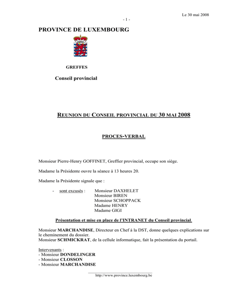 Le 30 mai 2008 -1- PROVINCE DE LUXEMBOURG GREFFES Conseil provincial REUNION DU CONSEIL PROVINCIAL DU 30 MAI 2008 PROCES-VERBAL Monsieur Pierre-Henry GOFFINET, Greffier provincial, occupe son siège. Madame la Présidente ouvre la séance à 13 heures 20. Madame la Présidente signale que : - sont excusés : Monsieur DAXHELET Monsieur BIREN Monsieur SCHOPPACK Madame HENRY Madame GIGI Présentation et mise en place de l’INTRANET du Conseil provincial. Monsieur MARCHANDISE, Directeur en Chef à la DST, donne quelques explications sur le cheminement du dossier. Monsieur SCHMICKRAT, de la cellule informatique, fait la présentation du portail. Intervenants : - Monsieur DONDELINGER - Monsieur CLOSSON - Monsieur MARCHANDISE _________________________________ http://www.province.luxembourg.be Le 30 mai 2008 -2- - Madame CLEMENTZ - Monsieur CLAUDOT - Monsieur MARCHANDISE - Monsieur CLAUDOT - …/… - Monsieur PIEDBOEUF Monsieur Bernard CAPRASSE, Gouverneur, occupe son siège. Monsieur le Gouverneur prend la parole pour le dépôt des dossiers. ORDRE DU JOUR SEANCE PUBLIQUE Présentation et mise en place de l’Intranet du Conseil provincial. ORDRE DU JOUR A : SEANCE DE QUESTIONS ET REPONSES 1. Question de Madame Christina DEWART concernant le développement du secteur éolien dans la province de Luxembourg. 2. Question de Monsieur Didier FELLER concernant le Domaine Provincial de Mirwart. 3. Question de Monsieur Bertrand LESPAGNARD relative à l’objectivité des subventions. 4. Question de Madame Brigitte PETRE relative au TELBUS. ORDRE DU JOUR B : QUESTION D’ACTUALITE 1. Question de Monsieur Michel JACQUET concernant la désignation de Monsieur Jean-Pierre DARDENE à un pose de vice-président du Centre d’Economie Rurale à Marloie. ORDRE DU JOUR C MODIFIE ET COMPLETE : SEANCE ORDINAIRE. 1. Vérification des pouvoirs et installation de Conseillers provinciaux suppléants appelés à remplacer comme titulaire des membres décédés ou démissionnaires. Sans objet. _________________________________ http://www.province.luxembourg.be Le 30 mai 2008 -3- REPRESENTATIONS 2. Désignation par le Conseil provincial de délégués et suppléants ou de représentants aux Assemblées générales, Conseils d’administration, Comité de secteur et autres assemblées où des sièges sont à pourvoir. 2A. Projet de résolution par laquelle, le Conseil provincial mandate impérativement les 5 délégués de la Province à savoir Mmes Marie-Hélène GUILLAUME et Thérèse MAY-THIRY ainsi que MM. Patrick ADAM, Jacques BALON et Roland DEOM pour rapporter sa décision au sujet des points inscrits à l’ordre du jour de la prochaine Assemblée générale de l’AIOMS de la Haute-Lesse du 26 juin 2008. 2B. RETIRE 2C. Projet de résolution par laquelle, le Conseil provincial mandate impérativement les 5 délégués de la Province à savoir Mmes Ingrid HENRY, Géraldine SANTER, et Murielle SCHOLTUS ainsi que MM. Michel JACQUET et Jean-Marie CARRIER pour rapporter sa décision au sujet des points inscrits à l’ordre du jour de la prochaine Assemblée générale de l’IFAC du 19 juin 2008. 2D. Projet de résolution par laquelle, le Conseil provincial mandate impérativement les 5 délégués de la Province à savoir Mmes Marcelle CHARLIER, Vinciane MIGEAUX-GIGI ainsi que MM. Benoît PIEDBOEUF, Bernard DAXHELET et Jean-Marie CARRIER pour rapporter sa décision au sujet des points inscrits à l’ordre du jour de la prochaine Assemblée générale de l’AIOMS des Arrondissements d’Arlon et Virton du 23 juin 2008. 2E. Projet de résolution par laquelle le Conseil provincial modifie la désignation d’un de ses membres comme administrateur de la Fondation d’utilité publique dénommée « Maison Européenne pour le Rayonnement de la Citoyenneté », en abrégé M.E.R.C.I. 2F. Projet de résolution par laquelle le Conseil provincial mandate impérativement les 5 délégués de la Province pour rapporter sa décision au sujet des points inscrits à l’ordre du jour de l’Assemblée générale ordinaire de l’Intercommunale IDELUX annoncée pour avoir lieu le mercredi 25 juin 2008. 2G. Projet de résolution par laquelle le Conseil provincial mandate impérativement les 5 délégués de la Province pour rapporter sa décision au sujet des points inscrits à l’ordre du jour de l’Assemblée générale ordinaire de l’Intercommunale IDELUX FINANCES annoncée pour avoir lieu le mercredi 25 juin 2008. _________________________________ http://www.province.luxembourg.be Le 30 mai 2008 -4- 2H. Projet de résolution par laquelle le Conseil provincial mandate impérativement les 5 délégués de la Province pour rapporter sa décision au sujet des points inscrits à l’ordre du jour de l’Assemblée générale ordinaire de l’Intercommunale AIVE annoncée pour avoir lieu le mercredi 25 juin 2008. 2I. Projet de résolution par laquelle le Conseil provincial désigne 5 délégués de la Province de Luxembourg et les mandate impérativement pour rapporter sa décision au sujet des points inscrits à l’ordre du jour de l’ Assemblée Générale Ordinaire de l’Intercommunale BEP-CREMATORIUM annoncée pour avoir lieu le mardi 24 juin 2008. En urgence 2J. Projet de résolution par laquelle le Conseil provincial mandate impérativement les 5 délégués de la Province pour rapporter sa décision au sujet des points inscrits à l’ordre du jour de l’Assemblée générale ordinaire de la S.L.F., annoncée pour avoir lieu le 24 juin 2008. En urgence 2k. Projet de résolution par laquelle le Conseil provincial mandate impérativement les 5 délégués de la Province pour rapporter sa décision au sujet des points inscrits à l’ordre du jour de l’Assemblée générale ordinaire de la S.L.F. FINANCES, annoncée pour avoir lieu le 24 juin 2008 à 17h35 à Herstal. En urgence 2l. Projet de résolution par laquelle le Conseil provincial modifie les statuts de l’ASBL SENIORERIE DE STE-ODE. INFRASTRUCTURES 3. Proj