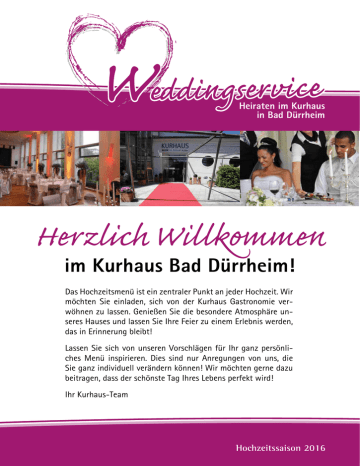 Heiraten im Kurhaus in Bad Dürrheim Herzlich Willkommen im Kurhaus Bad Dürrheim! Das Hochzeitsmenü ist ein zentraler Punkt an jeder Hochzeit. Wir möchten Sie einladen, sich von der Kurhaus Gastronomie verwöhnen zu lassen. Genießen Sie die besondere Atmosphäre unseres Hauses und lassen Sie Ihre Feier zu einem Erlebnis werden, das in Erinnerung bleibt! Lassen Sie sich von unseren Vorschlägen für Ihr ganz persönliches Menü inspirieren. Dies sind nur Anregungen von uns, die Sie ganz individuell verändern können! Wir möchten gerne dazu beitragen, dass der schönste Tag Ihres Lebens perfekt wird! Ihr Kurhaus-Team Hochzeitssaison 2016 Brötchen/Ciabatta Weizenbrötchen oder Partybrötchen reichhaltig belegt und geschmackvoll garniert • Käse, Tomate, Gurke, Lollo Bianco, Petersilie • gekochter Hinterschinken, Spargelspitzen, Lollo Bianco, Petersilie Knackig frische Baguettebrötchen herzhaft belegt und garniert • Roastbeef, Remouladensauce • Thunfisch und Paprika • Camembert und Tomate •Bismarckhering Halbe Schwarzbrotscheiben belegt und garniert • • • • geräucherte Forelle, Ei, Sahnemeerrettich, Gurke Kasslerbraten auf Gemüsesalat Putenbrust, Spargel, Ananas, Mandarinen, Mayonnaise gebeizter Lachs, Ei, Dillsenf Ciabatta delikat mit mediterranen Genüssen belegt • Strauchtomate, Mozzarella, Basilikum • Parmaschinken, Melone • Salami, mariniertes Gemüse •Gorgonzola • gekräuterter Schafskäse, Oliven, Tomate Cocktailhäppchen/Canapés Kurhaus-Canapés auf Sandwichbrot • Räucheraal garniert mit Gurke, Sahnemeerrettich und Olive • Hausgebeizter Lachs mit Honigsenf, Dillzweig • Frische Shrimps auf Ei garniert • Schinkenröllchen mit Meerrettich, Ei und Gurke • Roastbeefröllchen mit Eiersalat • Kassler mit Ananas und Trauben • Gorgonzolacrème mit Birne und Trauben • Französischer Camembert mit Früchten • Ziegen-, Kuh- oder Schafskäse, garniert Kurhaus-Klassiker Cocktailhäppchen, Canapés und kleine Leckereien mundgerecht mit Toastbrot oder mit herzhaften Brotmedaillons • Garniertes Ei mit Shrimps • Graved Lachs, Lachsschinken, geräuchertes Forellenfilet • geräucherte Putenbrust, Fleischbällchen • Schinkenröllchen, Camembert •Poulardenbrust Cocktailgedeck für Empfänge ab 6 Personen Canapés auf Sandwichbrot-Medaillons zubereitet und fein garniert • Lachstatar, Dillsenf • Geräucherter Aal •Jungschweinrücken • Roastbeef, zartrosa • Frischkäse mit Tomate • Mousse au Chocolat, Sahne, pro Person 1 Glas 3-Gang Menüs Kurhaus-Menü 3-01 Baguette und Butter *** Rinderkraftbrühe mit Eierstich, Markklößchen und Gemüsestreifen *** Rinderschmorbraten in Burgunder, Schweinefilettranchen in Calvadosrahm Gemüse der Saison, Butterspätzle und Herzoginkartoffeln *** Frischer Obstsalat mit Vanilleeis und Sahne Kurhaus-Menü 3-02 Baguette und Butter *** Rinderkraftbrühe mit Flädle und Gemüsewürfeln *** Schweinefilettranchen und gefüllte Poulardenbrust an Cognacrahmsauce, Kartoffelrösti, Herzoginkartoffeln und Gemüsebouquet *** Crème Caramel an Ananas-Traubensalat Kurhaus-Menü 3-03 Baguette und Butter *** Lauchcrèmesuppe mit Räucherlachsstreifen *** Rehragout mit Weintrauben, gerösteten Speckstreifen, Croûtons und Waldpilzen Mandelbällchen, Rosenkohl und Butterspätzle *** Zimtparfait mit Rosmarinkirschen und Vanillecrumble Kurhaus-Menü 3-04 Ciabatta mit Olivenmus *** Carpaccio vom Rinderfilet mit Parmesanspänen *** Saltimbocca von der Hähnchenbrust, mediterrane “Involtini“ Tomatenfettuccine und Bruschetta *** Dessertteller Panna Cotta mit Erdbeersauce, Tiramisu mit Kiwi-Orangensalat Kurhaus-Menü 3-05 Baguette und Butter *** Gebackenes Zanderfilet an Blattsalaten der Saison *** Schweinefilet im Wirsingblatt auf rosa Pfeffersauce, Perlhuhnbrust auf Apfel-Orangen-Sauce, Spätzle, Macairekartoffeln und Gemüse der Saison *** Panna Cotta auf Fruchtsauce Kurhaus-Menü 3-06 Baguette und Butter *** Salatbouquet mit gebratenen Entenbruststreifen und Traubensauce *** Kalbsrückensteak mit gebratenen Champignons, Kartoffelrösti, Wirsingstreifen Rehmedaillons aus der Keule auf Wacholderrahm, Waldpilze Preiselbeeren und Spätzle *** Vanilleeis mit heißen Kirschen 4-Gang Menüs Kurhaus-Menü 4-01 Baguette und Butter *** Herbstliche Blattsalate umlegt mit gebratenen Entenbruststreifen an glacierten Trauben *** Lauchcrèmesüppchen mit Paprikacroûtons *** Schweinefilettranchen und gefüllte Poulardenbrust an Steinpilzrahm mit Kartoffel-Karottenflan *** Dessertteller Bayerische Crème mit Fruchtsauce, Mousse au Chocolat, Hausgemachtes Parfait Kurhaus-Menü 4-02 Baguette und Butter *** Kürbis-Brioche an Feigenconfit und Blattsalat *** Geflügelcrèmesuppe mit Paprikacroûtons *** Rehbraten „Baden-Baden“ an Wacholderrahm gefüllte Preiselbeerbirne Mandelbrokkoli, Kartoffelbällchen und Butterspätzle Schweinefilettranchen auf Balsamicosauce *** Törtchen von zweierlei Mousse an Fruchtsauce Kurhaus-Menü 4-03 Baguette und Butter *** Komposition von Blattsalaten mit geräuchterem Fjordlachs an Apfel-Dillsauce *** Rahmsüppchen von der gelben Paprika mit Kürbiskernöl *** Geschmorte Gänsebrust auf Orangensauce Kalbssteaks auf Steinpilzrahm mit Kräuterknöpfle, Herzoginkartoffeln und Romanescoröschen *** Pochierte Rotweinbirne auf Walnußplätzchen und Amarettoschaum Kurhaus-Menü 4-04 Baguette und gesalzene Butter *** Vorspeisenteller Frische Blattsalate der Saison, Sauce Vinaigrette Parmaschinken mit Honigmelone, Roastbeefröllchen mit Eiersalat Graved Lachs mit Dill-Senf-Sauce, Krabbensalat im Chicoréeblatt *** Rinderkraftbrühe mit Maultäschle *** Schweine- und Rinderfilet mit frischen Champignons Sauce Bernaise, rosa Pfefferrahm feines Gemüse und Rosmarinkartoffeln *** Dessertteller Bayerische Crème mit Fruchtsauce, Mousse au chocolat und hausgemachtes Parfait 5-Gang Menüs Kurhaus-Menü 5-01 Baguette und Butter *** Salatkomposition mit gebratenem Zanderfilet an leichter Senfsauce *** Kressesc