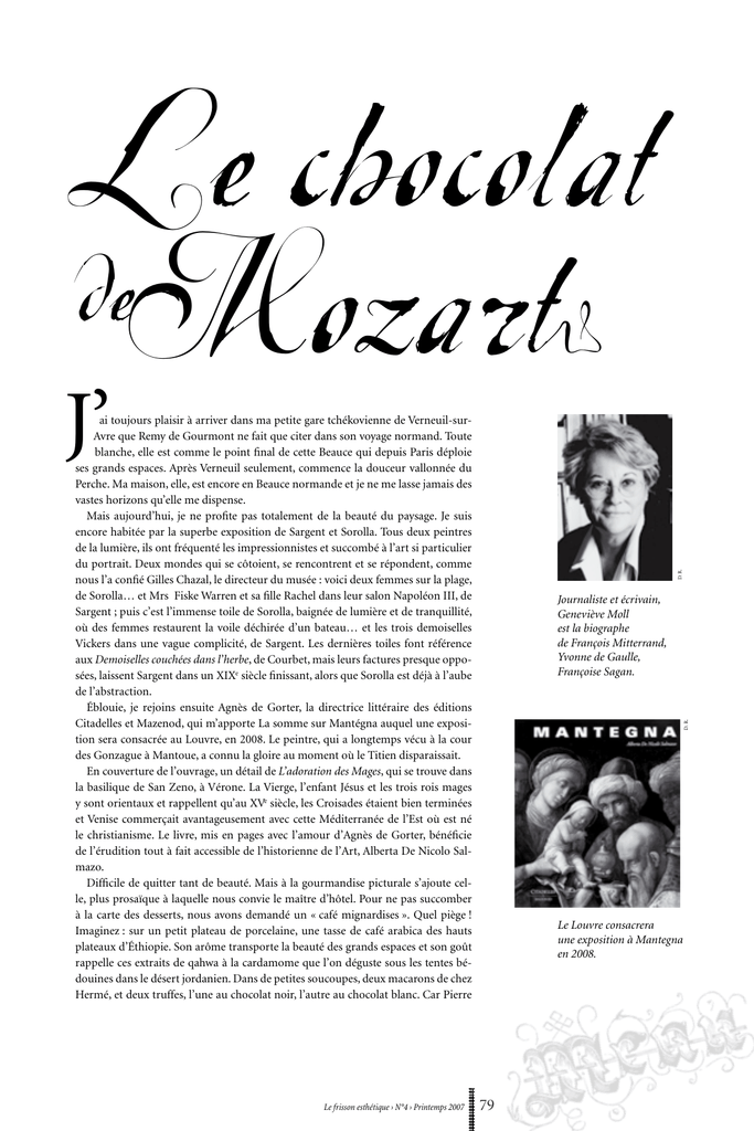 Le chocolat de Mozart J’ Le frisson esthétique › N°4 › Printemps 2007 D. R. ai toujours plaisir à arriver dans ma petite gare tchékovienne de Verneuil-surAvre que Remy de Gourmont ne fait que citer dans son voyage normand. Toute blanche, elle est comme le point final de cette Beauce qui depuis Paris déploie ses grands espaces. Après Verneuil seulement, commence la douceur vallonnée du Perche. Ma maison, elle, est encore en Beauce normande et je ne me lasse jamais des vastes horizons qu’elle me dispense. Mais aujourd’hui, je ne profite pas totalement de la beauté du paysage. Je suis encore habitée par la superbe exposition de Sargent et Sorolla. Tous deux peintres de la lumière, ils ont fréquenté les impressionnistes et succombé à l’art si particulier du portrait. Deux mondes qui se côtoient, se rencontrent et se répondent, comme nous l’a confié Gilles Chazal, le directeur du musée : voici deux femmes sur la plage, de Sorolla… et Mrs Fiske Warren et sa fille Rachel dans leur salon Napoléon III, de Sargent ; puis c’est l’immense toile de Sorolla, baignée de lumière et de tranquillité, où des femmes restaurent la voile déchirée d’un bateau… et les trois demoiselles Vickers dans une vague complicité, de Sargent. Les dernières toiles font référence aux Demoiselles couchées dans l’herbe, de Courbet, mais leurs factures presque opposées, laissent Sargent dans un XIXe siècle finissant, alors que Sorolla est déjà à l’aube de l’abstraction. Éblouie, je rejoins ensuite Agnès de Gorter, la directrice littéraire des éditions Citadelles et Mazenod, qui m’apporte La somme sur Mantégna auquel une exposition sera consacrée au Louvre, en 2008. Le peintre, qui a longtemps vécu à la cour des Gonzague à Mantoue, a connu la gloire au moment où le Titien disparaissait. En couverture de l’ouvrage, un détail de L’adoration des Mages, qui se trouve dans la basilique de San Zeno, à Vérone. La Vierge, l’enfant Jésus et les trois rois mages y sont orientaux et rappellent qu’au XVe siècle, les Croisades étaient bien terminées et Venise commerçait avantageusement avec cette Méditerranée de l’Est où est né le christianisme. Le livre, mis en pages avec l’amour d’Agnès de Gorter, bénéficie de l’érudition tout à fait accessible de l’historienne de l’Art, Alberta De Nicolo Salmazo. Difficile de quitter tant de beauté. Mais à la gourmandise picturale s’ajoute celle, plus prosaïque à laquelle nous convie le maître d’hôtel. Pour ne pas succomber à la carte des desserts, nous avons demandé un « café mignardises ». Quel piège ! Imaginez : sur un petit plateau de porcelaine, une tasse de café arabica des hauts plateaux d’Éthiopie. Son arôme transporte la beauté des grands espaces et son goût rappelle ces extraits de qahwa à la cardamome que l’on déguste sous les tentes bédouines dans le désert jordanien. Dans de petites soucoupes, deux macarons de chez Hermé, et deux truffes, l’une au chocolat noir, l’autre au chocolat blanc. Car Pierre D. R. Journaliste et écrivain, Geneviève Moll est la biographe de François Mitterrand, Yvonne de Gaulle, Françoise Sagan. Le Louvre consacrera une exposition à Mantegna en 2008. 79 Gour m a n d i s e s Joaquin Sorolla La robe rose, 1916 - La bata rosa Huile sur toile, 208 x 126,5 cm Museo Sorolla, Madrid. John Singer Sargent Arthur George Maule Ramsay, Lord Dalhousie, 1900 Huile sur toile, 146 x 99 cm The earl of Dalhousie. Hermé, qui connaît des gourmands de toute sorte, ne fait pas d’ostracisme avec les chocolats. L’un des macarons est à la pistache, et c’est le souk aux épices de Damas qui fond tout entier dans votre bouche ! Le second, à la framboise, s’exhale en une corbeille de fruits rouges. Une petite gorgée de café et la truffe noire au citron vert et au miel. Autre gorgée de café… Conversations ? Non. Dégustation : voici la deuxième truffe au chocolat au lait et fruits de la passion… Après cela, nous allons marcher un peu pour regarder la Seine courir vers la mer, et suivre le vol d’une mouette qui en chahute une autre… C’est ensuite la présentation à la presse par les éditions Pizzi, de leur dernier livre : Hôtels Galants au Marignan Champs-Élysées. Ici, c’est Venise. Des lustres et des appliques murales d’un Murano d’une très grande classe, un camaïeu nègre et blanc cassé… Le Marignan Champs-Élysées est répertorié parmi les quarante-cinq Hôtels Galants… pour rendez-vous coquins, week-end amoureux ou nuits magiques. Des textes courts, rédigés par Jonathan Siksou, et des images sobres, colorées, vivantes, vous donnent l’envie de vous poser immédiatement et de rêver. Paris y est à l’honneur, mais aussi toute la France et quelques destinations magiques. Le champagne Veuve Cliquot coule à flots. Acteurs, écrivains, people, se régalent des zakouskis mondialistes, comme les aime le chef du restaurant de l’hôtel, Le Spoun : carpaccio de coquilles Saint-Jacques au citron vert, accras frits, accompagnés d’une sauce à la diable, brochettes de langoustines, mangues, ananas… Le drame est que l’on ne peut s’empêcher de goûter lorsque les plateaux vous sont D. R. Exposition Peintres de la Lumière Sargent et Sorolla Du 15 février au 13 Mai 2007 Petit Palais Musée des Beaux-Arts 75008 Paris 80 Le frisson esthétique › N°4 › Printemps 2007 Le frisson esthétique › N°4 › Printemps 2007 D. R. D. R. proposés… La gourmandise est un vilain défaut ? Certes… mais qu’est-ce que c’est bon… Après toutes ces agapes, j’ai attrapé mon train au vol ! J’avais emporté le dernier roman d’André Bucher : Déneiger le ciel. Il me restait encore quelques dizaines de pages pour me battre avec son héros, David, contre les éléments. Jusqu’à la fin, j’ai eu froid, j’ai eu faim, j’ai eu soif avec lui. Parce que ce têtu de paysan de l’autre côté 