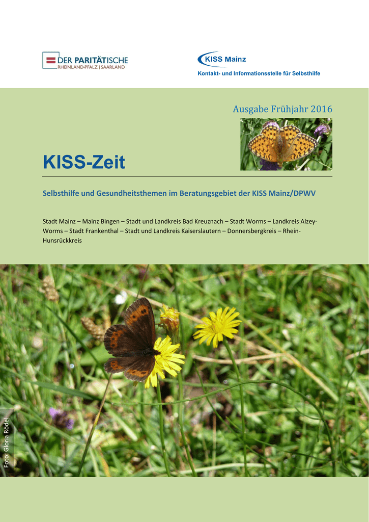 Kontakt- und Informationsstelle für Selbsthilfe Ausgabe Frühjahr 2016 KISS-Zeit Selbsthilfe und Gesundheitsthemen im Beratungsgebiet der KISS Mainz/DPWV Foto: Gloria Rödel Stadt Mainz – Mainz Bingen – Stadt und Landkreis Bad Kreuznach – Stadt Worms – Landkreis AlzeyWorms – Stadt Frankenthal – Stadt und Landkreis Kaiserslautern – Donnersbergkreis – RheinHunsrückkreis KISS-Zeit Ausgabe Frühjahr 2016 In dieser Ausgabe Veranstaltungen und Seminare Seminarangebote 2016 der KISS Mainz ...................................................................................................5 Großveranstaltungen 2016 ......................................................................................................................5 Mein Kind lebt in einer anderen Familie oder in einer Einrichtung .........................................................6 Vortrag: Unterstützte Kommunikation und Autismus-Spektrum-Störungen ..........................................7 Große Party zum NO LIMITS Festival........................................................................................................8 Bundestreffen Junge Selbsthilfe 2016 ......................................................................................................9 SILVER SURFER: Leben in der digitalen Welt ..........................................................................................10 Im Grünen: Romantischer Liederabend .................................................................................................11 Aufsuchende Hilfen stärken. – Zwangseinweisungen vermeiden. ........................................................12 Südwestdeutscher Parkinson-Tag 2016 .................................................................................................15 Mir sagt ja doch (k)einer was!? ..............................................................................................................16 "Der Tanz auf dem Vulkan" ....................................................................................................................17 Autismus Sprektrum Störung (ASS) ........................................................................................................18 Hilfepan - und dann? Lösungsorientierte Methoden zur Zielerreichung ...............................................19 Veranstaltungen im Frauenzentrum Mainz ...........................................................................................20 Sommerferienaktion für Flüchtlingsfamilien .........................................................................................23 Aktuelles aus der Selbsthilfe Die Selbsthilfegruppe Adipositas Mainz .................................................................................................25 Neues aus den Selbsthilfegruppen .........................................................................................................26 Ausgabe Frühjahr 2016 2 KISS-Zeit Ausgabe Frühjahr 2016 Nachrichten Wanderausstellung „Herz verschenken“ ...............................................................................................30 Pfalzklinikum gewinnt „One Big Society Award“....................................................................................31 Fortbildungsangebote Paritätische Akademie Süd ................................................................................31 Aufruf zur Teilnahme an einer Studie Depression .................................................................................32 Deutscher Bürgerpreis startet in neue Runde.......................................................................................32 Der Paritätische: Armutsbericht 2016 ....................................................................................................33 Aufruf zur Teilnahme an der Initiative „Kommune Inklusiv“ .................................................................34 Die Mainzer Gesundheitstage 2016 .......................................................................................................35 Angebote für Gesundheit und Selbsthilfe Luis und das Abenteuer im Regenbogenland.........................................................................................36 DVD „Stottern im Leben – Leben mit Stottern“ .....................................................................................36 DVDs „Mitten im Leben“ und „Leichter sprechen und sich wohler fühlen“ ..........................................36 Seelenkleider: Das sprechende Herz ......................................................................................................37 Gedankenfische im Ozean der Gefühle ..................................................................................................37 Dem Abgrund nah: Mein Weg zurück ins Leben ....................................................................................37 Suche/Biete: Die KISS- Pinnwand ...........................................................................................................38 Impressum ..............................................................................................................................................39 Ausgabe Frühjahr 2016 3 KISS-Zeit Ausgabe Frühjahr 2016 Grußwort Liebe Leserinnen und Leser der KISS-Zeit, die dunkle Jahreszeit liegt hinter uns, mit dem Frühling halten wieder mehr Licht und Sonne Einzug in unseren Alltag. Das regt unseren Geist und unser Gemüt an. Zudem vermittelt der Frühling mit dem neu erwachten Grün der Natur für viele Menschen eine Art Aufbruchsstimmung. Es gibt wie immer viele gute Projekte und Ideen in der Selbsthilfe. Wir steuern in großen Schritten auf den Rheinland-Pfalz-Tag in Alzey zu, machen einen Zwischenstopp bei „Wir sind Selbsthilfe“ in der Coface-Arena und befinden uns längst in den Startlöchern zum Seniorensommerfest am 28. August. Auch innerhalb der KISS Mainz gibt es Neuigkeiten: Seit einigen Wochen unter