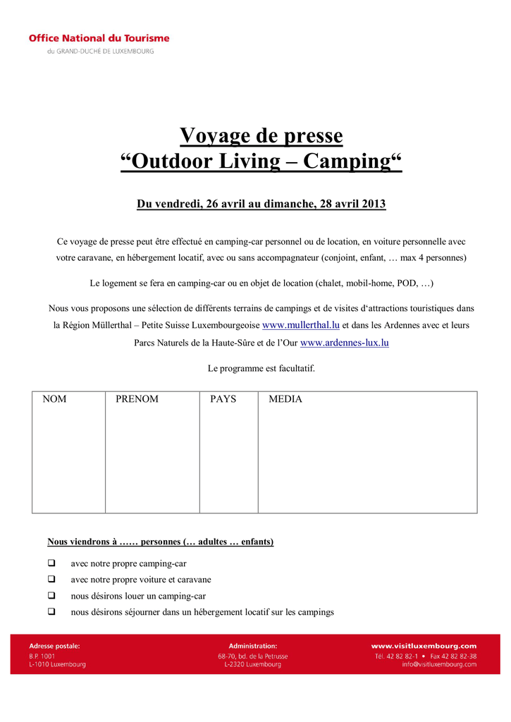 Voyage de presse “Outdoor Living – Camping“ Du vendredi, 26 avril au dimanche, 28 avril 2013 Ce voyage de presse peut être effectué en camping-car personnel ou de location, en voiture personnelle avec votre caravane, en hébergement locatif, avec ou sans accompagnateur (conjoint, enfant, … max 4 personnes) Le logement se fera en camping-car ou en objet de location (chalet, mobil-home, POD, …) Nous vous proposons une sélection de différents terrains de campings et de visites d‘attractions touristiques dans la Région Müllerthal – Petite Suisse Luxembourgeoise www.mullerthal.lu et dans les Ardennes avec et leurs Parcs Naturels de la Haute-Sûre et de l’Our www.ardennes-lux.lu Le programme est facultatif. NOM PRENOM PAYS MEDIA Nous viendrons à …… personnes (… adultes … enfants) avec notre propre camping-car avec notre propre voiture et caravane nous désirons louer un camping-car nous désirons séjourner dans un hébergement locatif sur les campings Vendredi, 26 avril 2013 Arrivée à Luxembourg en matinée au Camping “Auf Kengert“. La route à suivre est affichée sur www.kengert.lu Kengert 1, L-7633 Larochette. Tél. +352 83 71 86. Accueil par Mme Linda Gedink, secrétaire de l’Association des Propriétaires de Campings et Hébergements Privés au Grand Duché Camprilux www.camping.lu Accueil par Mme Lis Lorang du Service Presse & Relations Publiques de l’Office National du Tourisme ONT www.visitluxembourg.com Présentation du programme du voyage de presse et remise des documents d‘information. 12.00 heures Déjeuner commun au restaurant du camping “Auf Kengert“. 13.00 heures Faites un petit tour sur le terrain de camping “Auf Kengert“ et découvrez le sentier "pieds nus" de 745 mètres. Labels: ServiceQualität-Letzebuerg, Bed & Bike, accessibilité pour personnes handicapés, hébergement accessible aux randonneurs du Mullerthal Trail 14.00 heures Départ de votre randonnée individuelle à travers le Luxembourg. Camping Birkelt 1, um Birkelt, L-7633 Larochette. Tél. +352 87 90 40 www.camping-birkelt.lu Labels: ServiceQualität-Letzebuerg, Bed & Bike, accessibilité pour personnes handicapés, hébergement accessible aux randonneurs du Mullerthal Trail Château de Larochette Ruines de deux vieux châteaux du XIVe siècle partiellement restaurés: Maison de Hombourg et Maison de Créhange (reconstruite); fouilles archéologiques dans la basse-cour et le donjon principal. Château Larochette, L-7612 Larochette. Tél. +352 83 74 97 www.larochette.eu Prenez la route de Larochette vers Mullerthal (via Christnach et Waldbillig, environ 8 km) Moulin "Heringer Millen" – Mullerthal Ce moulin superbement restauré du 17e siècle abrite un musée des moulins, une grande roue de moulin toujours en fonction, le "centre test Best of Wandern" pour vêtements de randonnée et un ancien four en pierre de bois où le pain est fabriqué maison. Tourist Center Heringer Millen, 1 rue des Moulins, L-6245 Mullerthal. Tél. + 352 87 89 88. www.mullerthal-millen.lu Prenez la route de Mullerthal vers Beaufort (environ 9 km) Château de Beaufort Laisser vous impressionner par l’imposante ruine du château médiéval du 12e siècle. Le "Cassero", une liqueur de cassis produite au château, est un délice "régional" incontournable ... Dégustation et vente de Cassero et d’autres alcools à l’entrée du château. Château Beaufort, rue du Château, L-6313 Beaufort. Tél. +352 83 60 02 www.beaufort.lu “Camping Plage“ Propose un village Tipi, huttes de randonnée, une piscine en plein air, une patinoire et une station de location de vélos et VTT "Rentabike Mëllerdall" www.rentabike-mellerdall.lu 87 Grand-Rue, L-6310 Beaufort. Tél.+ 352 63 99 300 www.campingplage.lu Labels: Bed & Bike, hébergement accessible aux randonneurs du Mullerthal Trail Prenez la route de Beaufort vers Berdorf (environ 8 km) “Camping Martbusch“ Propose la location de “POD“ (différents chalets en bois chauffés) et une station de location de vélos et VTT "Rentabike Mëllerdall" www.rentabike-mellerdall.lu 3 beim Maartbësch, L-6552 Berdorf. Tél. +352 79 05 45 www.camping-martbusch.lu Labels: ServiceQualität-Letzebuerg, Bed & Bike Prenez la route de Berdorf vers Echternach (environ 7 km) Camping Officiel Echternach Nouveau: location de 4 “Kotta’s“ (chalets chauffés). 17 route de Diekirch, L-6430 Echternach. Tél. + 352 72 02 72 www.echternach-tourist.lu/camping Labels: Bed & Bike, accessibilité pour personnes handicapés Cité abbatiale Echternach La petite ville héberge de nombreux témoins architecturaux de son passé: imposant palais romain, église Saints Pierre et Paul (éléments mérovingiens, romans et gothiques), basilique St. Willibrord (11ème siècle style roman, reconstruite après la 2ème guerre mondiale), des restes de l’enceinte médiévale avec 8 tours, hôtel de ville gothique sur l’imposante place du marché, abbaye bénédictine baroque, pavillon rococo au parc municipal, 5 musées, une zone piétonne, une nouvelle auberge de jeunesse avec mur d’escalade situé dans le centre récréatif avec lac. Egalement au lac, parc d’aventure “Adventure Island“ de 10m de hauteur et parc à trampolines et nouveau “Bike Parc“ de 5.000 m2. www.echternach-tourist.lu www.mullerthal.lu Prenez la route d’Echternach vers Diekirch (via Wallendorf, Reisdorf et Bleesbruck, environ 28 km) Les campings se trouvent le long de la rivière Sûre à côté d’une piste cyclable. Camping du Rivage & Ronn’s Bikes and Kajaks 7 route de Echternach, L-9392 Wallendorf-Pont. Tél. +352 836516 www.wallendorf-kajaks.de Location de vélos et de kanoe-cajaks. Labels: Bed & Bike Camping de la Rivière 21 route de la Sûre, L-9390 Reisdorf. Tél. + 352 83 63 98 www.campingreisdorf.com Camping Bleesbruck 1 Bleesbreck, L-9359 Bleesbruck. Tél. +352 80 31 34 www.camping-bleesbruck.lu Le camping dispose également d’un camping séparé pour naturistes, huttes de 