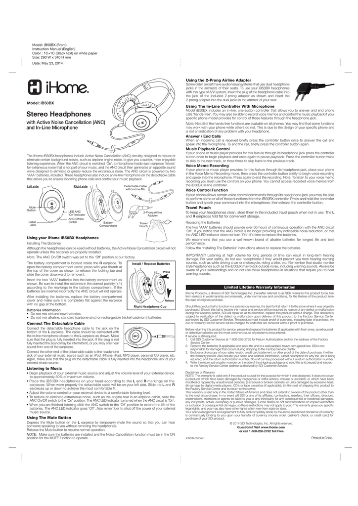 Model: iB50BX (Front) Instruction Manual (English) Color : 1C+1C (Black text) on white paper Size: 290 W x 340 H mm Date: May 23, 2014 Using the 2-Prong Airline Adapter R Some older aircraft have audio/visual systems that use dual headphone jacks in the armrests of their seats. To use your iB50BX headphones with this type of A/V system, insert the plug of the headphone cable into the jack of the included 2-prong adapter as shown and insert the 2-prong adapter into the dual jacks in the armrest of your seat. Model: iB50BX Using The In-Line Controller With Microphone Model iB50BX includes an in-line, one-button controller that allows you to answer and end phone calls ‘hands-free’. You may also be able to record voice memos and control the music playback if your specific phone model provides for control of those features through the headphone jack. Stereo Headphones with Active Noise Cancellation (ANC) and In-Line Microphone Note: Not all of the hands free functions are available on all phones. You may find that some functions may work with your phone while others do not. This is due to the design of your specific phone and is not an indication of any problem with your headphone. Answer / End Calls When an incoming call is received briefly press the controller button once to answer the call and speak into the microphone. To end the call, briefly press the controller button again. Music Playback Control The iHome iB50BX headphones include Active Noise Cancellation (ANC) circuitry designed to reduce or eliminate certain background noises, such as airplane engine noise, to give you a quieter, more enjoyable listening experience. When the ANC circuit is switched ‘On’, a microphone inside each earpiece ‘listens’ for extraneous noise that is not part of your music, and the ANC circuit then generates an opposite sound wave designed to eliminate or greatly reduce the extraneous noise. The ANC circuit is powered by two “AAA” batteries, included. These headphones also include an in-line microphone on the detachable cable that allows you to answer incoming phone calls and control your music playback. Left side Detachable Cable with In-Line Mic Right side If your phone or music player provides for this feature through its headphone jack press the controller button once to begin playback and once again to pause playback. Press the controller button twice to skip to the next track, or three times to skip back to the previous track. Voice Memo Recording If your phone or music player provides for this feature through its headphone jack, place your phone in the Voice Memo Recording mode, then press the controller button briefly to begin voice recording and speak into the microphone. Press again to end the recording. Note: To listen to your voice memo recording you must use the controls on your phone. You cannot access recorded voice memos from the iB50BX in-line controller. Voice Control Function If your phone allows certain voice control commands through its headphone jack you may be able to perform some or all of those functions from the iB50BX controller. Press and hold the controller button and speak your command into the microphone, then release the controller button. Mute Button Cable Jack Travel Pouch LED ANC ‘On’ Indicator ANC Off/On Switch 2-Prong Airline Adapter Battery Compartment To keep your headphones clean, store them in the included travel pouch when not in use. The L and R earpieces fold flat for convenient storage. Travel Pouch Using your iHome iB50BX Headphones Installing The Batteries Although the headphones can be used without batteries, the Active Noise Cancellation circuit will not operate unless the batteries are properly installed. Note: The ANC On/Off switch was set to the ‘Off’ position at our factory. The battery compartment is located inside the R earpiece. To open the battery compartment cover, press with your thumb at the top of the cover as shown to release the locking tab and slide the cover downward to remove it. Install / Replace Batteries Press Insert the two “AAA” batteries into the battery compartment as shown. Be sure to install the batteries in the correct polarity (+/-) according to the markings in the battery compartment. If the batteries are inserted incorrectly the ANC circuit will not operate. After installing the batteries, replace the battery compartment cover and make sure it is completely flat against the earpiece with no gap at the bottom. Replacing the Batteries The two “AAA” batteries should provide over 60 hours of continuous operation with the ANC circuit ‘On’. If you notice that the ANC circuit is no longer providing any noticeable noise reduction, or that the ANC LED indicator does not turn ‘On’, it’s time to replace the batteries. We recommend that you use a well-known brand of alkaline batteries for longest life and best performance. Follow the ‘Installing The Batteries’ instructions above to replace the batteries. IMPORTANT! Listening at high volume for long periods of time can result in long-term hearing damage. For your safety, do not use headphones if they would prevent you from hearing warning sounds, such as while driving a car or motorcycle, riding a bike, etc. Remember that studio monitor style headphones such as the iB50BX may block outside noise, including warning sounds. Always be aware of your surroundings and do not use these headphones in situations that require you to hear warning sounds. Limited Lifetime Warranty Information Release Right Headphone Cup Batteries information • Do not mix old and new batteries. • Do not mix alkaline, standard (carbone-zinc) or rechargeable (nickel-cadmium) batteries. Connect The Detachable Cable Connect the detachable headphone cable to the jack on the bottom of the L earpiece. The cable should be connected with the in-line microphone closest to the L earpiece as shown. Make sure that the plug is fully inserted into the jack. If the plug is not fully ins