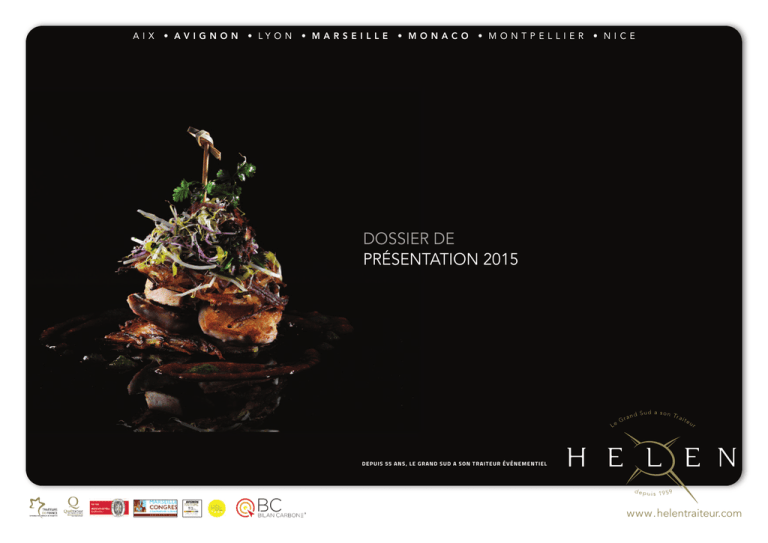 AIX • AVIGNON • LY O N • MARSEILLE • MONACO • MONTPELLIER • NICE DOSSIER DE PRÉSENTATION 2015 DEPUIS 55 ANS, LE GRAND SUD A SON TRAITEUR ÉVÉNEMENTIEL www.helentraiteur.com 1 c HISTOIRE // HISTORY 2 c DÉVELOPPEMENT // DEVELOPMENT 3 c CRÉATIVITÉ SOMMAIRE // SUMMARY // CREATIVITY 4 c CHIFFRES // FIGURES 5 c TRAITEUR DE FRANCE - UN RÉSEAU D’EXCELLENCE // CATERER OF FRANCE - NETWORK OF EXCELLENCE 6 c TRAITEUR DE FRANCE - CHARTE DE QUALITÉ // CATERER OF FRANCE - QUALITY CHARTER 7 c QUALITRAITEUR // QUALITRAITEUR 8 c CERTIFICATION ISO 9001 // ISO 9001 CERTIFICATION 9 c CHARTE RSE HELEN - GOUVERNANCE // HELEN CSR CONCORDAT - MANAGEMENT 10 c CHARTE RSE HELEN - SOCIAL // HELEN CSR CONCORDAT - SOCIAL DEPUIS 1959 // SINCE 1959 Helen Traiteur, ancré dans le passé et fermement tourné vers l’avenir ! Helen Catering, anchored in the past and looking to the future! 1c PREMIER REPAS TRAITEUR SERVI AU PALAIS DES PAPES EN OCTOBRE 1959 POUR LE CONGRÈS NATIONAL DES ASSUREURS (800 PERSONNES) FIRST CATERED MEALS SERVED AT THE POPES PALACE OF AVIGNON IN OCTOBER 1959 FOR THE NATIONAL CONGRESS OF INSURERS (800) HISTOIRE HISTORY Helen Traiteur a été créé il y a cinquante-cinq Helen Traiteur was created more than fifty years ago by Helen and Maryse Louis, managers of the restaurantion at the Hostellerie du Chasselas in Thor and afterwards owners of the restaurant called “Helen”, in Avignon, which included already about 720 m2 with three restaurants: a BBQ area, the Brasserie and a Gastronomic restaurant. ans par Helen et Maryse Louis, restaurateurs à l’Hostellerie du Chasselas au Thor, puis au restaurant Helen à Avignon, qui regroupait déjà dans ses 720 m2 de superficie, trois restaurants : un grill, une brasserie et un restaurant gastronomique. Leur créativité, leur amour du travail bien fait et leur passion les ont très vite amenés sur le chemin du succès. Féru d'histoire, Helen Louis imagine les banquets qui lui conféreront sa notoriété. Au cœur de monuments prestigieux, comme le Palais des Papes d'Avignon, l'Ile Saint Marguerite au large de Cannes, ou La Rochelle, il propose des soirées inoubliables qui allient délices du palais, service Their creativity, love of well done work and passion has led very quickly on the path to success. Crazy of History, Helen Louis imagines banquets that will give him his reputation. At the heart of prestigious monuments such as the Popes Palace in Avignon, Ile Saint Marguerite close by Cannes and La Rochelle, he offers an unforgettable evening that combines palate delights, excellent service and original atmosphere, under a reconstitution of historical moments which he creates himself. LE GRAND SUD A SON TRAITEUR // THE DEEP SOUTH HAS ITS CATERING Helen Traiteur met en œuvre tout son savoir-faire pour répondre à vos projets personnels ou professionnels Helen Catering implements all its know-how to meet your personal or professional projects 2c DE SA BASE LOGISTIQUE A AVIGNON, HELEN DÉVELOPPE SON ACTIVITÉ SUR TOUT LE GRAND SUD DE LA FRANCE. LEAVING FROM ITS LOGISTICS BASES IN AVIGNON, HELEN DEVELOPS ITS ACTIVITY THROUGHOUT THE DEEP SOUTH OF FRANCE. DÉVELOPPEMENT DEVELOPMENT En 1983, Eric-Helen Louis, après des études à l'Ecole hôtelière de Strasbourg, rejoint ses parents. Manager passionné, créatif et entreprenant, il saura exploiter le produit exceptionnel qu'ont bâti ses parents en apportant à l'entreprise ses qualités propres et en dynamisant toujours davantage l'ensemble de la structure. Il est l’actuel PDG. Sous sa direction dynamique, Helen Traiteur est devenu le premier Traiteur de la région PACA et de province et le 8ème Traiteur en France. In 1983, Eric-Helen Louis, joins his parents, after having studied at the Hotel School of Strasbourg. Passionate Manager, creative and enterprising, he will capitalize the exceptional product which his parents built, bringing his own qualities to the company and stimulating continuously the organization. He is the current CEO. Under his dynamic leadership, HELEN became the first Caterer in the region “PACA” and the eighth in the Province of France. Grâce à une équipe de professionnels participant au développement de l'entreprise depuis plus de vingt ans, comme Pascal Schmitt - Directeur d'exploitation ou Bruno Viargues - Directeur commercial, Helen Traiteur se positionne aujourd’hui comme un véritable acteur de l’économie régionale, et, un partenaire exceptionnel et incontournable dans l'organisation des réceptions de prestige du Grand Sud. With a team of professionals involved in business development for over twenty years, as Pascal Schmitt - Chief Operating Officer or Bruno Viargues - Sales Manager, HELEN Catering has positioned itself as a real performer in the regional economy , and an exceptional partner and performer in the organization of prestigious receptions of the Deep South. LA CRÉATIVITÉ // CREATIVITY Helen Traiteur, la passion pour la gastronomie, la créativité et le goût du travail bien fait ! Helen Catering, passion for food, creativity and taste for well done work! 3c CONVIVIALITÉ ET PASSION DU TRAVAIL BIEN FAIT RESTENT LES MAÎTRES MOTS DE CETTE ENTREPRISE LEADER DU BIEN RECEVOIR DANS LE GRAND SUD FRIENDLINESS AND PASSION FOR WELL DONE WORK ARE THE WATCHWORDS OF THIS LEADING COMPANY PASSION FEELING Être traiteur organisateur de réceptions représente beaucoup plus que le simple fait de servir le client ! Chez Helen traiteur, on est amoureux des saveurs, gourmands des plaisirs culinaires et extrêmement créatifs pour savoir étonner le client. Being a catering and event manager means much more than just serving the client! At Helen’s, we love the flavors, are greedy of culinary delights and extremely creative in order to surprise the customers. Aujourd'hui, comme il y a cinquante ans, les produits sont rigoureusement sélectionnés chez des fournisseurs réputés et, chacune des réceptions est réalisée comme une œuvr